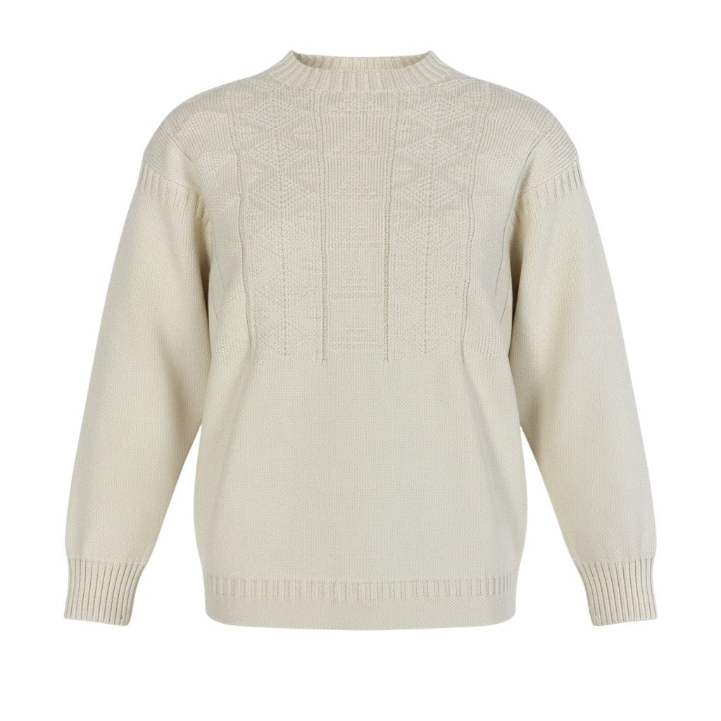 柔らかなアイボリー(生成り系)カラーが特徴の、Maison Margielaのニットセーターです。 全体にアラン(フィッシャーマン)調の立体的な編み柄が施され、存在感のあるデザインに仕上がっています。 素材はざっくりとしたマットなウールニットで、温かみと奥行きのある表情が魅力。 デニムやスラックスと合わせるだけで、マルジェラらしいモード感のあるカジュアルスタイルが完成する一着です。