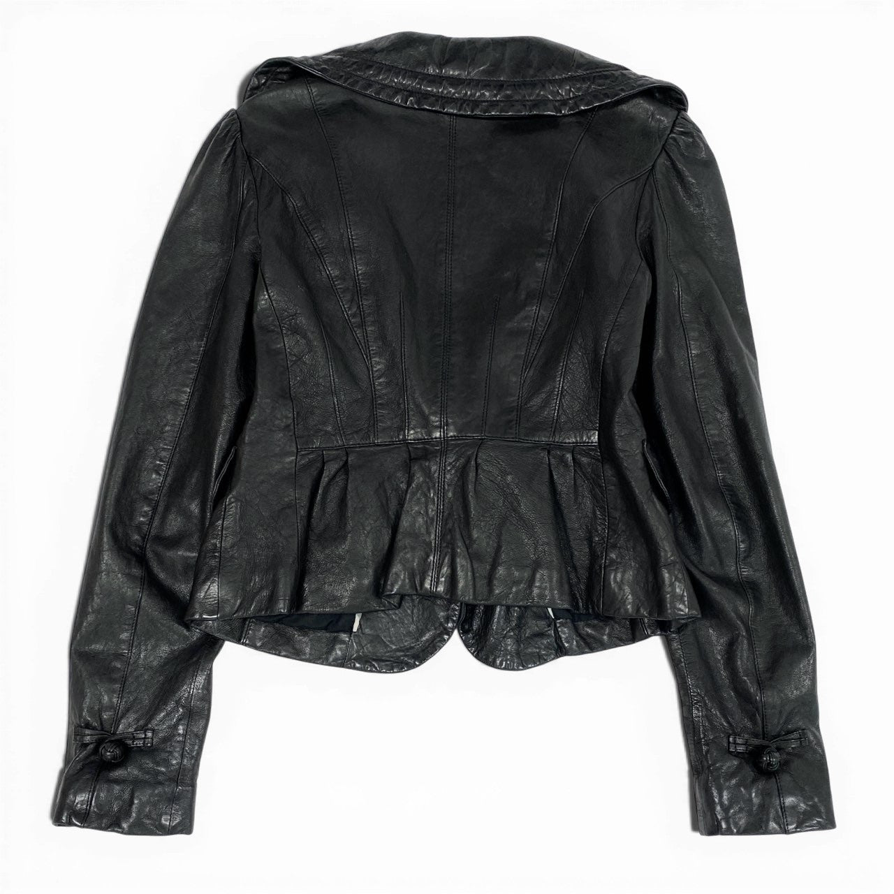 深みのあるブラックレザーが映える、Armani Collezioniの2000年代ヴィンテージレザージャケットです。素材にはしなやかで艶のあるラムレザーを使用し、着込むほどに風合いが増します。フロントのトグル風留め具と立体的なラペルデザインが特徴で、アルマーニらしいエレガントさとモード感を両立。ワンピースや細身パンツと合わせれば、都会的で洗練されたスタイリングが完成する一着です。