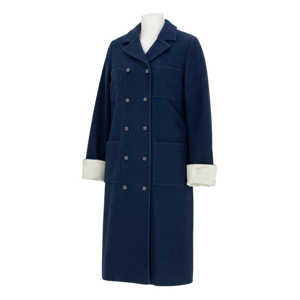 シャネルらしい上品さが漂う、ココマークボタンのダブルロングコートです。インディゴ調のネイビーに、袖裏のCC刺繍入りカフスがさりげなくアクセントとなり、袖を折って着るだけでスタイリングに華やぎをプラス。マットな質感の生地が体に馴染み、女性らしいシルエットを美しく引き立てます。ワンピースやデニム合わせまで対応でき、日常から特別なシーンまで活躍する一着です。