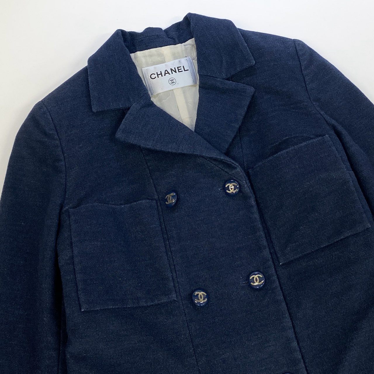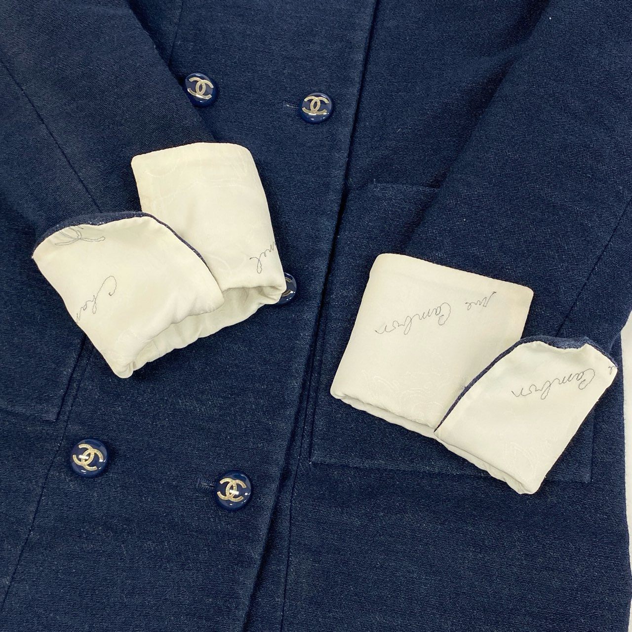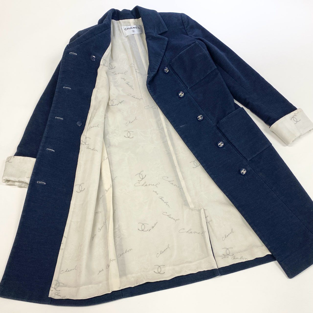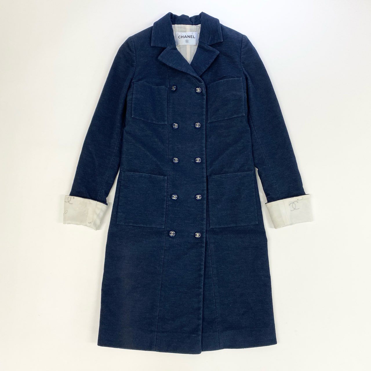 16k10 CHANEL シャネル ココマーク ダブルロングコート P53419V38061 34 インディゴ ブルー デニム 裏地刺繍t18r