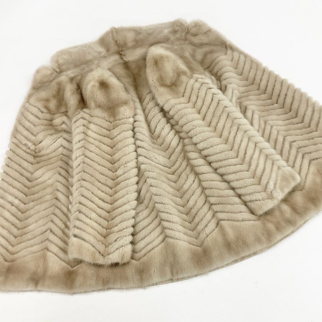 上品なホワイト系カラーのパールミンク毛皮コートで、柔らかな光沢と滑らかな毛並みが魅力の一着です。身頃にはヘリンボーン調(V字状)の切り替えパターンが施され、立体感と高級感を演出します。素材は毛足が細かくしなやかなリアルミンクで、軽やかな着心地と高い保温性を兼ね備えています。ワンピースやエレガントなパンツスタイルと相性が良く、会食・観劇・冬のフォーマルなお出かけにおすすめです。