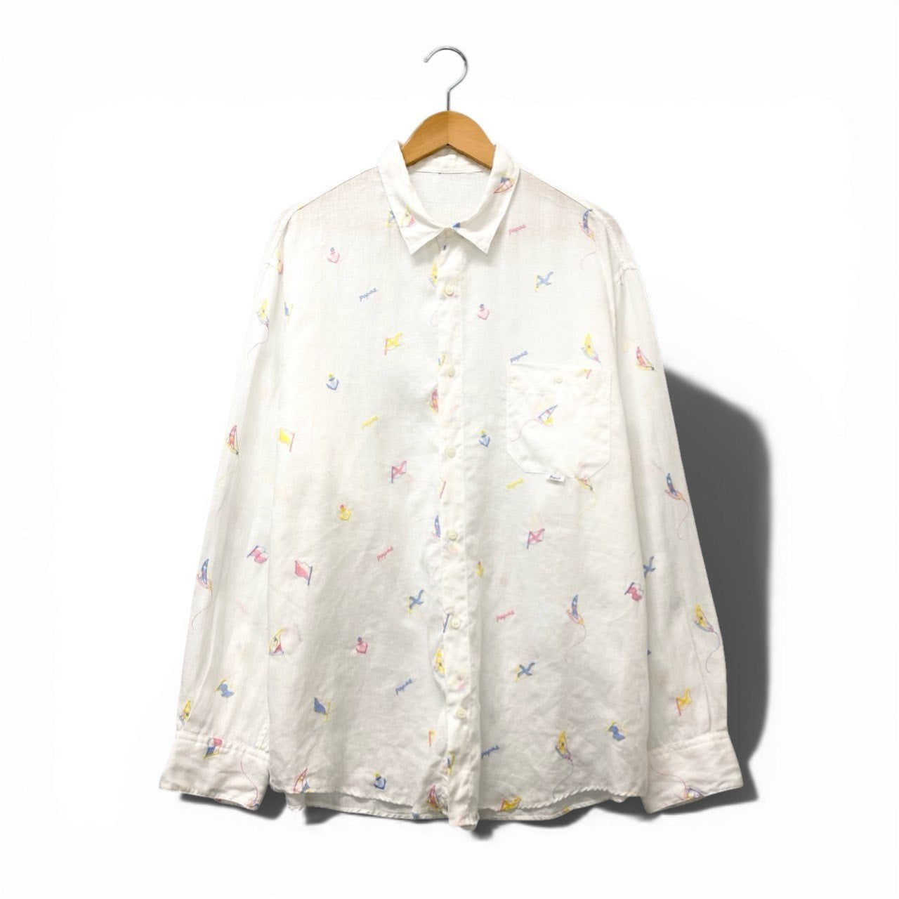 Papas の長袖リネンシャツです。カラーは爽やかなホワイトで、全体にはカラフルな小さな刺繍モチーフ(総柄風デザイン)が散りばめられています。素材は通気性の良いナチュラルなリネン(麻100%)生地で、軽やかな着心地が特徴です。ゆったりとしたシルエットで、デニムやチノパンと合わせたリラックスカジュアルスタイルにおすすめの一着です。