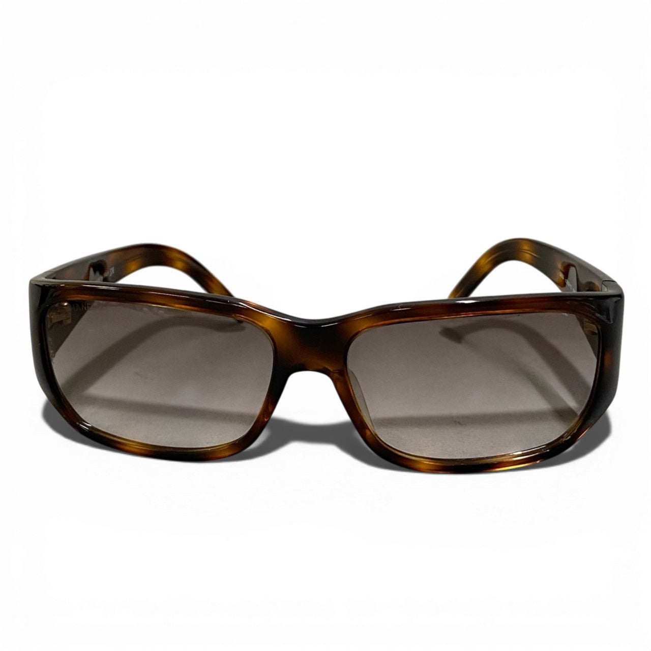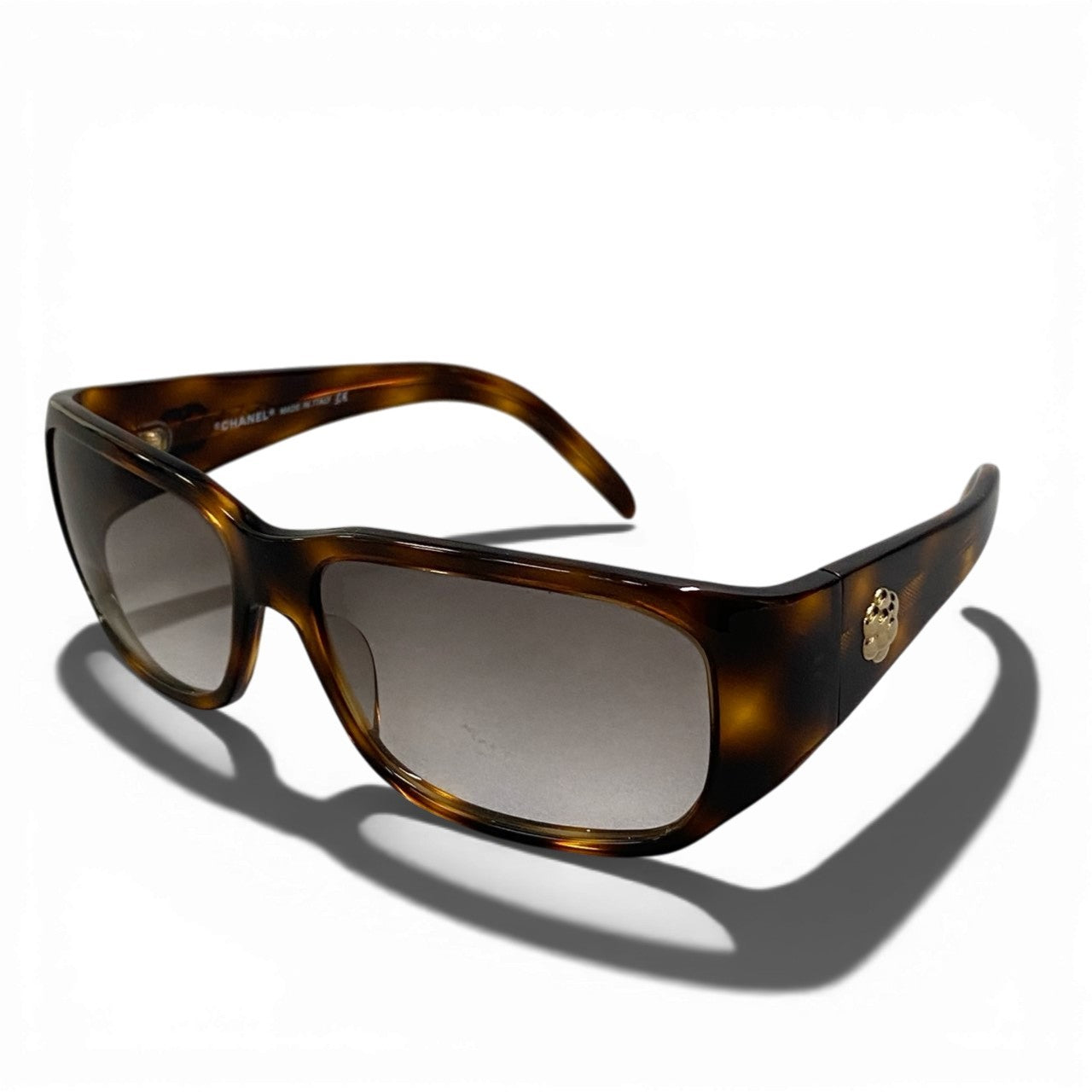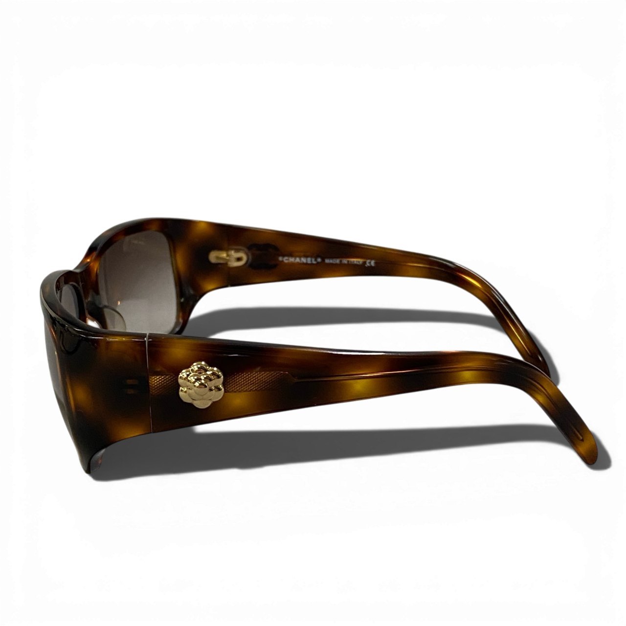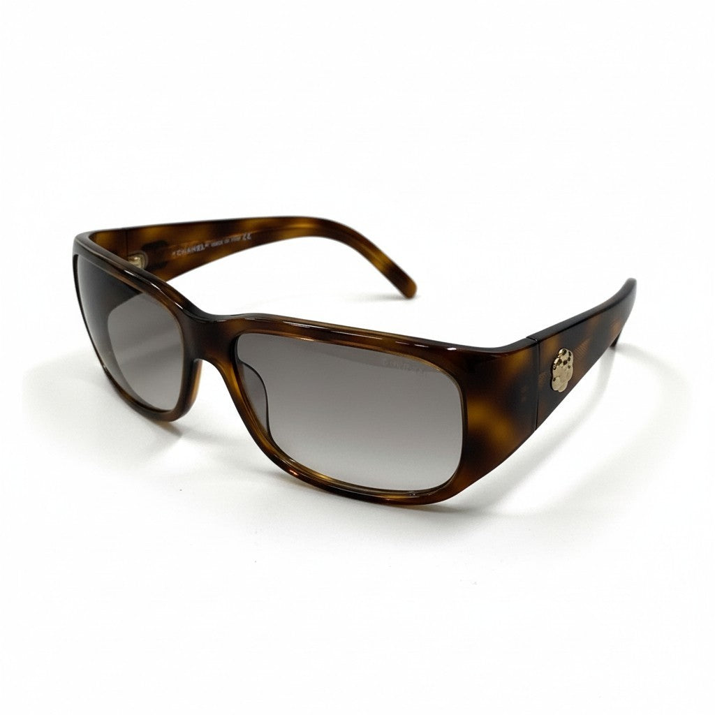 艶感のあるブラウンデミ(べっ甲調)アセテートフレームに、グレーのスモークグラデーションレンズを合わせたシャネルのサングラスです。テンプルにはゴールドカラーのココマークメタルロゴをあしらい、シンプルながら上品なアクセントをプラス。光沢のある滑らかな素材感が高級感を引き立て、横長のスクエアシルエットが大人の洗練された印象を演出します。デイリーコーデからリゾートスタイルまで幅広く活躍する一本です。