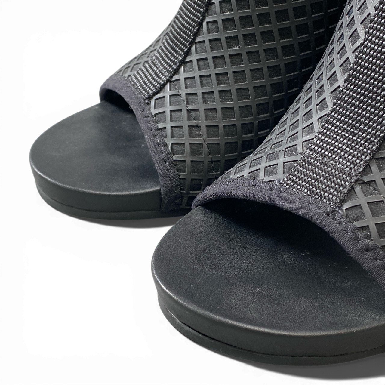 立体的な格子状パターンが印象的な、UNITED NUDEのヒールサンダルです。 マットなブラックカラーに、メッシュ調の素材感とテープディテールがモードな雰囲気を演出。 オープントゥと程よい高さのヒール設計で、デザイン性と歩きやすさを両立しています。 シンプルなコーディネートのアクセントとして、都会的なカジュアルスタイルや旅行シーンにも活躍する一足です。