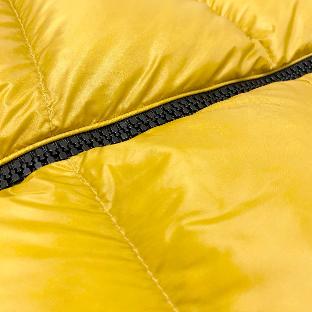 鮮やかなマスタードイエローの光沢ナイロンが目を引く、MONCLERのダウンジャケットです。高い保温性を保ちながらも軽量で、ふっくらとしたボリュームフードが特徴的。ブラックのジップテープと太幅ドローコードがアクセントになり、スポーティで都会的な印象を演出します。冬の街着からアウトドアシーンまで、スタイリングの主役として活躍する一着です。