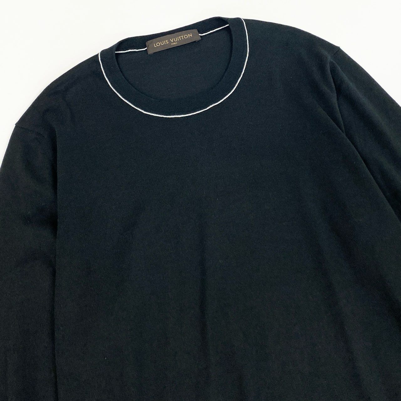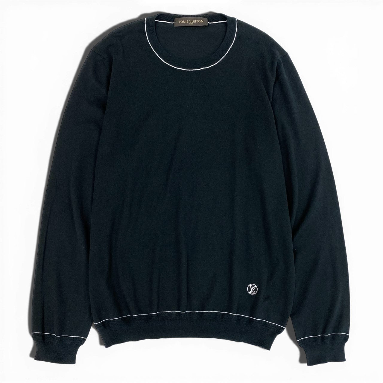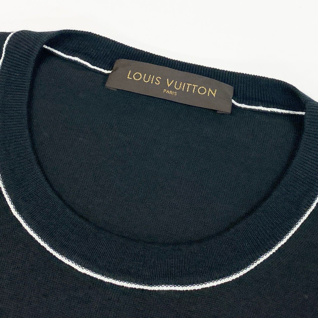 ブラックカラーを基調に、ネックラインや袖口、裾に施されたホワイトステッチが映えるルイヴィトンのニットセーターです。胸元にはさりげないLVロゴ刺繍があしらわれ、主張しすぎない上品なアクセントになっています。素材はマットで滑らかなニット地で、落ち着いた高級感のある印象です。カジュアルからきれいめまで幅広く合わせやすく、日常使いにもおすすめの一着です。