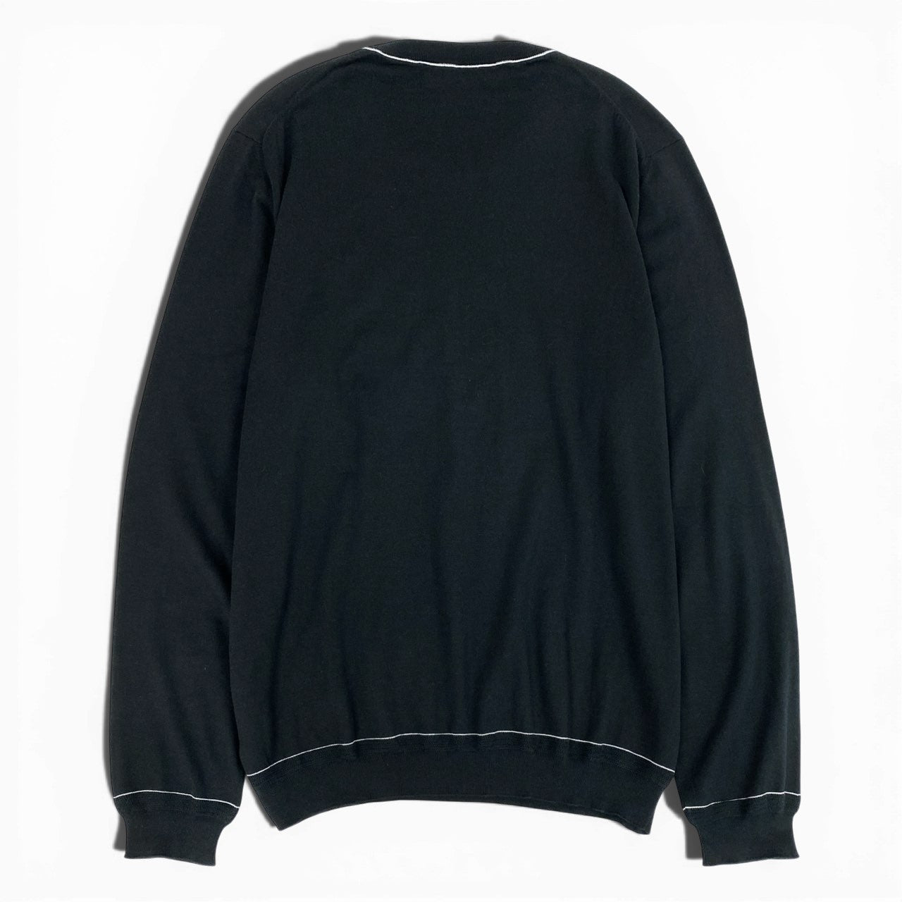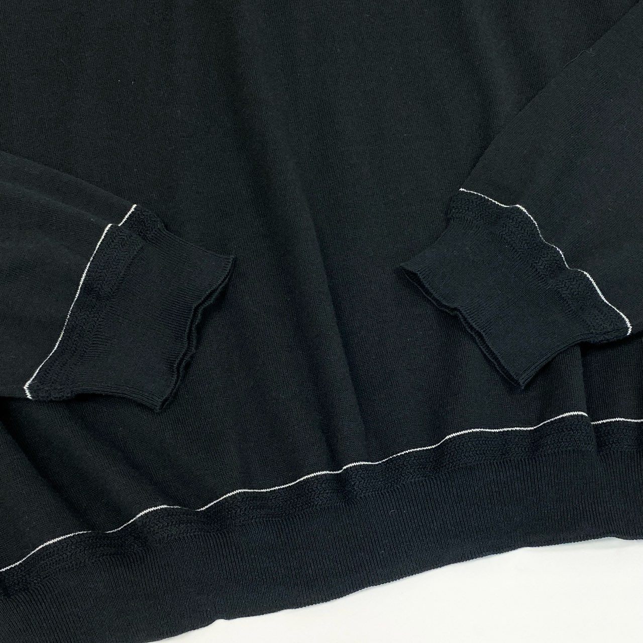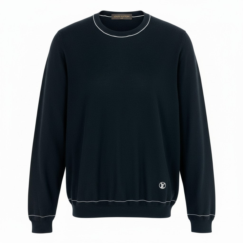 ブラックカラーを基調に、ネックラインや袖口、裾に施されたホワイトステッチが映えるルイヴィトンのニットセーターです。胸元にはさりげないLVロゴ刺繍があしらわれ、主張しすぎない上品なアクセントになっています。素材はマットで滑らかなニット地で、落ち着いた高級感のある印象です。カジュアルからきれいめまで幅広く合わせやすく、日常使いにもおすすめの一着です。