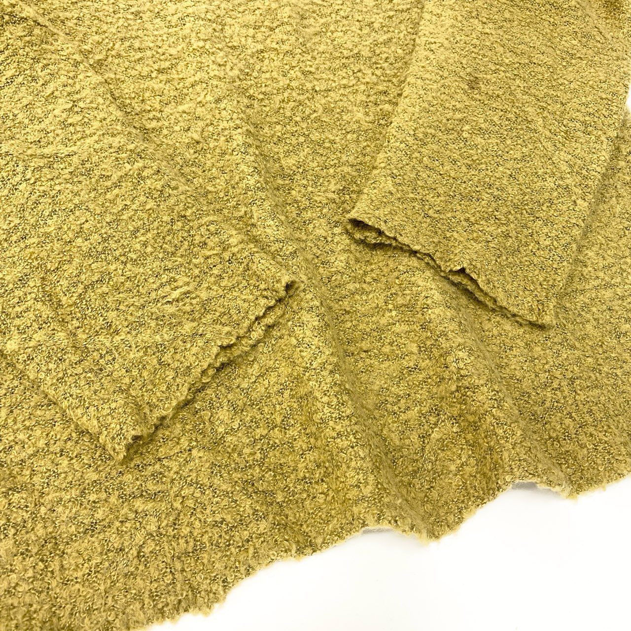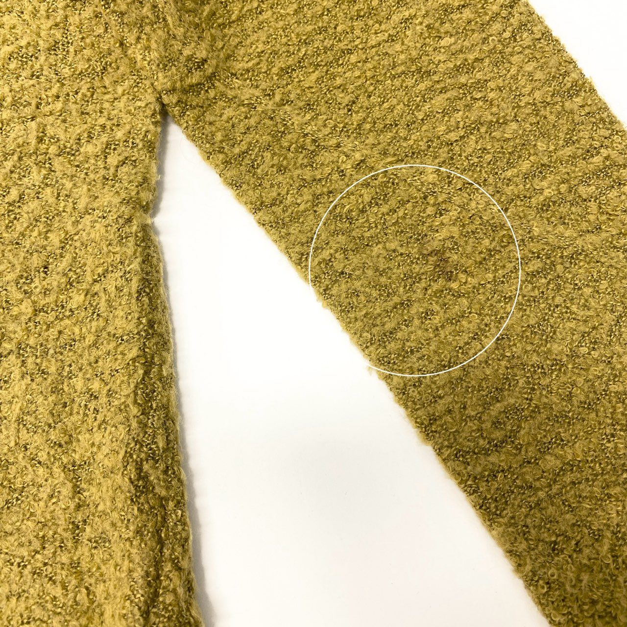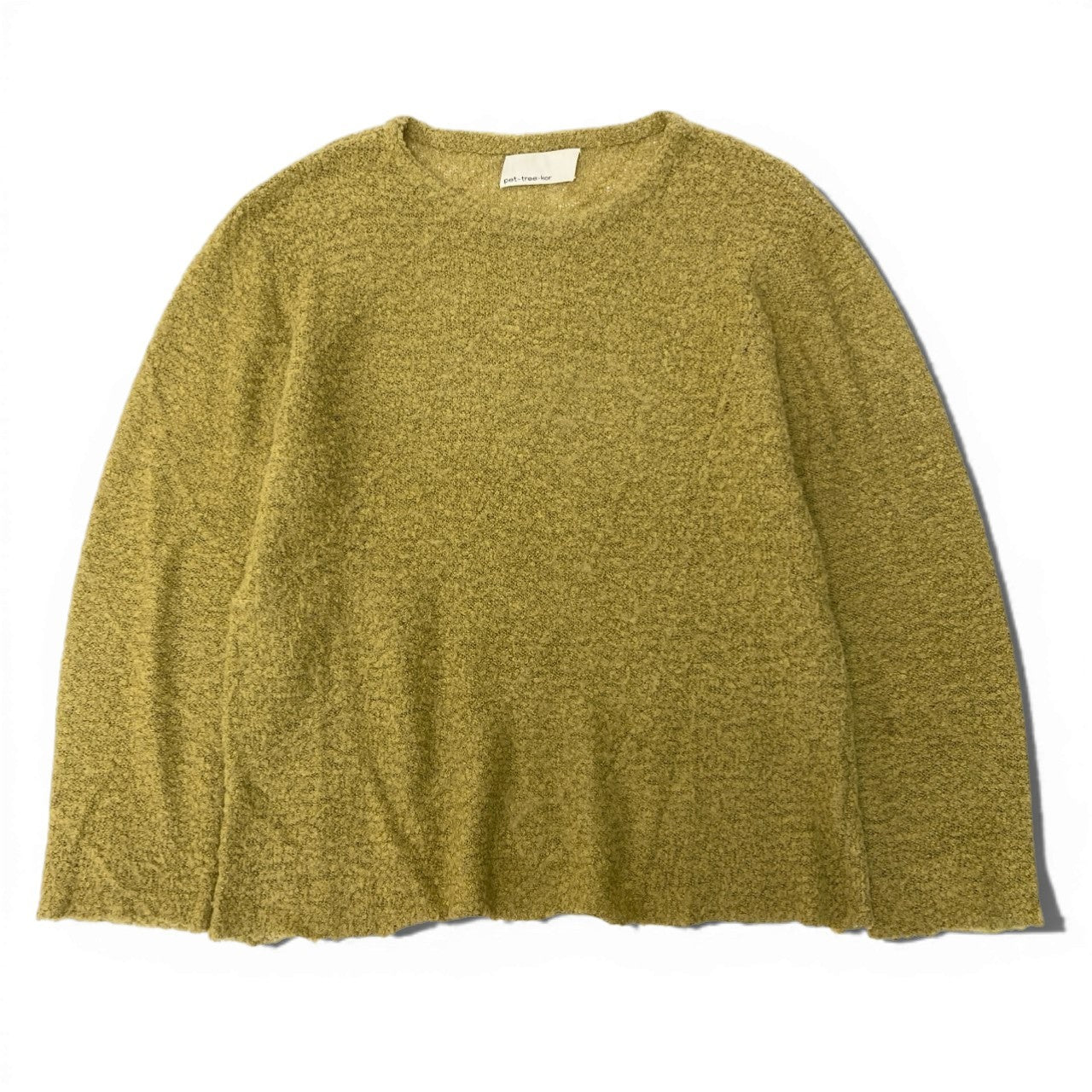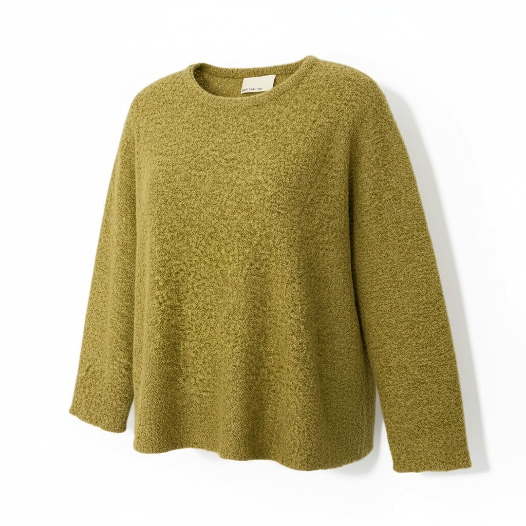 落ち着いたマスタードイエロー(くすみイエロー系)の無地ニットです。 毛足感のあるブークレ調素材で、ふんわりとした起毛感があり温かみのある印象。 シンプルなクルーネック仕様で、装飾のないミニマルデザイン。 デニムやスラックスとの相性も良く、秋冬のカジュアルスタイルに取り入れやすい一着です。