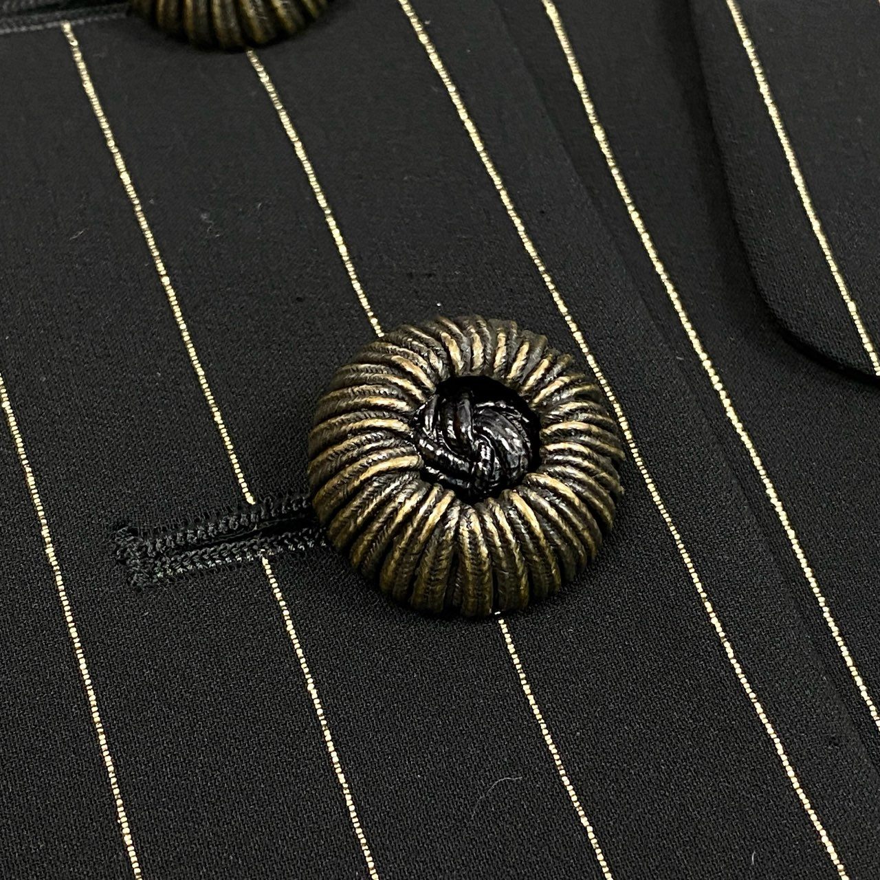 ミッドナイトブラックをベースに細かなピンストライプが入った、Vintage Christian Diorの上品なセットアップスカートです。マットで張りのあるウール系素材感に、ダブルブレスト仕様と装飾ボタンがクラシカルな存在感を演出します。ノーカラーに近いVゾーンがすっきりとした印象で、女性らしさとマニッシュさを両立したデザインです。単体使いはもちろん、セットアップとして式典やビジネス、きちんと感が求められるシーンにおすすめの一着です。