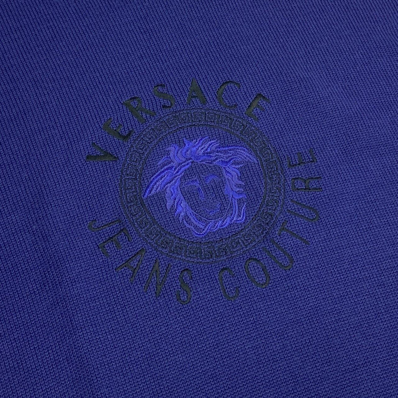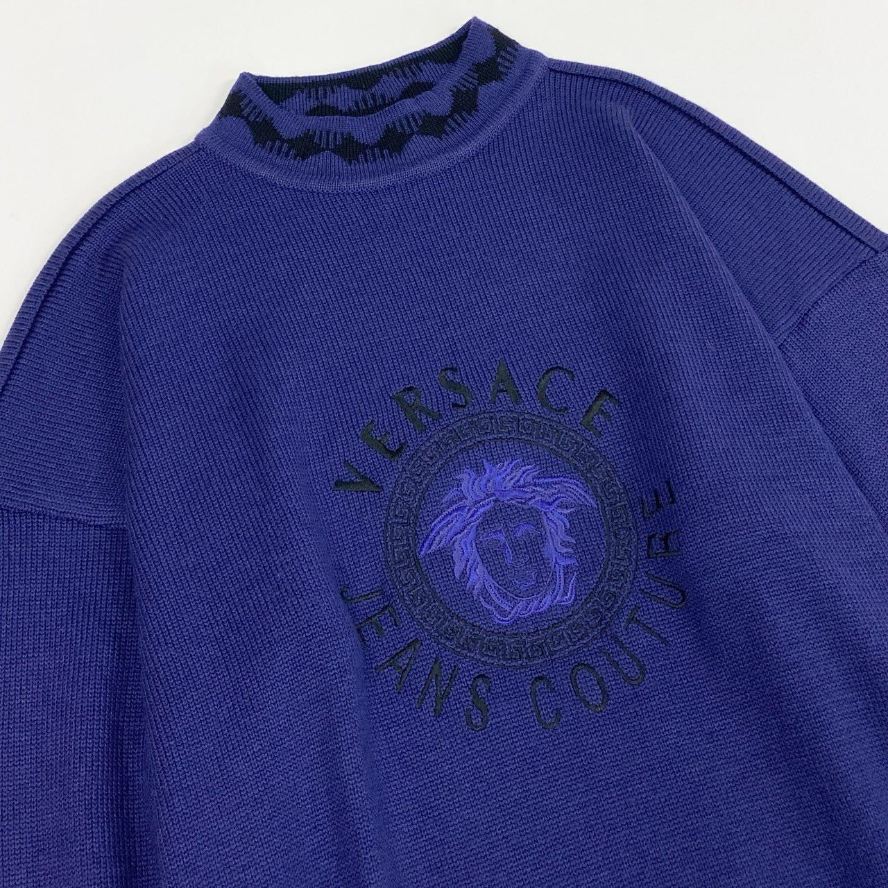 深みのあるパープルが印象的な、Versaceのヴィンテージニットです。フロントにはメデューサモチーフを配した立体的なロゴデザインが施され、ブランドらしい存在感を放ちます。素材はしっかりと編み立てられたマットなニットで、首元はボトルネック仕様。デニムやスラックスと合わせるだけで、90〜00年代らしいモード×ストリート感のあるスタイリングが完成する一着です。