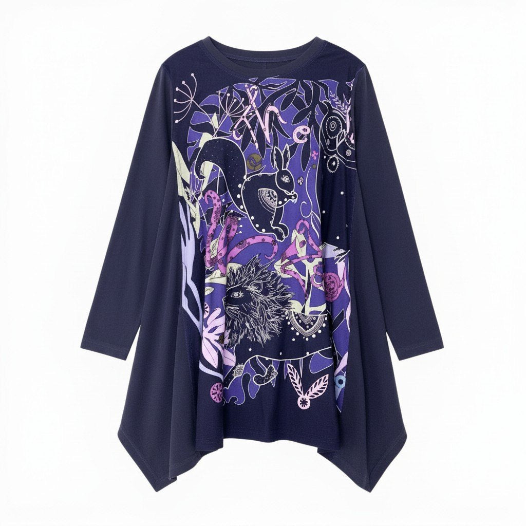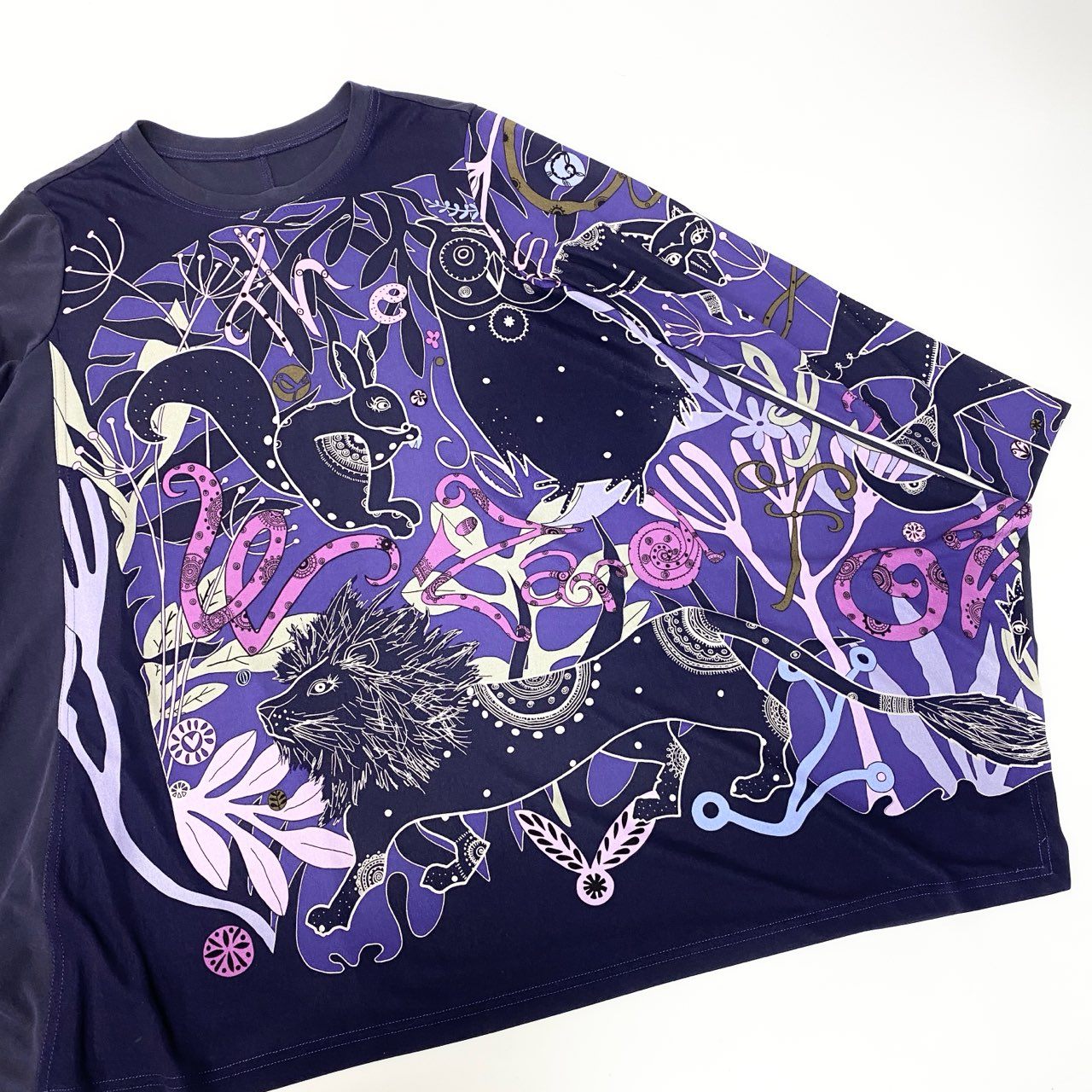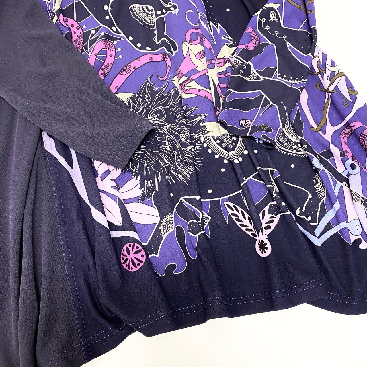 ミッドナイトネイビー〜パープル系カラーをベースに、幻想的なアニマルモチーフとボタニカル柄が大胆に描かれたトクコプルミエヴォルらしいアート感あふれるチュニックワンピースです。ライオンやカンガルーなどの動物モチーフと星や植物のイラストが組み合わされた個性的なデザインが印象的。マットな質感のストレッチ生地で着心地も柔らかく、リラックス感のあるAラインシルエットが魅力です。アシンメトリーな裾デザインが動きのあるシルエットを演出します。パンツやレギンスと合わせたレイヤードスタイルにもおすすめの一着です。
