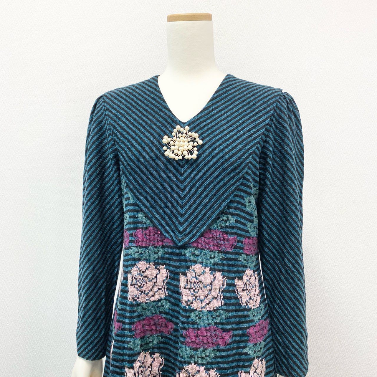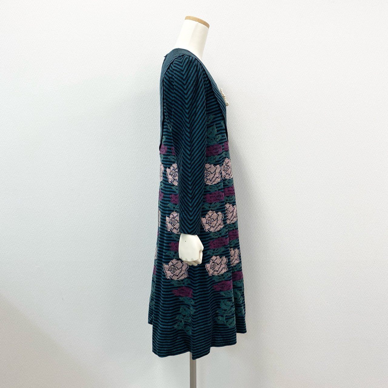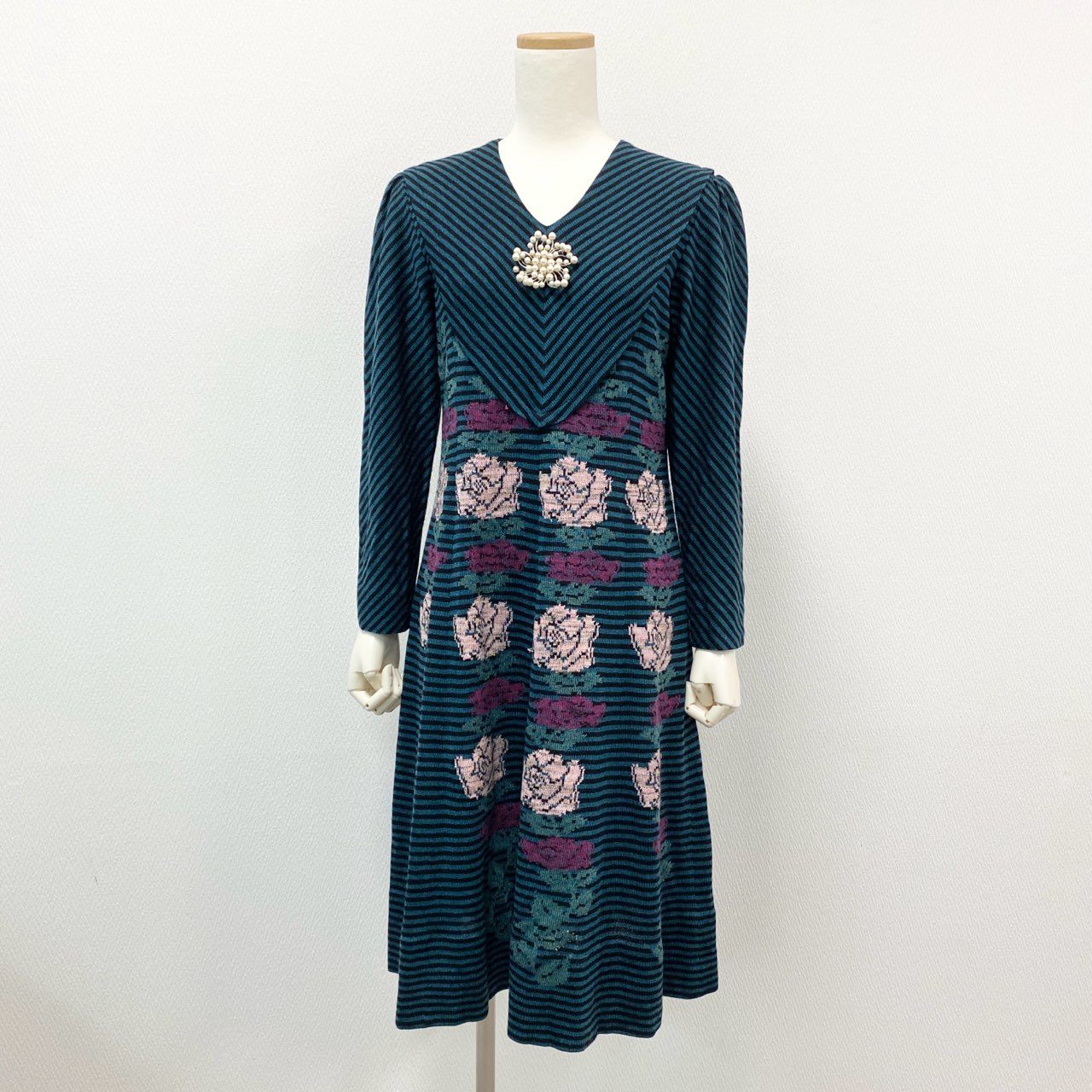 ディープグリーンに近いベースカラーにブラックのボーダーを重ね、フロントには淡いピンクとパープルのフラワーモチーフをあしらった華やかなニットワンピースです。立体的なブローチ風装飾とV字切替デザインが印象的で、縦ラインを強調しスタイルアップ効果も期待できます。柔らかなニット素材により動きやすく、フレアシルエットが上品さを演出。特別なお出かけやフォーマル寄りのシーンにもマッチし、1枚で存在感を放つアイテムです。