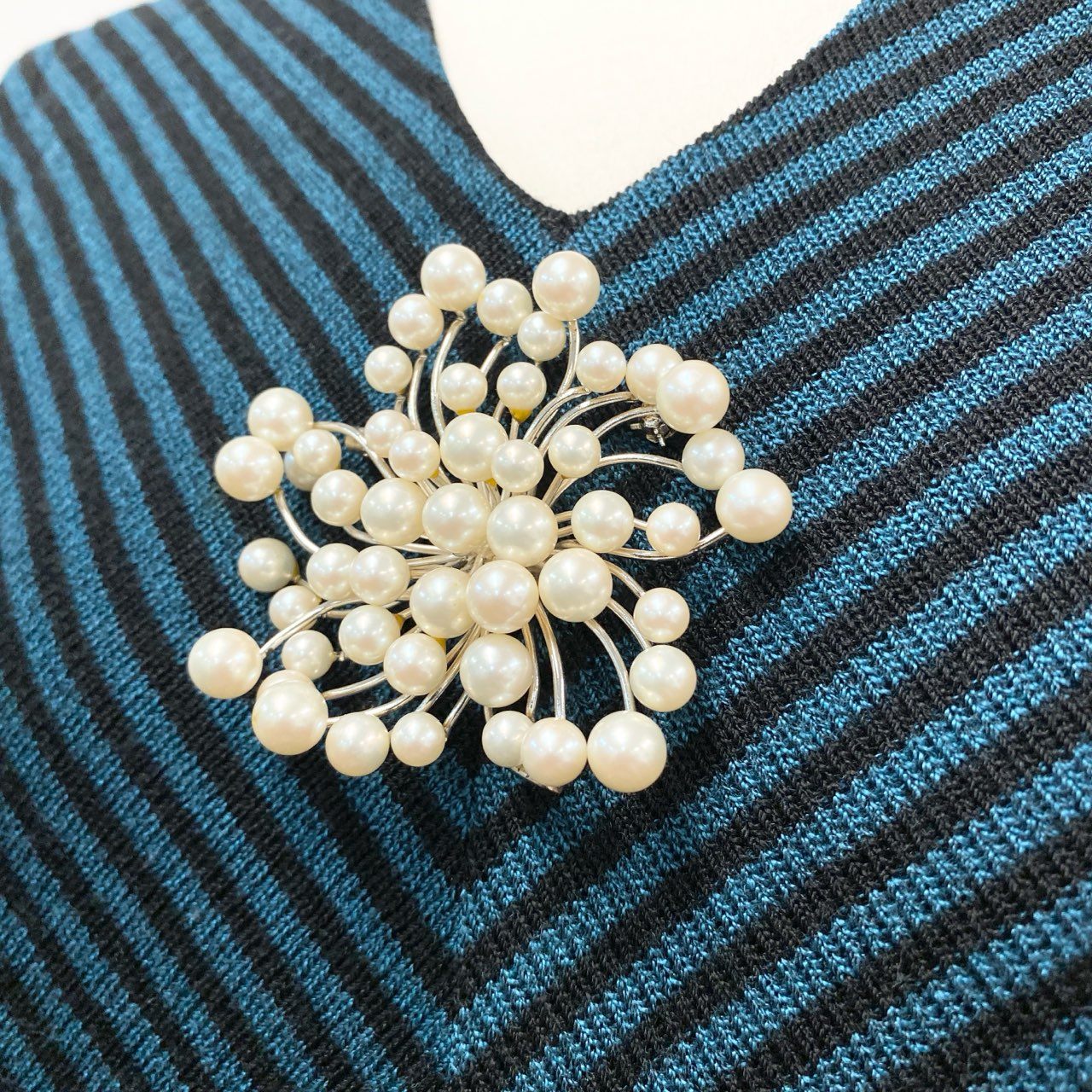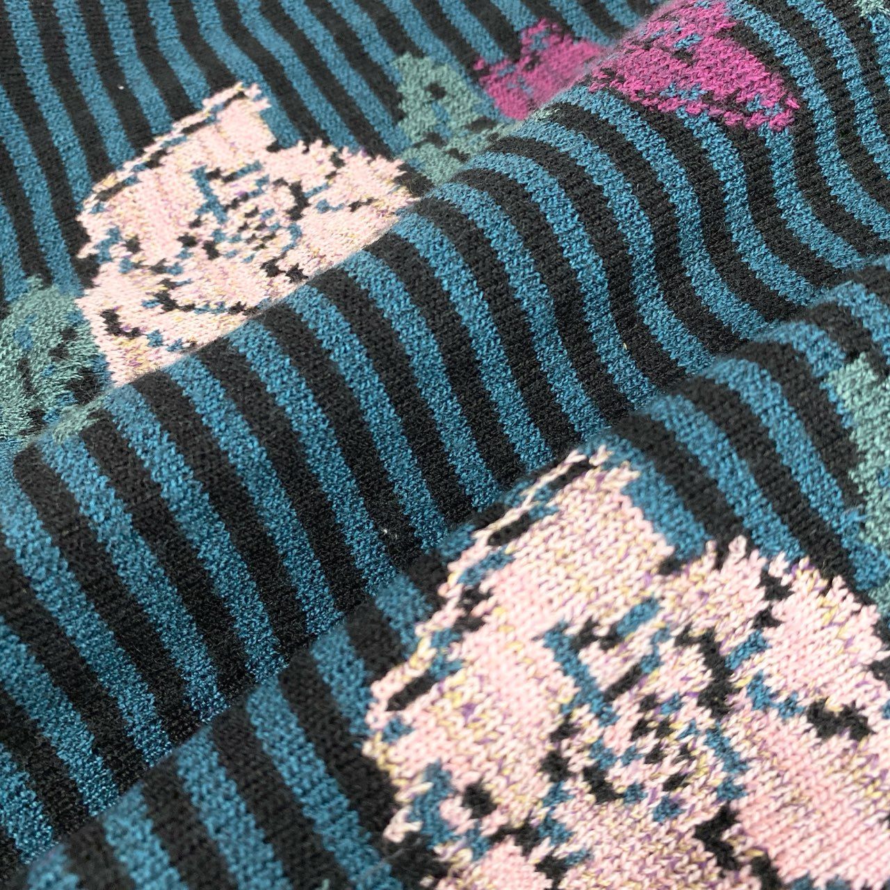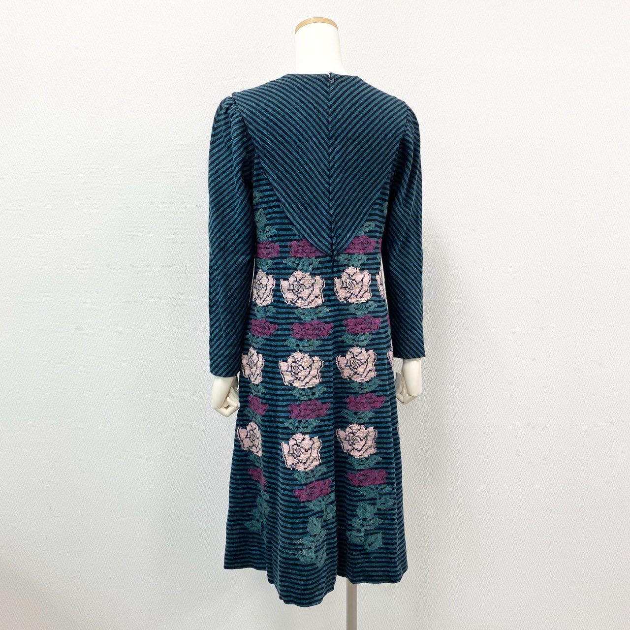 ディープグリーンに近いベースカラーにブラックのボーダーを重ね、フロントには淡いピンクとパープルのフラワーモチーフをあしらった華やかなニットワンピースです。立体的なブローチ風装飾とV字切替デザインが印象的で、縦ラインを強調しスタイルアップ効果も期待できます。柔らかなニット素材により動きやすく、フレアシルエットが上品さを演出。特別なお出かけやフォーマル寄りのシーンにもマッチし、1枚で存在感を放つアイテムです。
