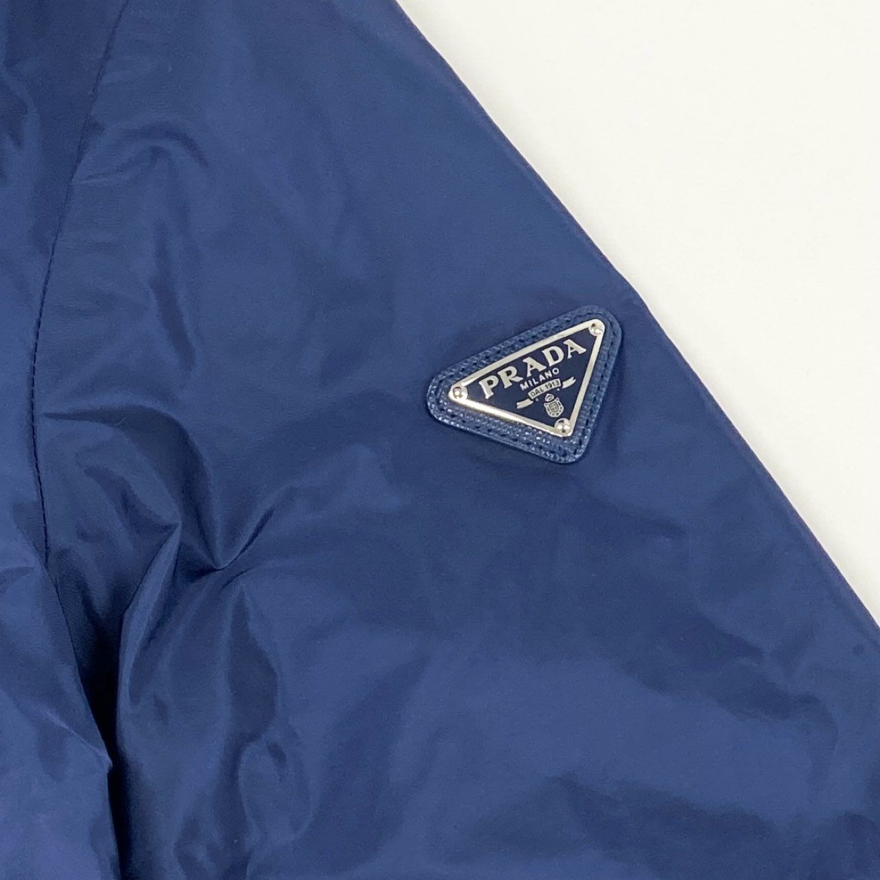 PRADAのフーデッドジップジャケットは、ミッドナイトネイビーの落ち着いた色合いが上品な一着です。 フード付きのフルジップ仕様に加え、メタルジップと袖のトライアングルロゴがさりげないアクセントになっています。 カジュアルからきれいめまで幅広く合わせやすく、季節の変わり目やデイリーユースに活躍するPRADAらしい洗練アウターです。
