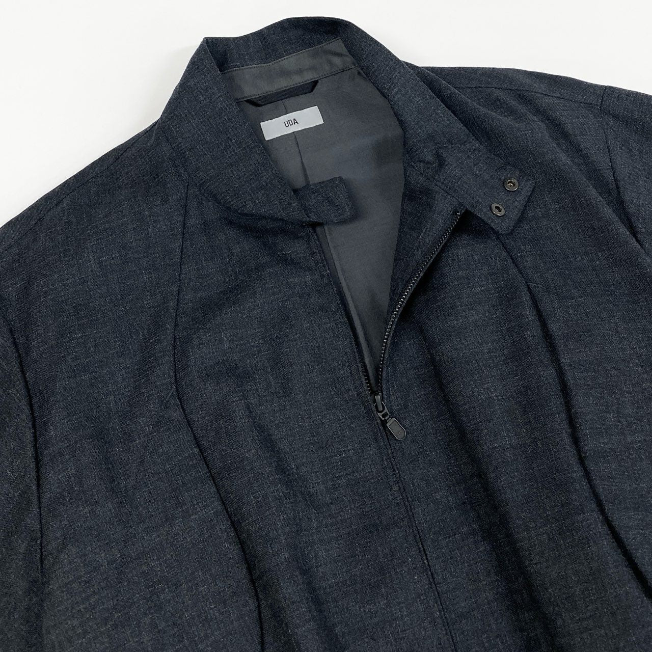 UDAのジップアップブルゾン「U-B-001」は、深みのあるネイビーカラーを採用したスイングトップ型の一着です。マットなコットンライク素材をベースに、丸みを帯びたフロントの切り替えデザインとドローコード付きのスタンドカラーがアクセント。裾はゴム仕様で程よくフィットし、スポーティかつモードな雰囲気を演出します。シンプルながら洗練されたデザインで、カジュアルからきれいめコーデまで幅広く活躍するアイテムです。
