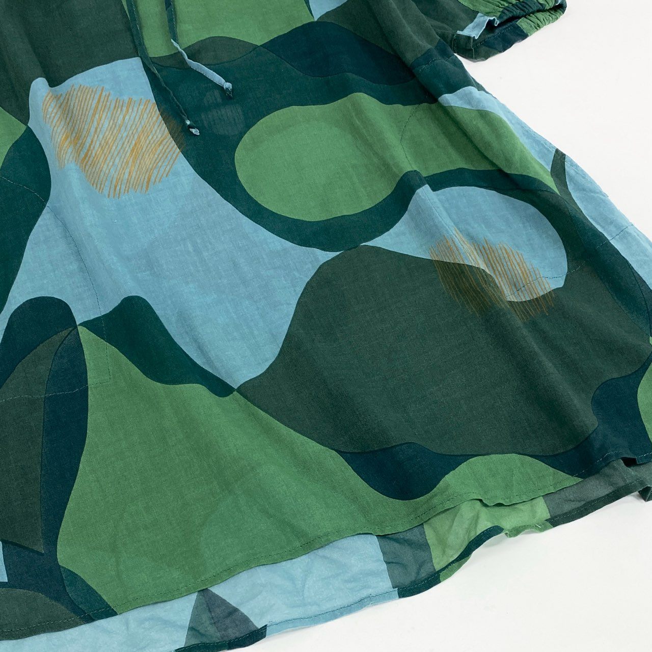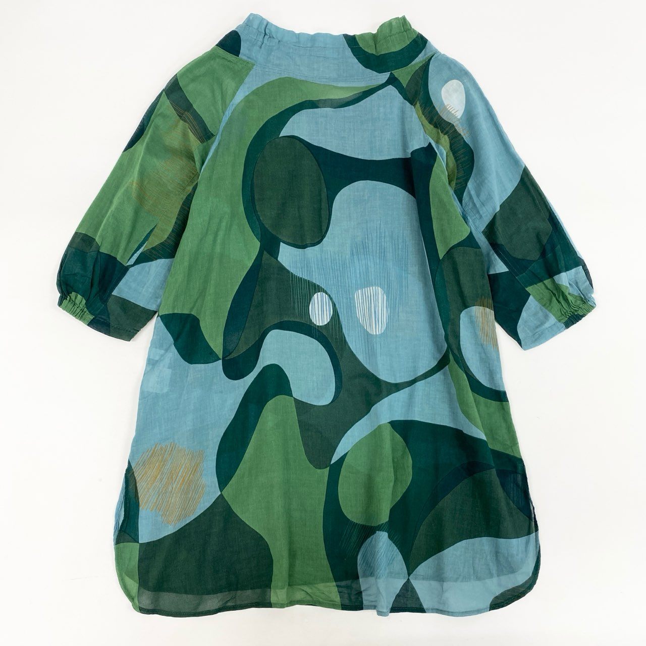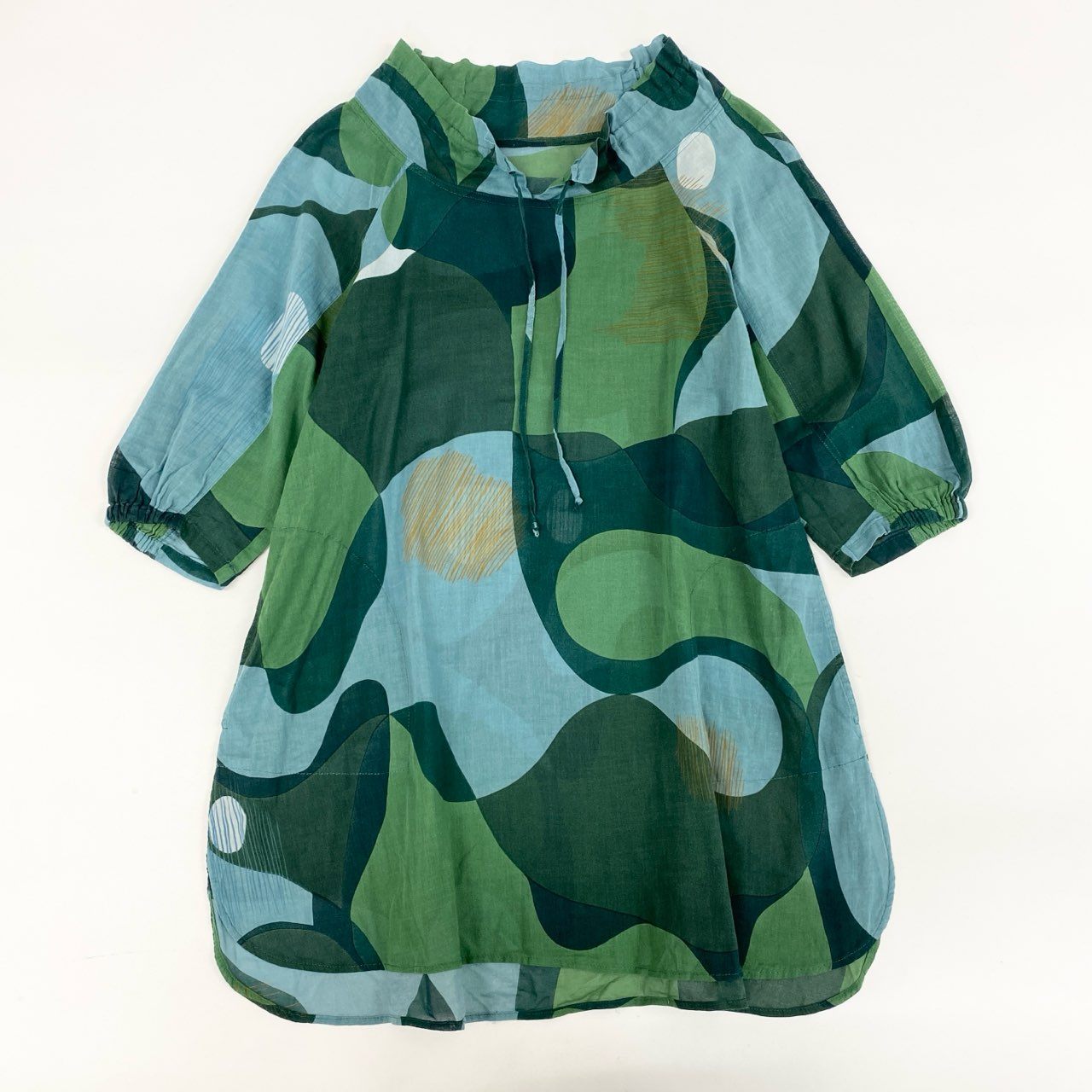 爽やかなグリーン×ライトブルー系の大胆なアート調総柄プリントが印象的な五分袖チュニック。 ナチュラルな風合いのコットン100%素材で、肌触りもやさしく通気性も抜群です。 ネックラインにはさりげないギャザーとリボン付きで、女性らしい柔らかさをプラス。 ゆったりしたシルエットで、レギンスやスリムパンツとの相性も◎ 一枚でスタイルが決まる、個性派アート好きにおすすめのアイテムです。