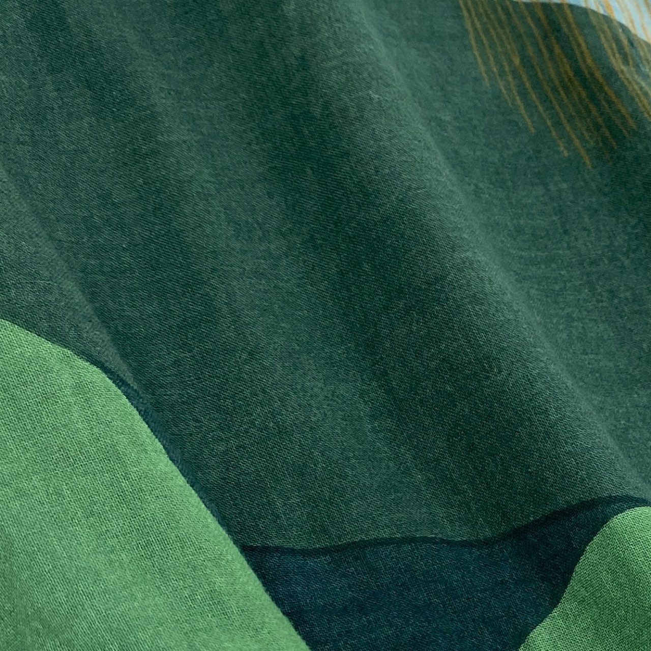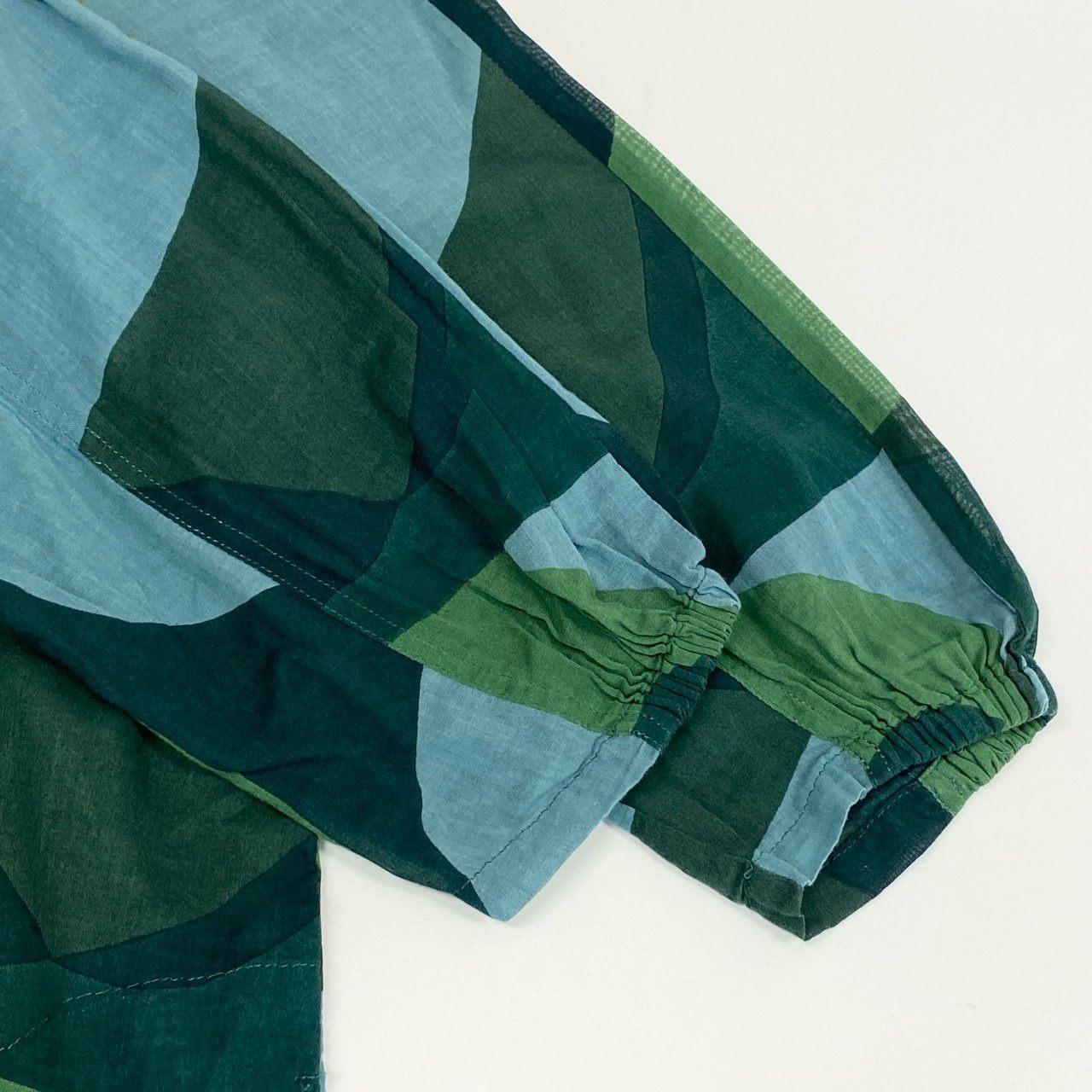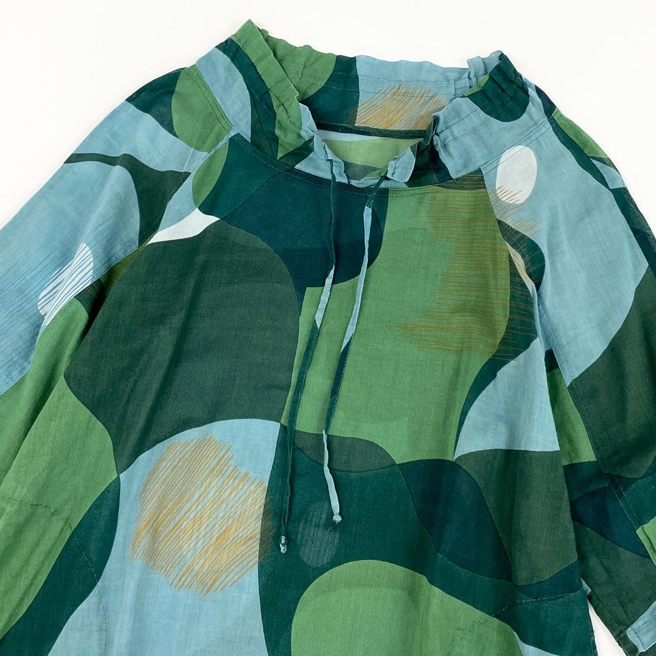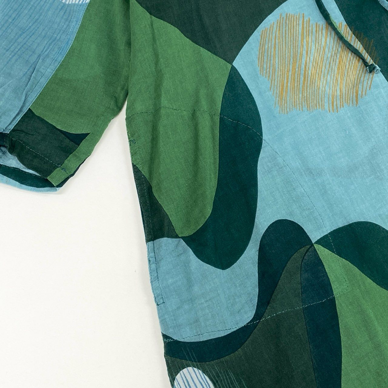 爽やかなグリーン×ライトブルー系の大胆なアート調総柄プリントが印象的な五分袖チュニック。 ナチュラルな風合いのコットン100%素材で、肌触りもやさしく通気性も抜群です。 ネックラインにはさりげないギャザーとリボン付きで、女性らしい柔らかさをプラス。 ゆったりしたシルエットで、レギンスやスリムパンツとの相性も◎ 一枚でスタイルが決まる、個性派アート好きにおすすめのアイテムです。