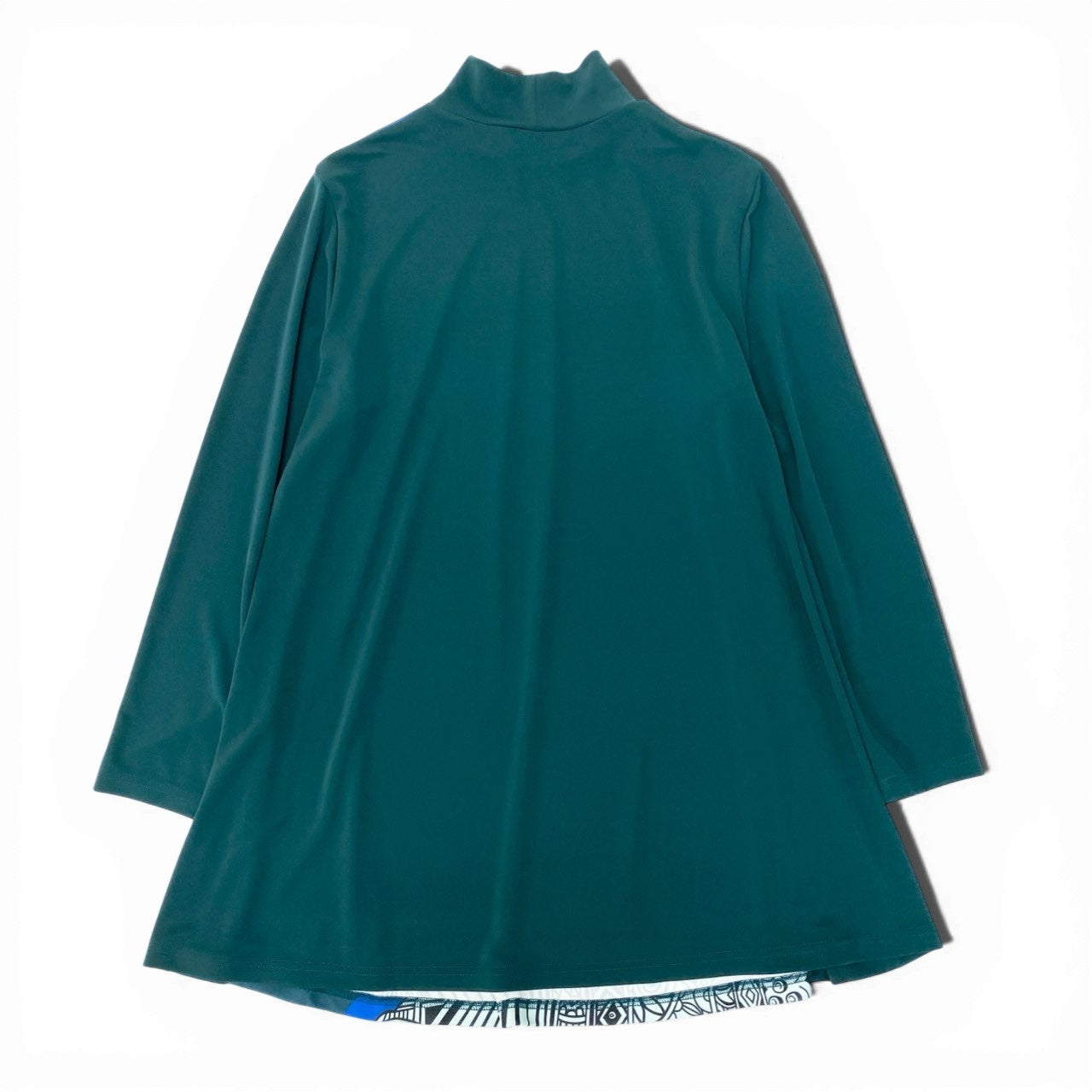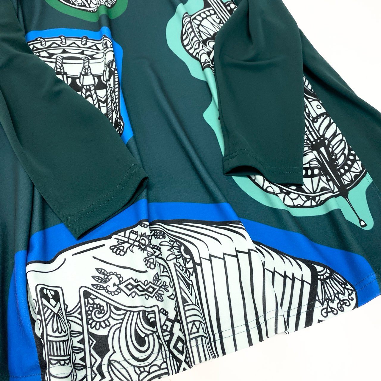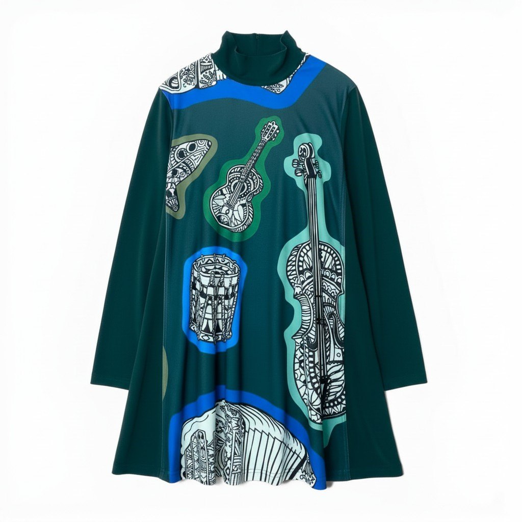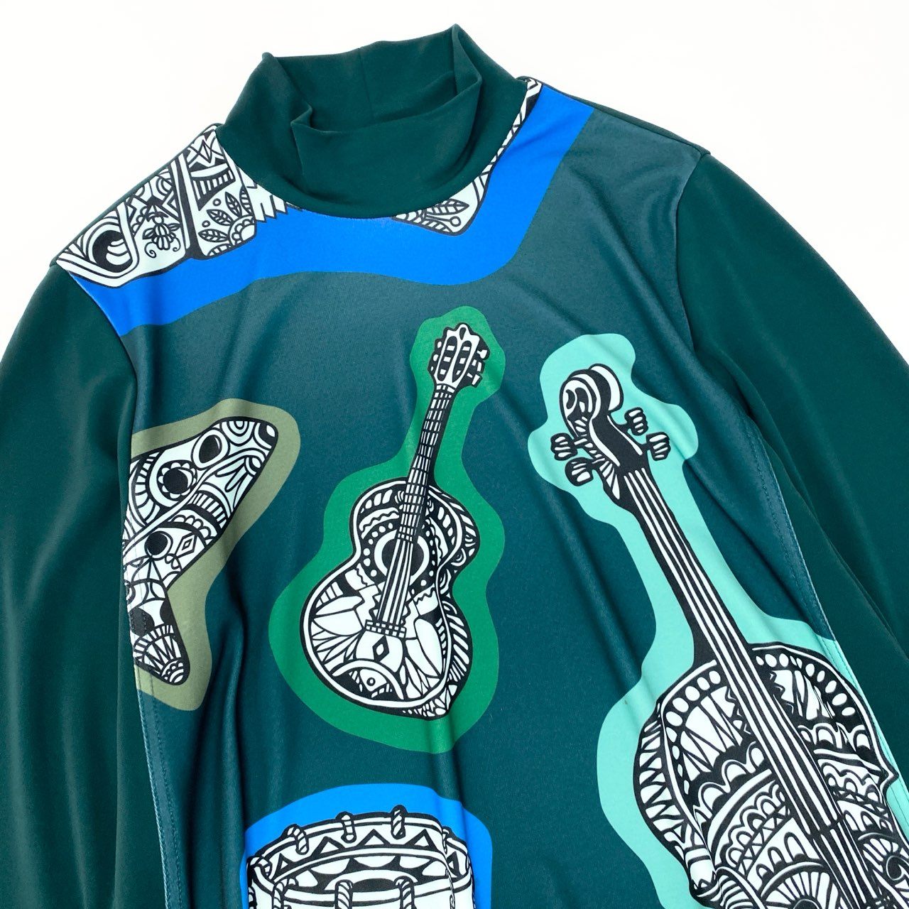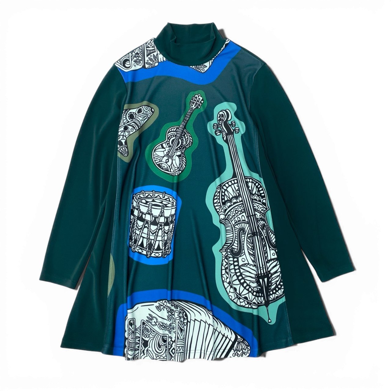 TOKUKO 1er VOLのハイネックチュニックワンピースです。深みのあるフォレストグリーンをベースに、コバルトブルーのラインとモノトーンの楽器柄プリントが映えるアート感あふれるデザイン。マットで落ち感のあるなめらかな素材感が上品な印象を演出します。裾に向かって広がるフレアシルエットで、パンツと合わせたレイヤードスタイルにもおすすめの一着です。