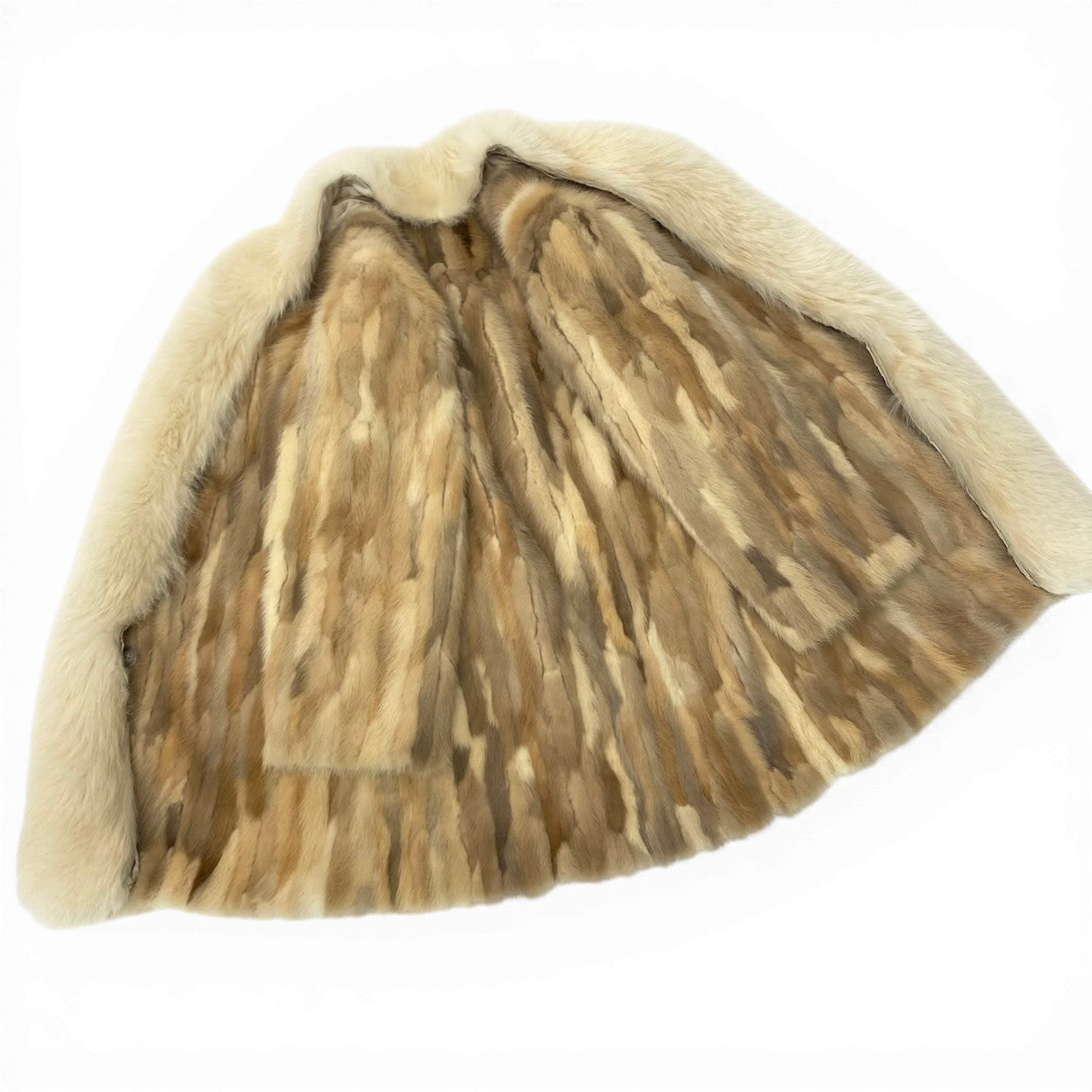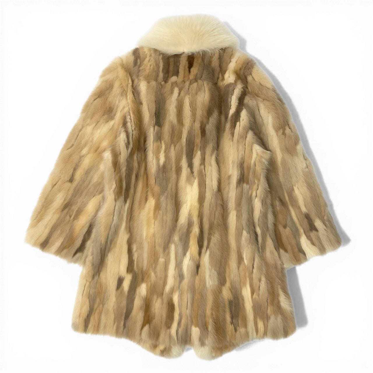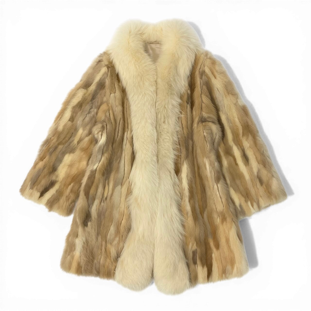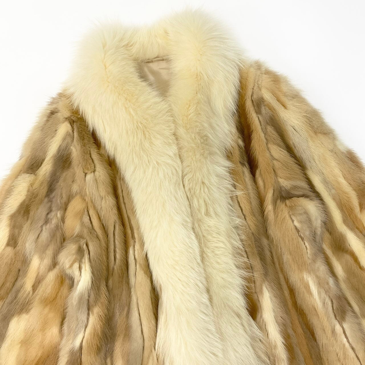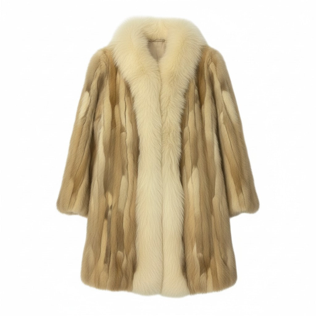 ベージュ〜キャメル系のグラデーションが美しい、毛足の長いファー素材のコートです。ナチュラルなまだら模様が特徴的で、柔らかく高級感のある質感が魅力です。ボリューム感のあるショールカラーが首元を華やかに演出し、防寒性も抜群です。羽織るだけで存在感があり、冬のコーディネートを格上げしてくれるラグジュアリーな一着です。