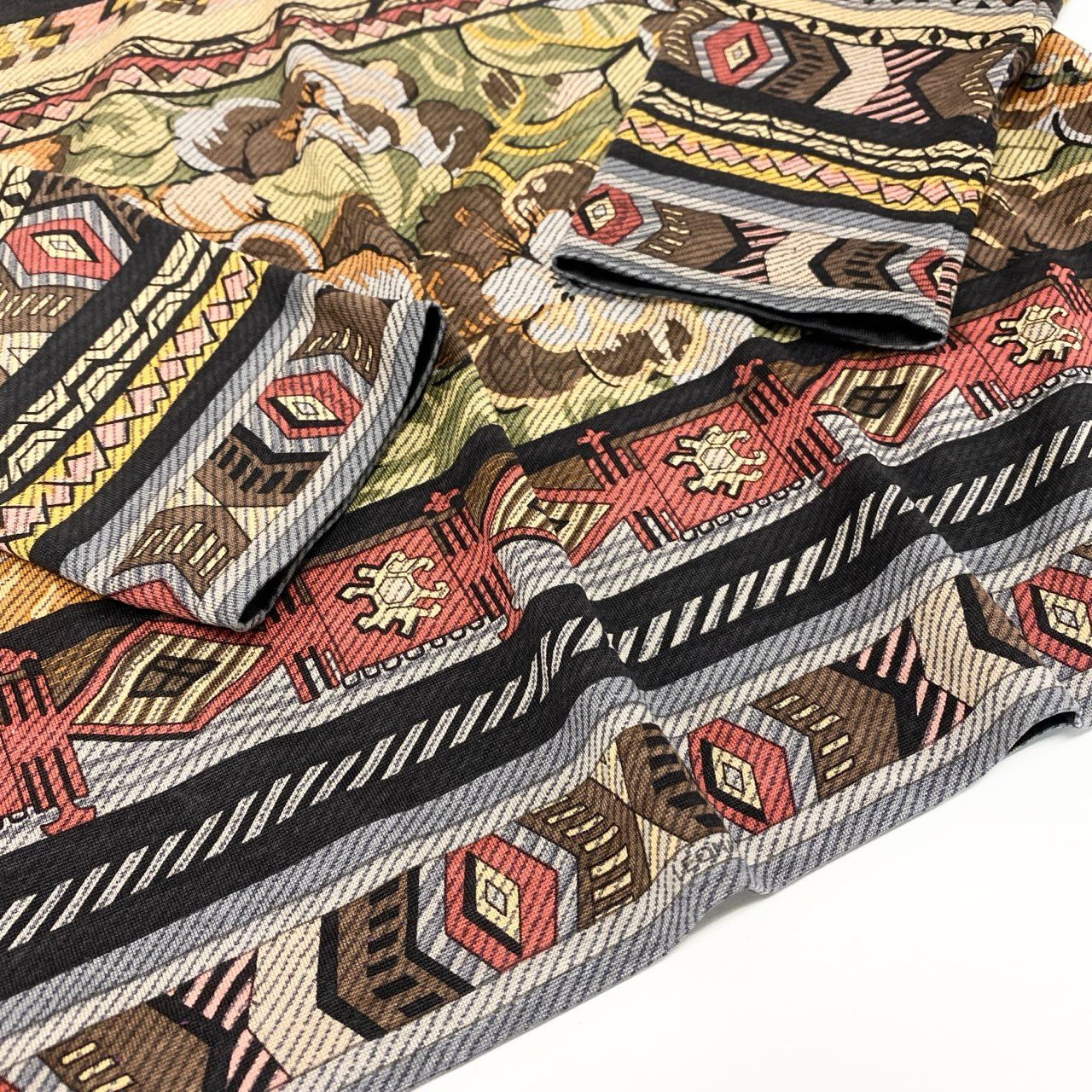 LEONARDらしい華やかな色彩と、エスニック柄×ボタニカル柄を組み合わせたマルチカラーデザインが特徴のモックネックカットソーです。ブラック・ベージュ・マスタード・カーキグリーン・ブラウンなど多彩な色が織り込まれ、表情豊かなパターンがスタイリングを引き立てます。滑らかなジャージー素材で肌あたりが良く、シーズンを問わず快適に着用できます。ジャケットのインナーや単体でのコーディネートにも映える一枚で、日常から外出シーンまで幅広く活躍します。デザイン性が高く、LEONARDらしい上品さをしっかり楽しめるアイテムです。