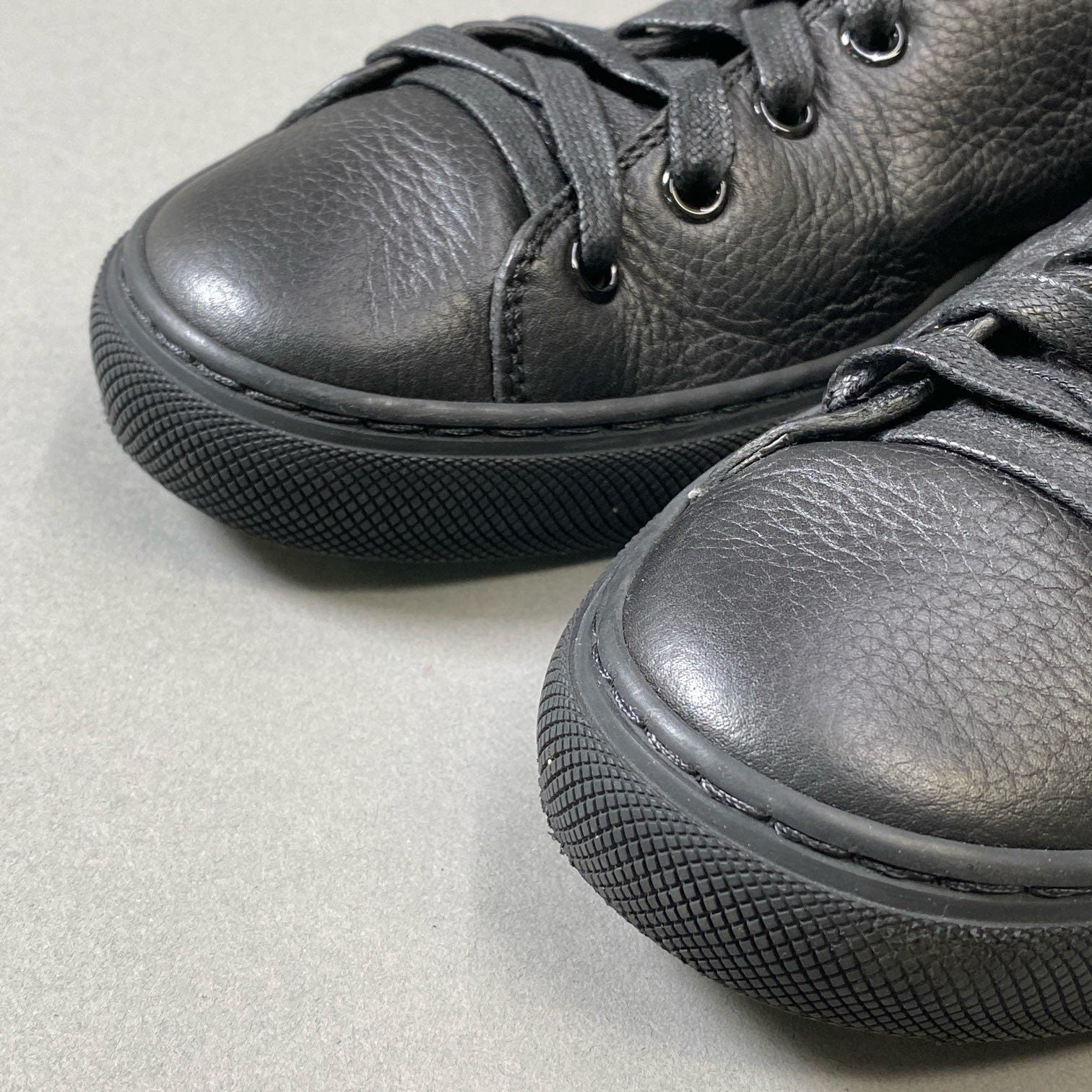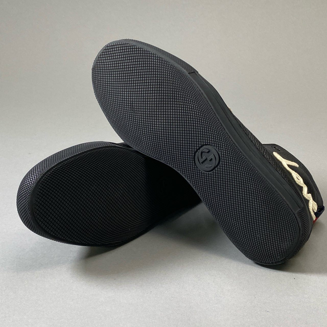 グッチのハイカットスニーカー「449992」、ブラックのシボ感あるグレインレザーを使用し、重厚感と高級感を兼ね備えています。サイドには立体的なホワイト刺繍ロゴが施され、遊び心あるアクセントに。さらにシュータン部分にはブランドを象徴するタイガーヘッドが配され、アイコニックな存在感を放ちます。シンプルながらもラグジュアリーな仕上がりで、デニムやモノトーンスタイルに合わせるだけで都会的な雰囲気を演出。カジュアルからモードな着こなしまで幅広く活躍する一足です。