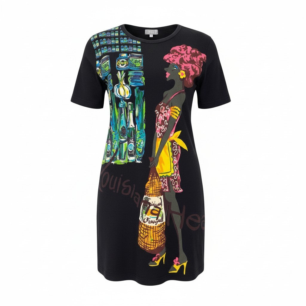 トクコプルミエヴォルらしい鮮やかなアートプリント(女性とボトルモチーフ)が大胆に施された半袖Tシャツワンピースです。ベースカラーは深みのあるダークパープル系で、ビビッドなプリントが映える華やかなデザイン。柔らかなコットン100%素材で着心地が良く、ゆったりとしたAラインシルエットが体型を拾わずデイリーに着用しやすい一枚です。1枚でワンピースとしてはもちろん、レギンスと合わせたチュニックスタイルにも最適。夏のお出かけやリゾート、アート好きな方におすすめのアイテムです。
