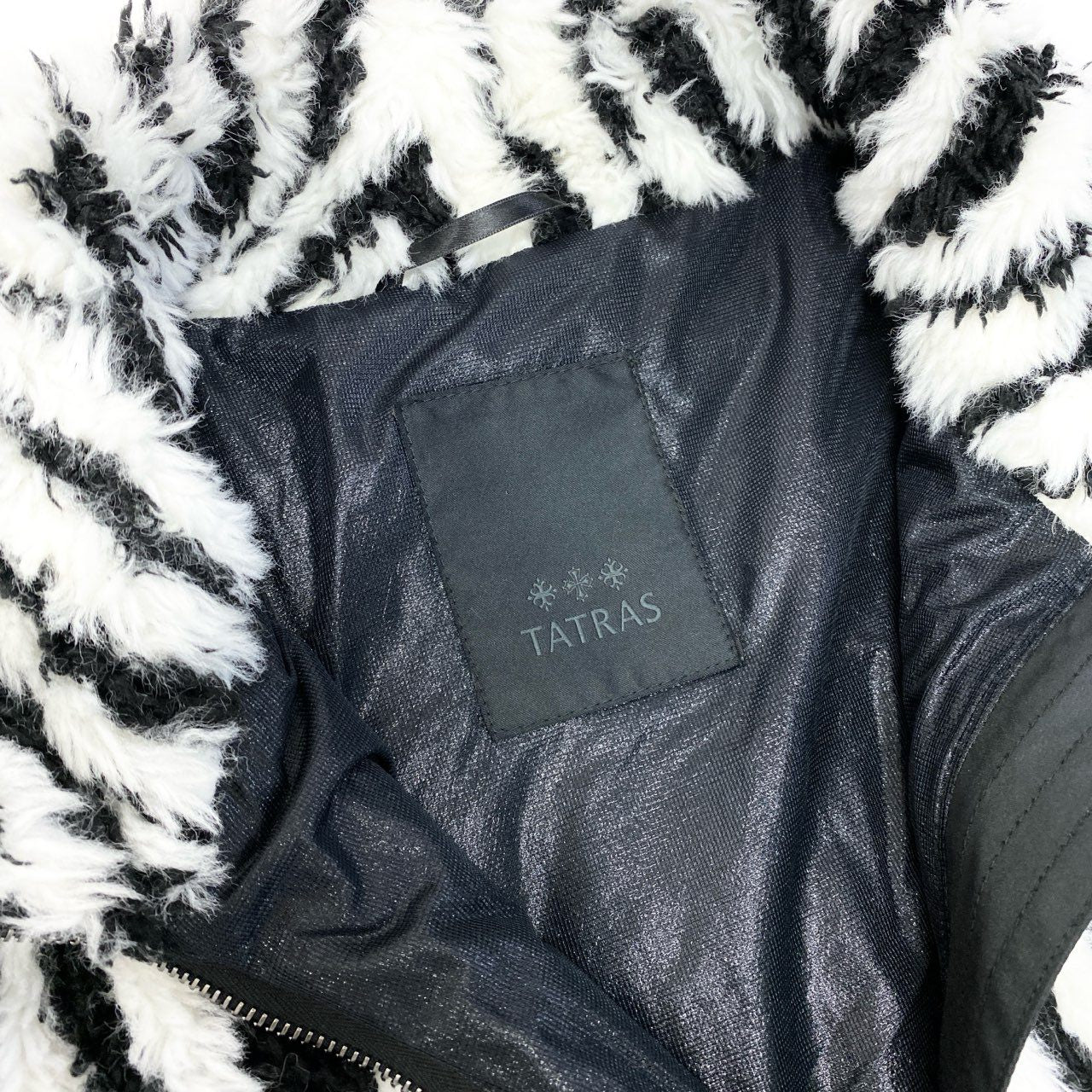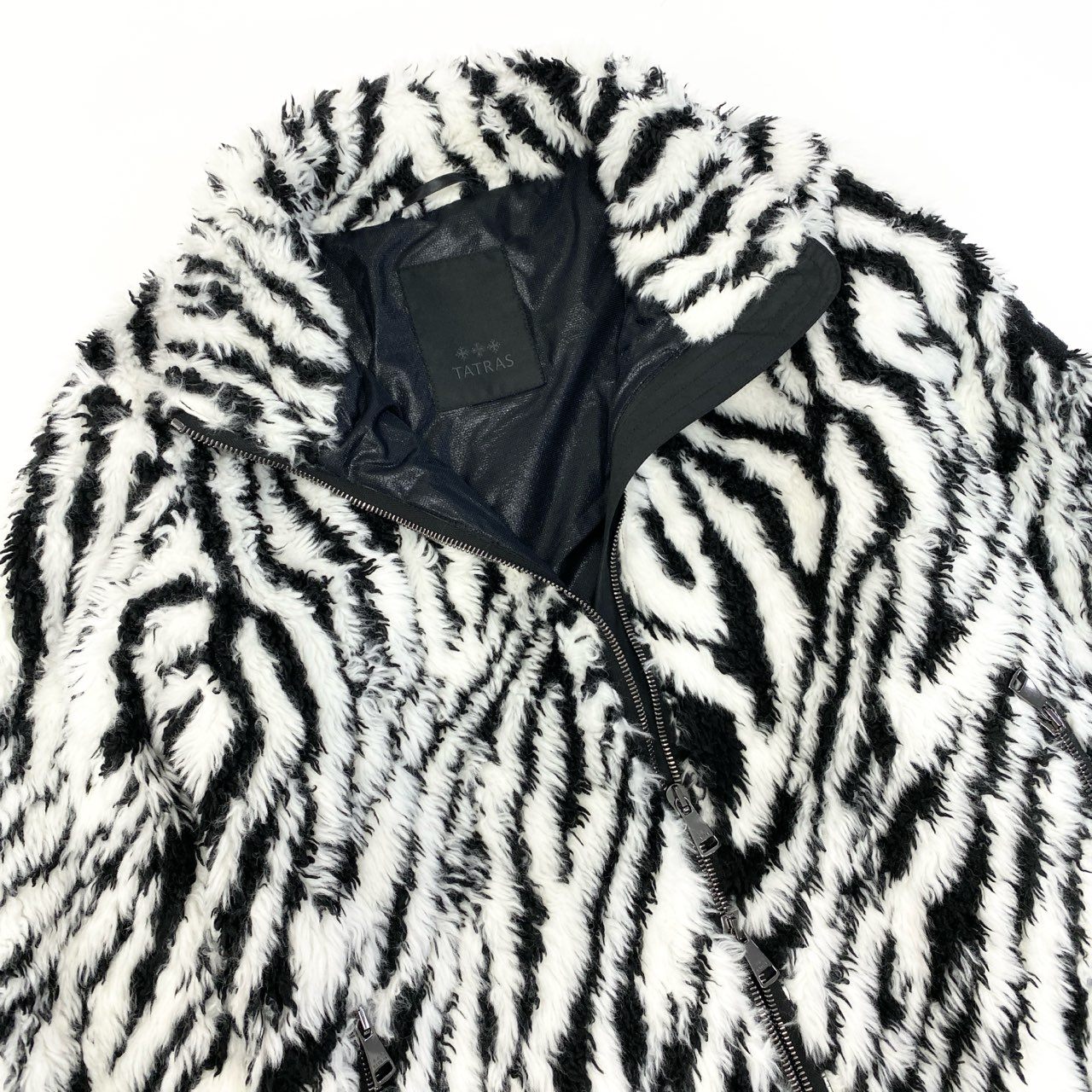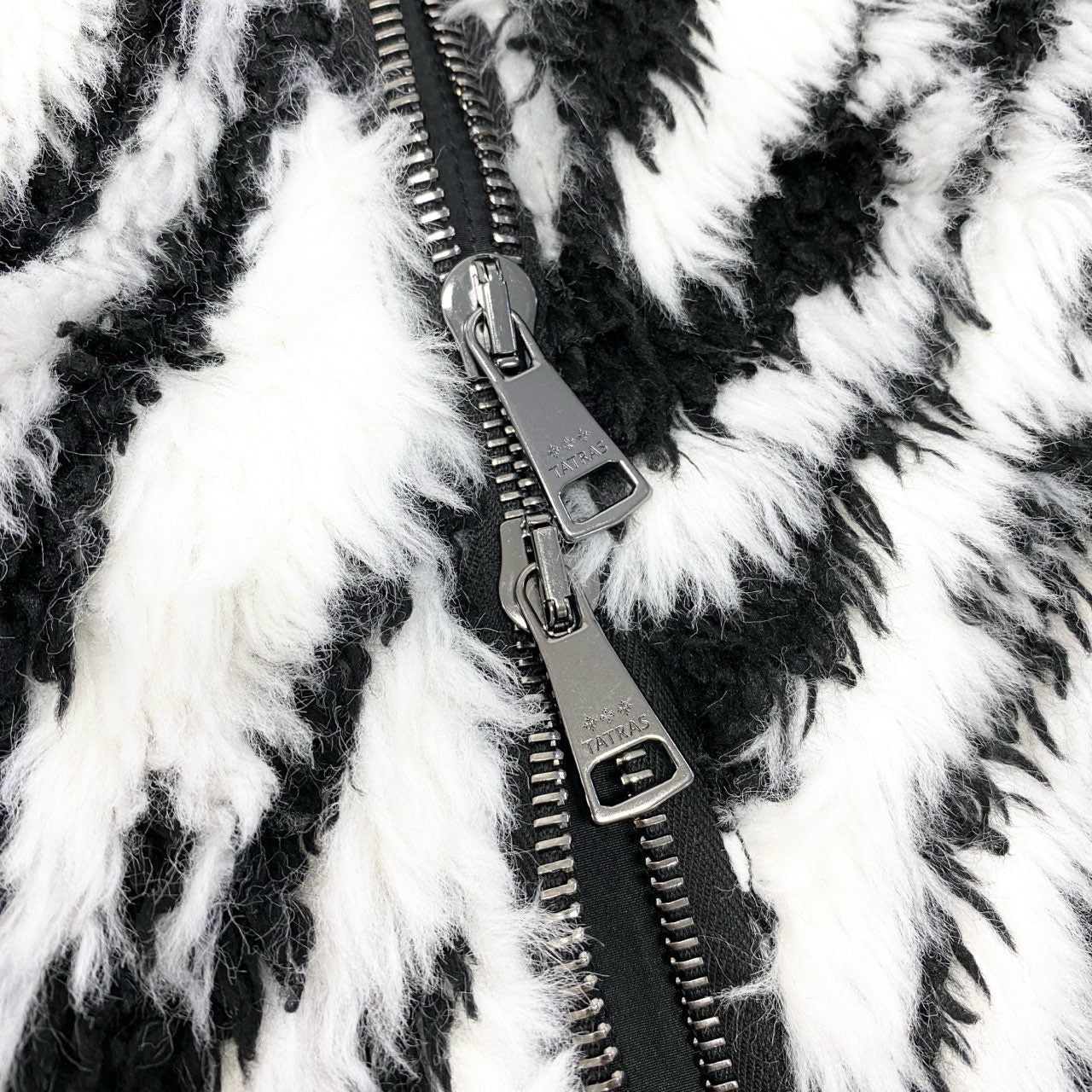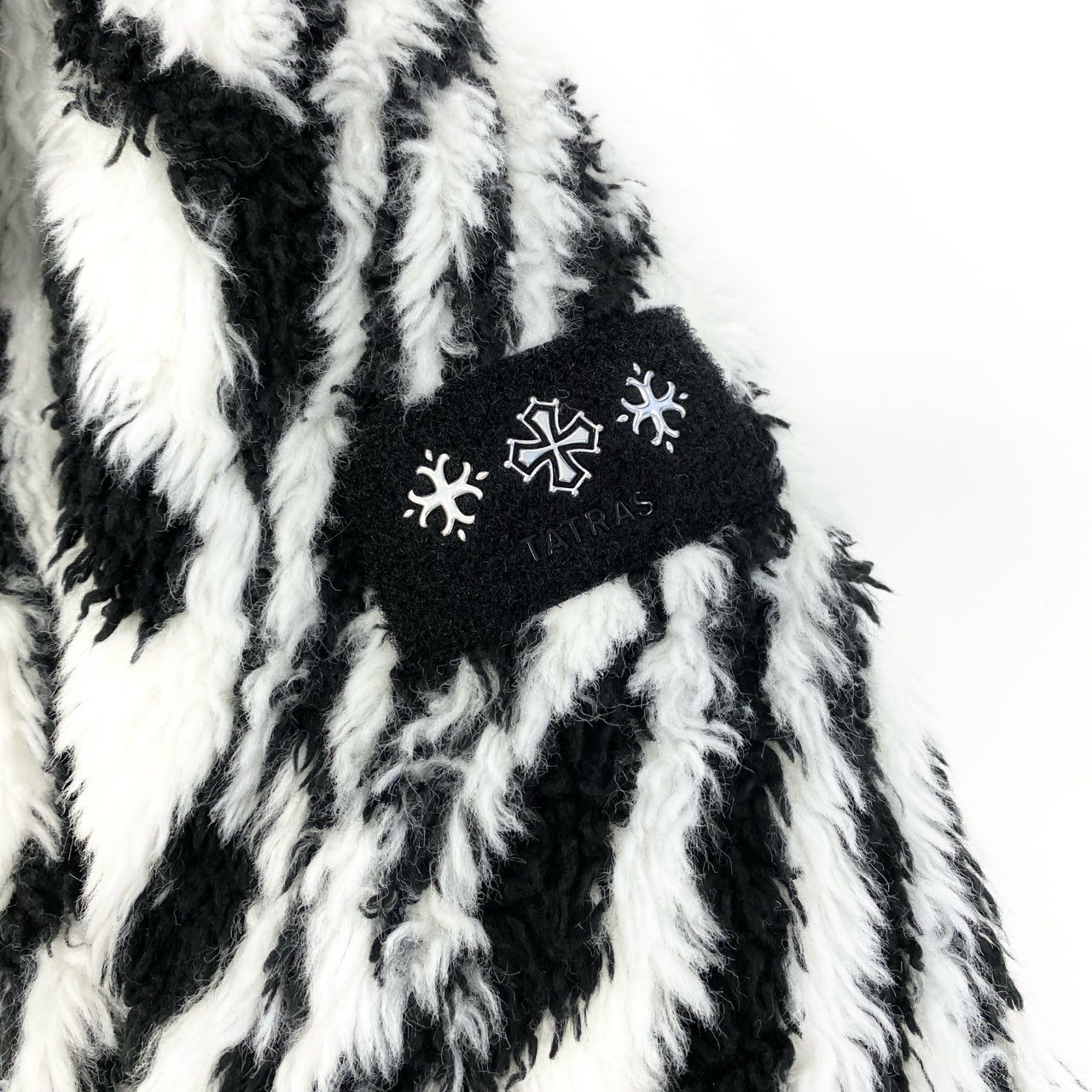 ブラック×ホワイトのゼブラ柄が印象的なTATRASのボアフリースブルゾンです。毛足のある柔らかなポリエステルボア素材で、防寒性と軽い着心地を兼ね備えています。フロントジップ仕様とジップポケットがスポーティーなアクセントになっています。コーディネートの主役になるインパクトのあるデザインで、ストリートやカジュアルスタイルに映える一着です。