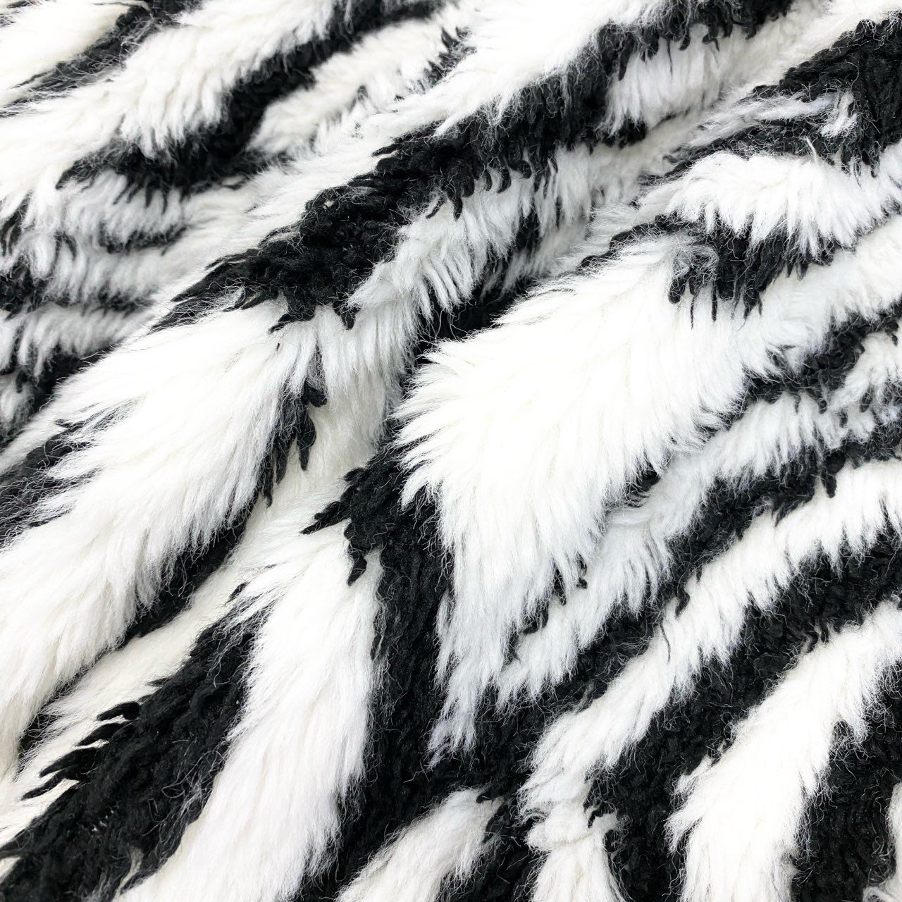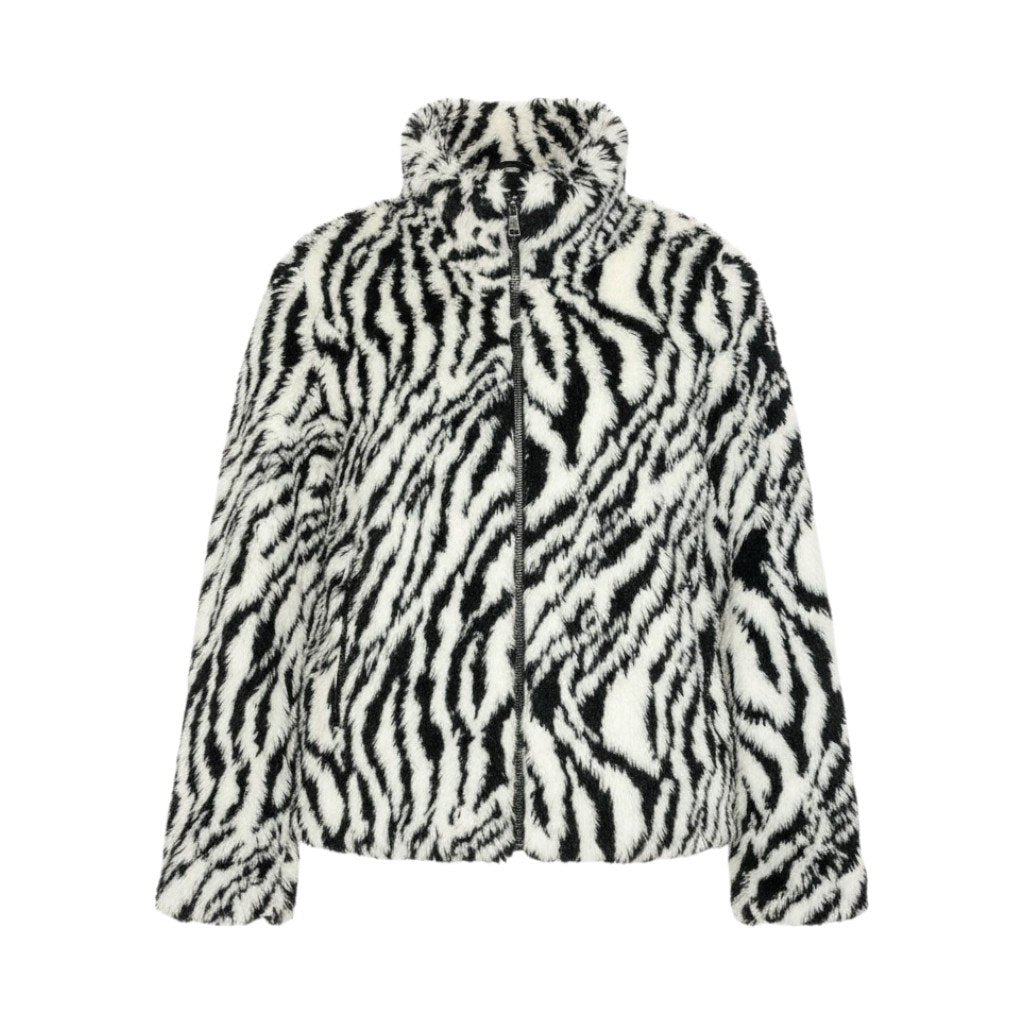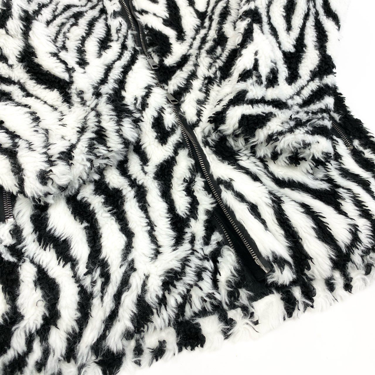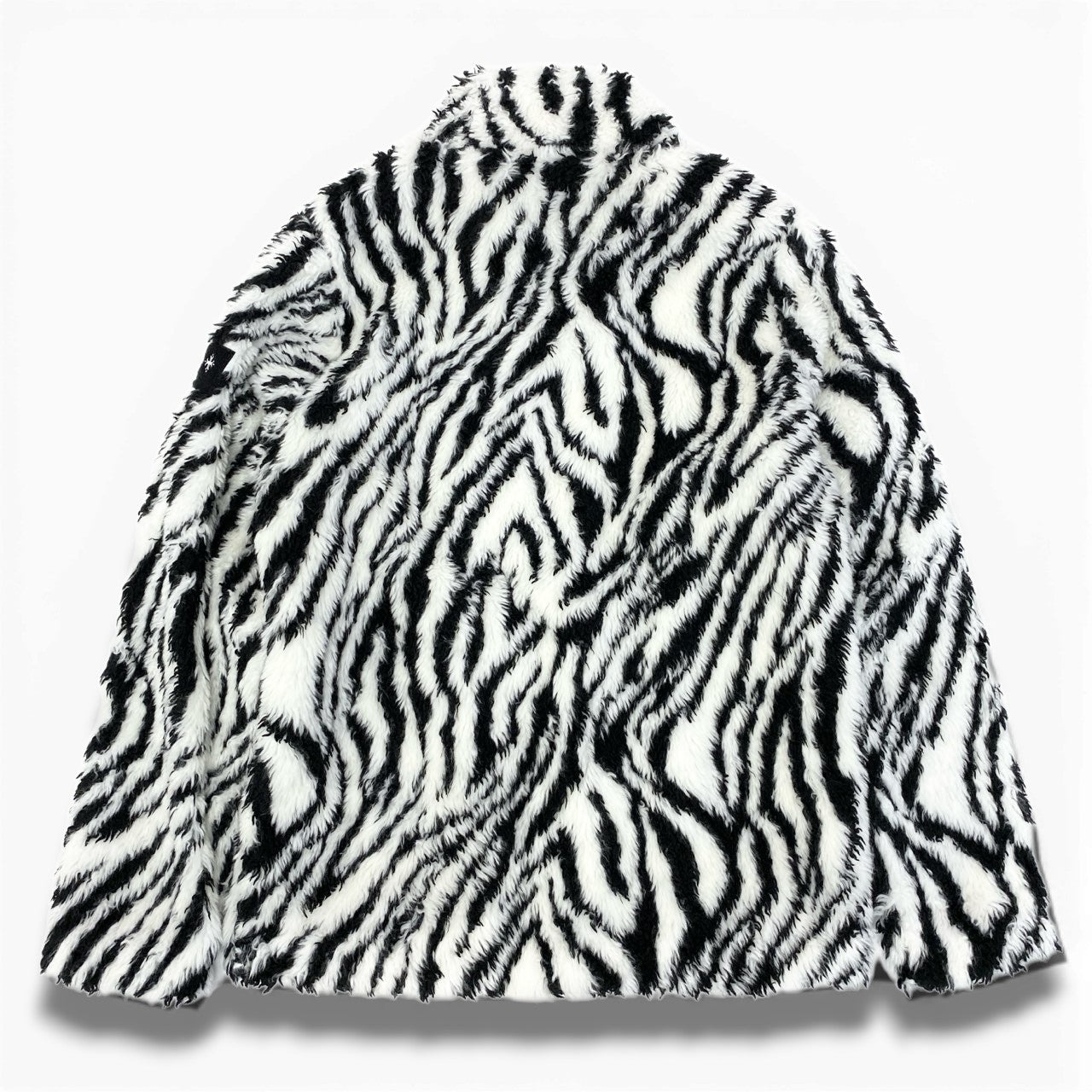 ブラック×ホワイトのゼブラ柄が印象的なTATRASのボアフリースブルゾンです。毛足のある柔らかなポリエステルボア素材で、防寒性と軽い着心地を兼ね備えています。フロントジップ仕様とジップポケットがスポーティーなアクセントになっています。コーディネートの主役になるインパクトのあるデザインで、ストリートやカジュアルスタイルに映える一着です。
