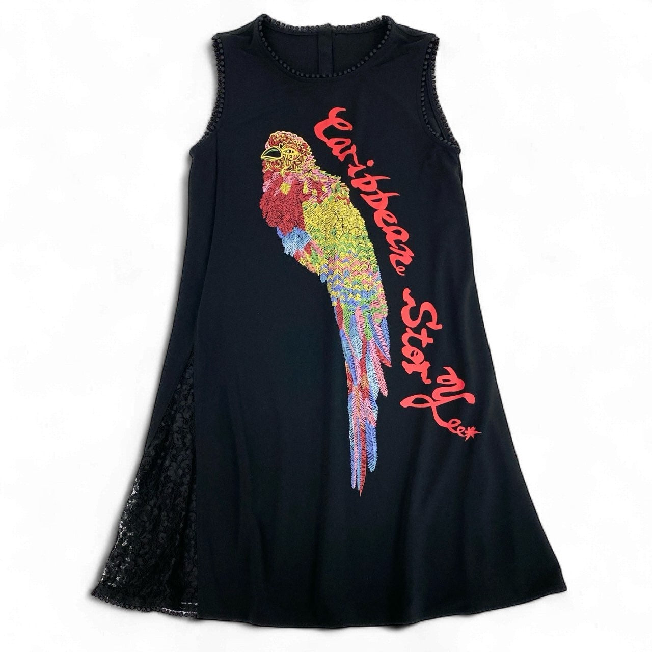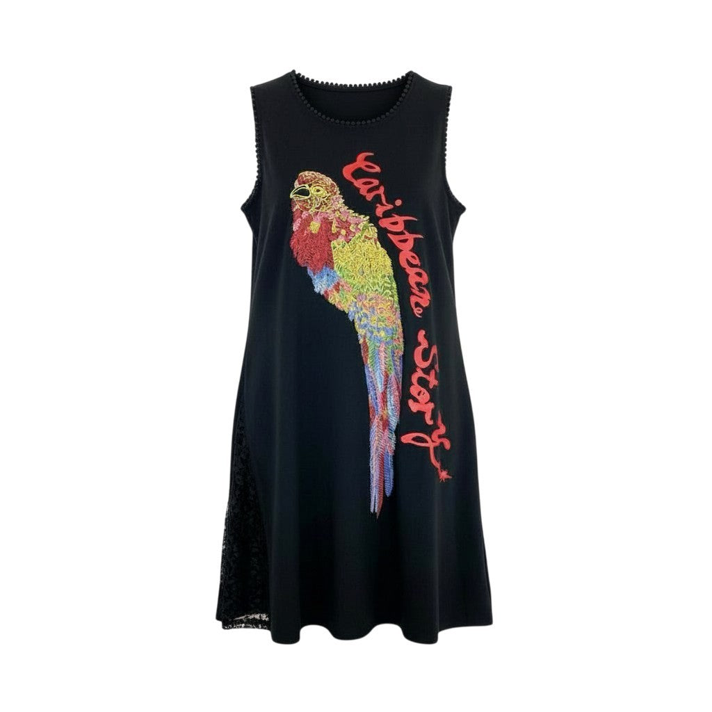 深いブラックをベースに、鮮やかな オウムのカラフル刺繍 と大胆なロゴが映える、トクコプルミエヴォルらしいアート性あふれるノースリーブワンピースです。サイドには繊細な ブラックレース切替 が入り、動くたびに軽やかな表情が生まれます。ストレッチの効いた滑らかな素材で着心地も快適。1枚で主役になる華やかさがあり、日常のお出かけから旅行、ステージ衣装としても活躍する華やぎワンピースです。