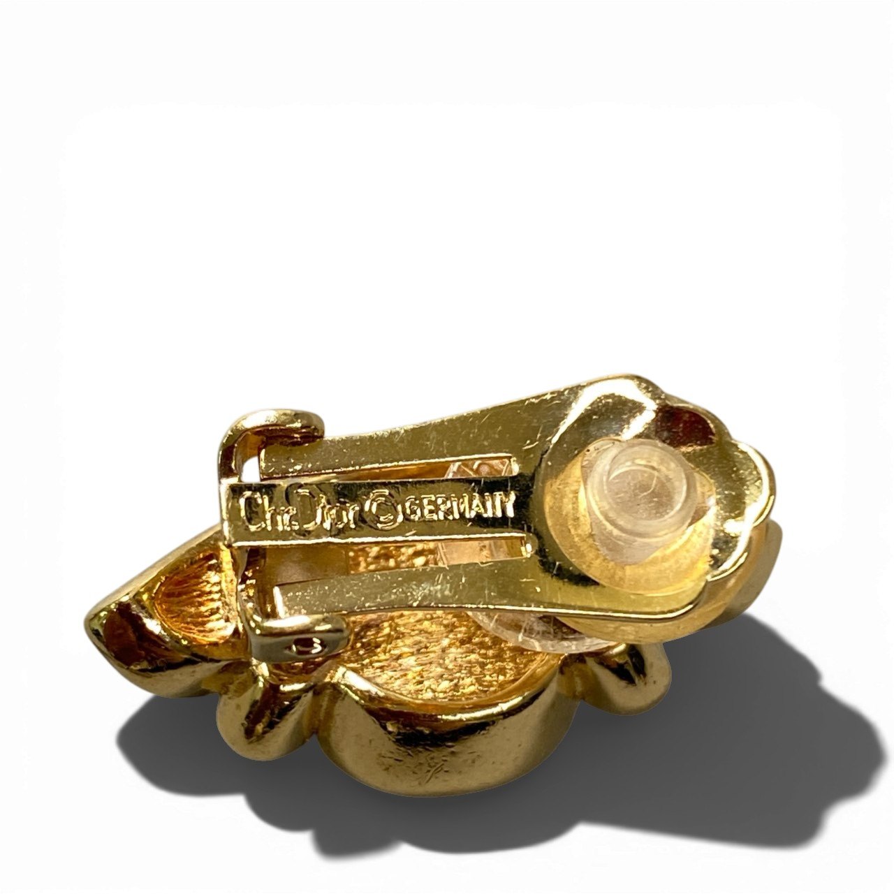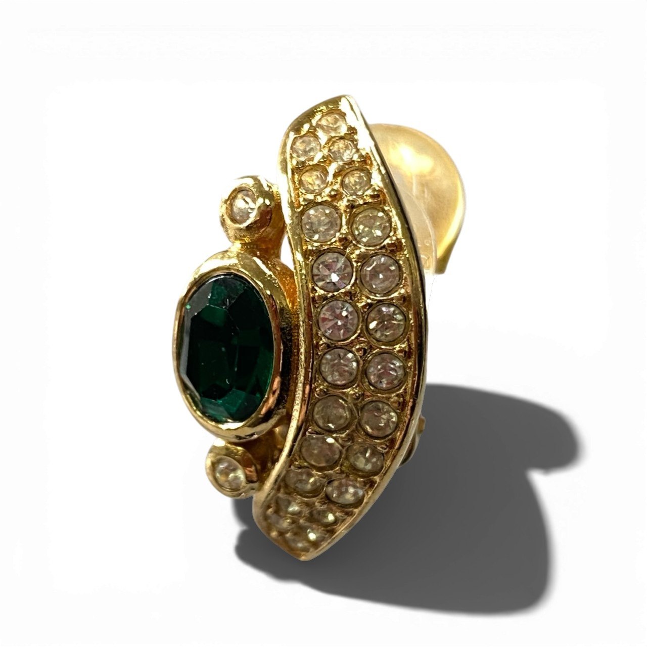 ゴールドカラーのメタルにラインストーンをあしらい、中央にエメラルドグリーンのビジューストーンを配置したChristian Diorのイヤリングです。 カーブしたゴールドフレームとクリアストーンが華やかな輝きを放ち、クラシックでエレガントな印象を与えます。 深みのあるグリーンカラーのストーンがアクセントとなり、顔周りを上品に彩るデザインです。 ドレススタイルやフォーマルコーデはもちろん、シンプルな装いのワンポイントとしても映えるアクセサリーです。