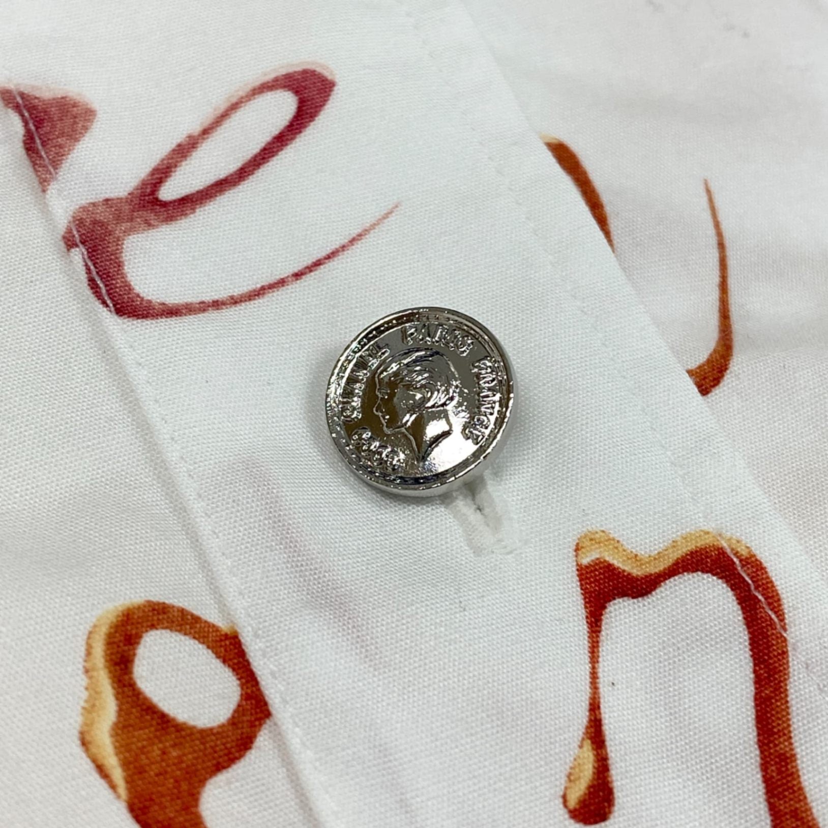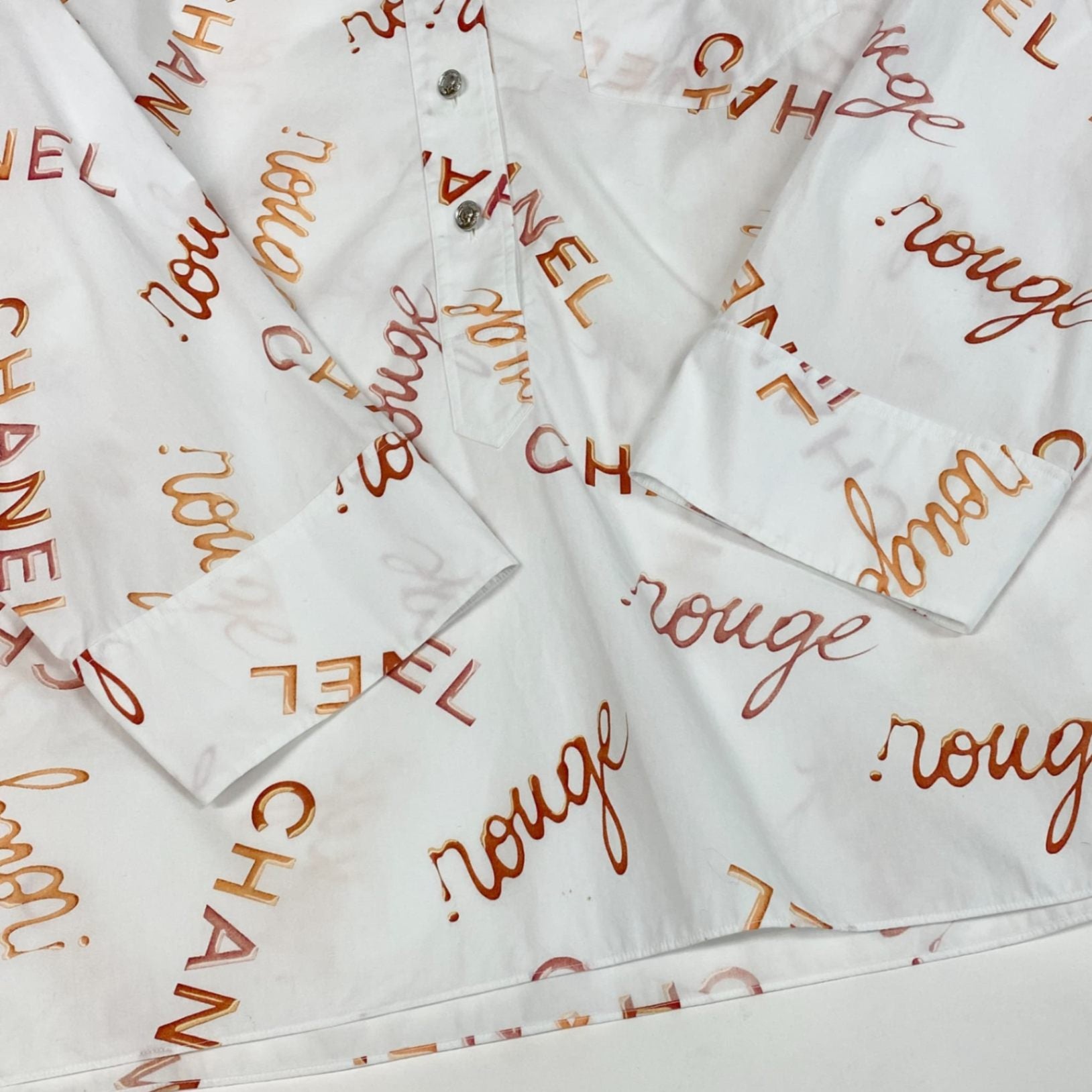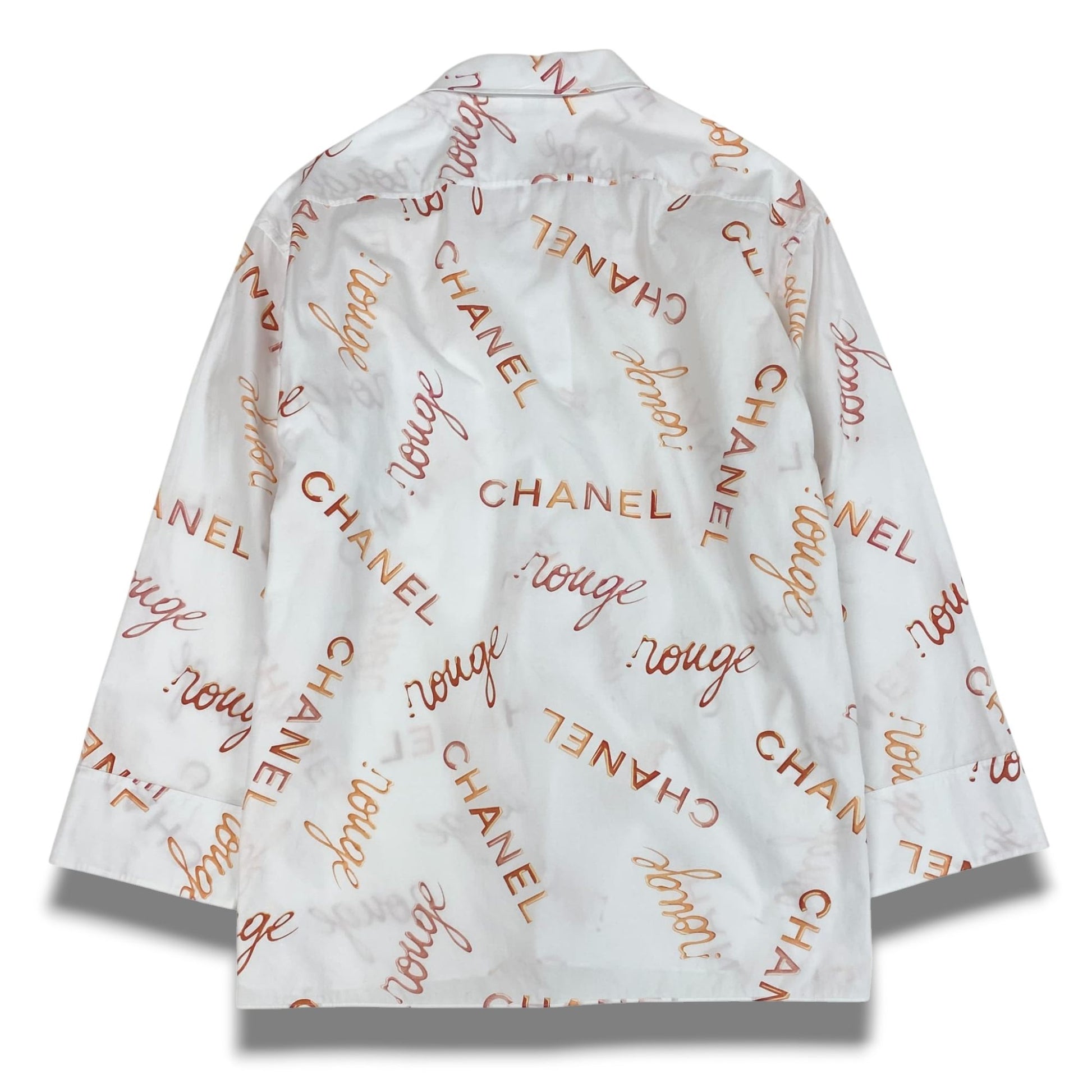 シャネルのアイボリーホワイトをベースに、キャメルブラウンのロゴプリントが散りばめられたプルオーバーシャツです。「CHANEL」や「rouge」の総柄デザインが目を引く存在感ある一着。マットで軽やかな素材感が上品さと抜け感を演出します。ワイドパンツやスキニーと合わせたモードスタイルはもちろん、羽織りとしても活躍する主役級アイテムです。