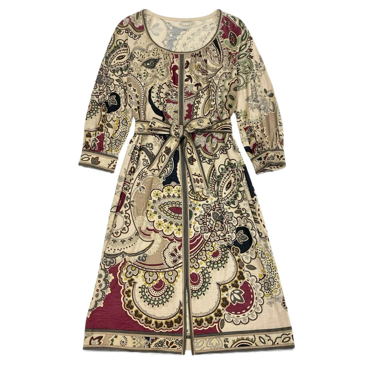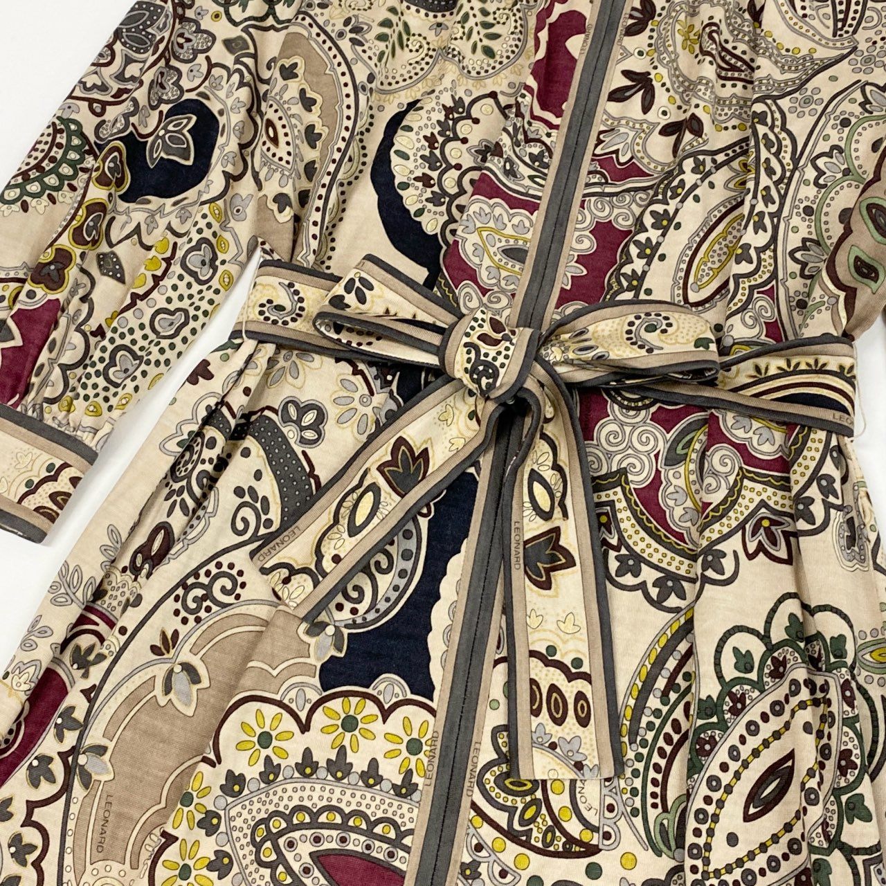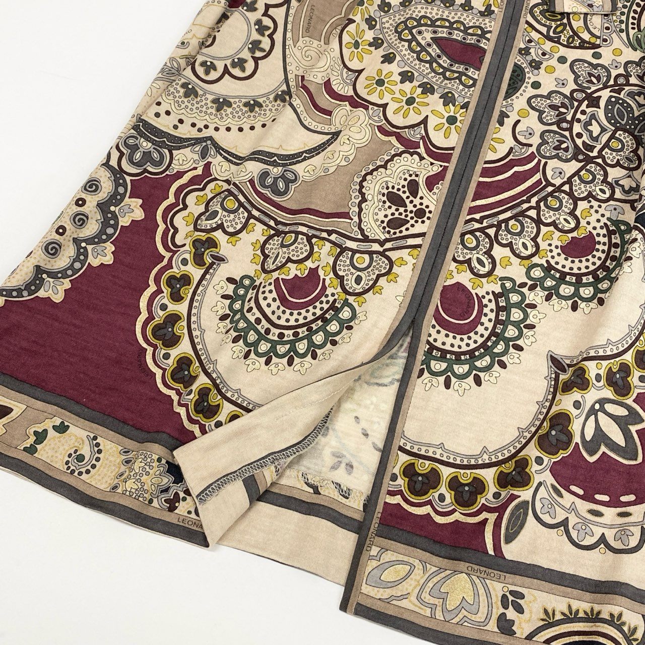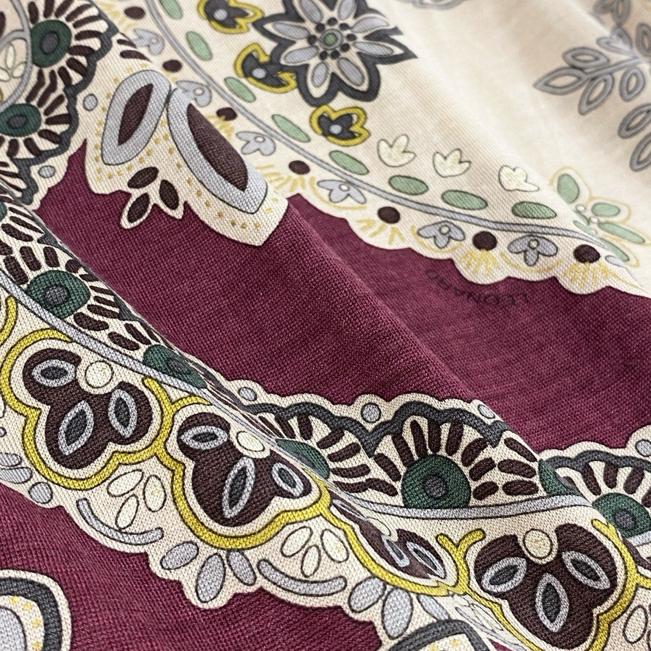 LEONARDらしいエクリュベージュ×ボルドー×オリーブ×ネイビーのペイズリープリントが華やかなワンピースです。 素材はなめらかでマットなジャージー生地で、ストレッチ性があり、身体のラインを上品に整える着心地の良さが魅力。 フロントのトリミングと共布ベルトがシルエットにメリハリを加え、エレガントな装いを演出します。 七分袖で季節を問わず使いやすく、旅行・お食事会・フォーマル寄りのシーンにも対応。 一枚で華やかさが完成する、LEONARDの魅力が詰まった一着です。