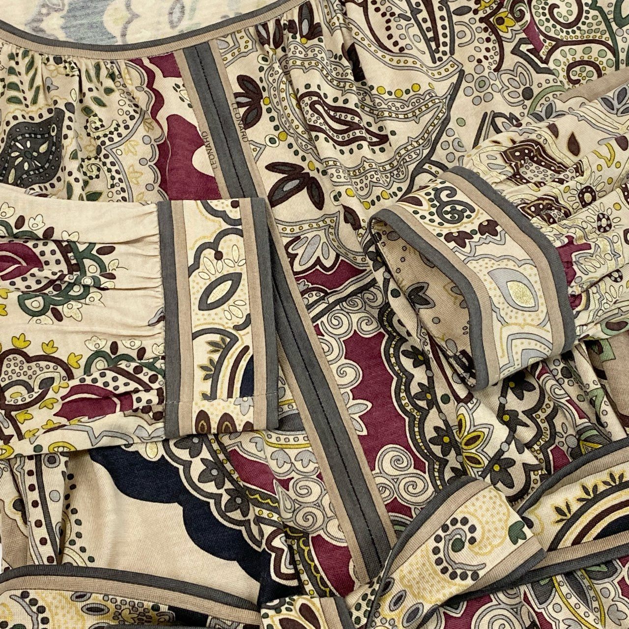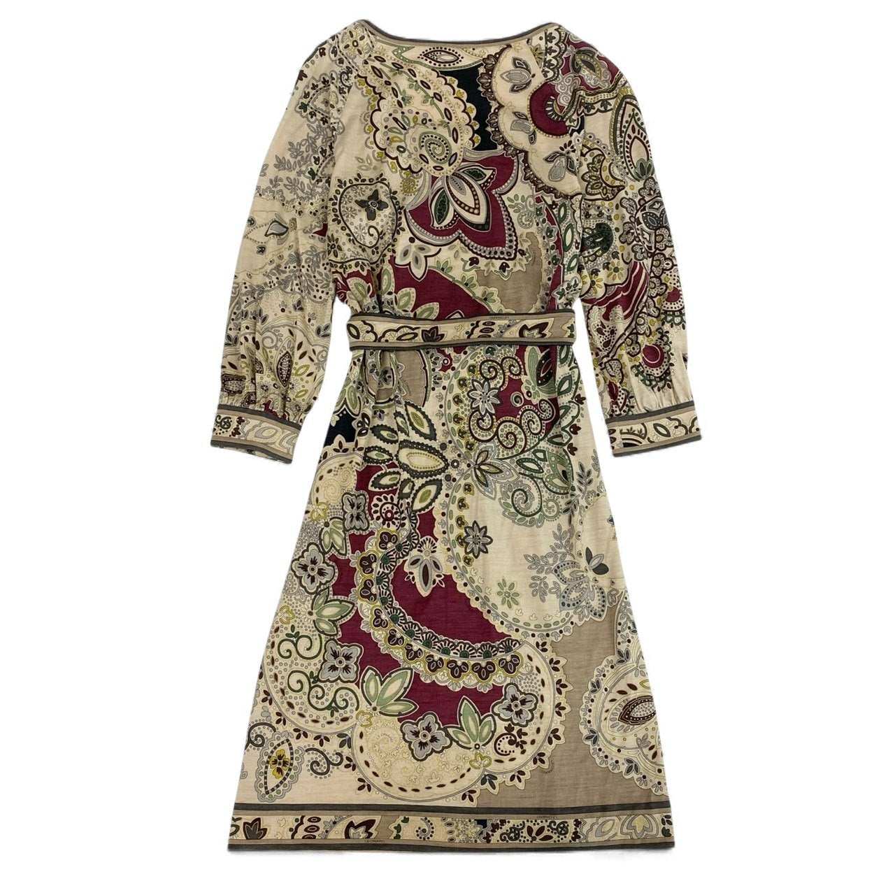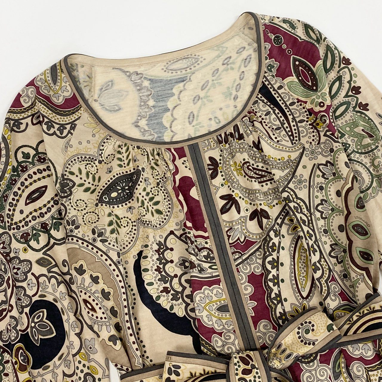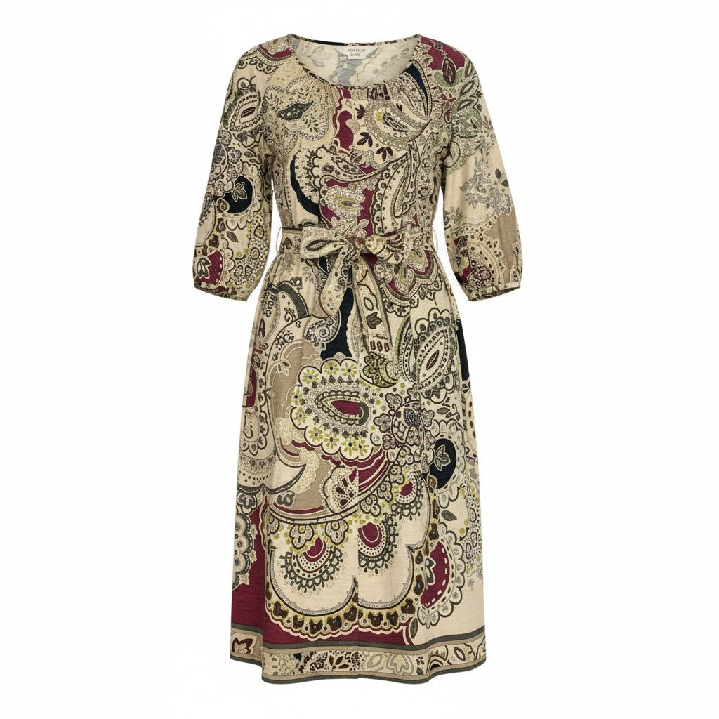 LEONARDらしいエクリュベージュ×ボルドー×オリーブ×ネイビーのペイズリープリントが華やかなワンピースです。 素材はなめらかでマットなジャージー生地で、ストレッチ性があり、身体のラインを上品に整える着心地の良さが魅力。 フロントのトリミングと共布ベルトがシルエットにメリハリを加え、エレガントな装いを演出します。 七分袖で季節を問わず使いやすく、旅行・お食事会・フォーマル寄りのシーンにも対応。 一枚で華やかさが完成する、LEONARDの魅力が詰まった一着です。