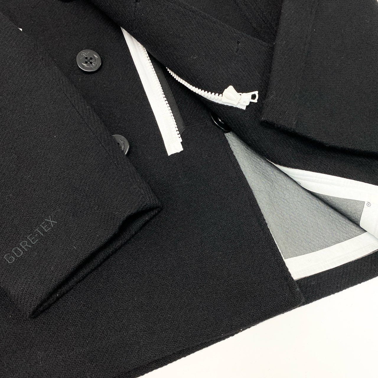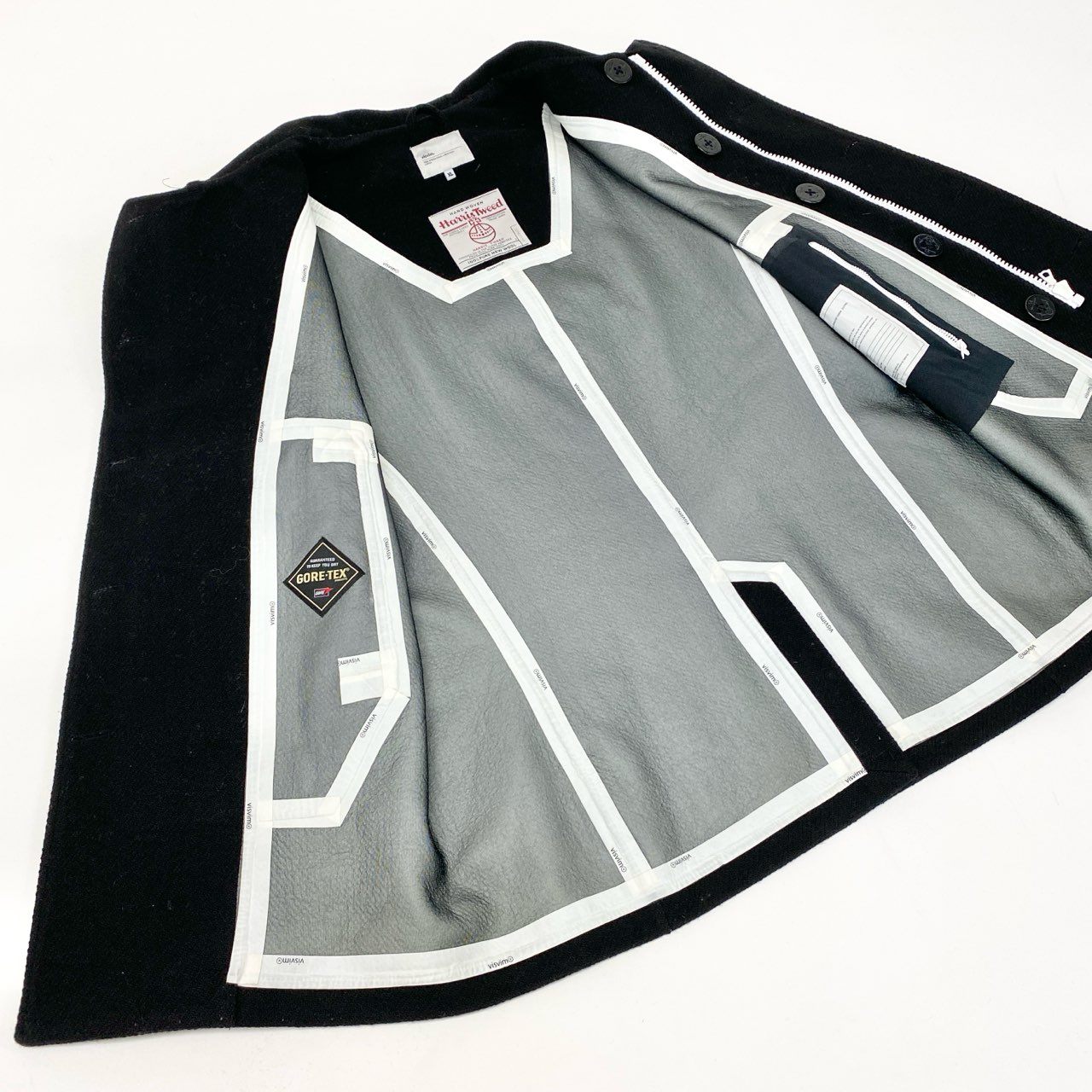 visvim「1LIEUTENANT COAT 3L」Harris Tweed × GORE-TEXを採用した高機能Pコート。上質なブラックウールツイードにマットな質感を持ち、伝統素材ハリスツイードの風合いとGORE-TEXの防水透湿性を融合。ダブルボタン仕様とジップ付きポケット、袖口にGORE-TEXロゴ刺繍をあしらったこだわりのディテールが魅力です。クラシックながら都会的な印象を放ち、タウンユースからビジネスシーンまで幅広く活躍する一着です。