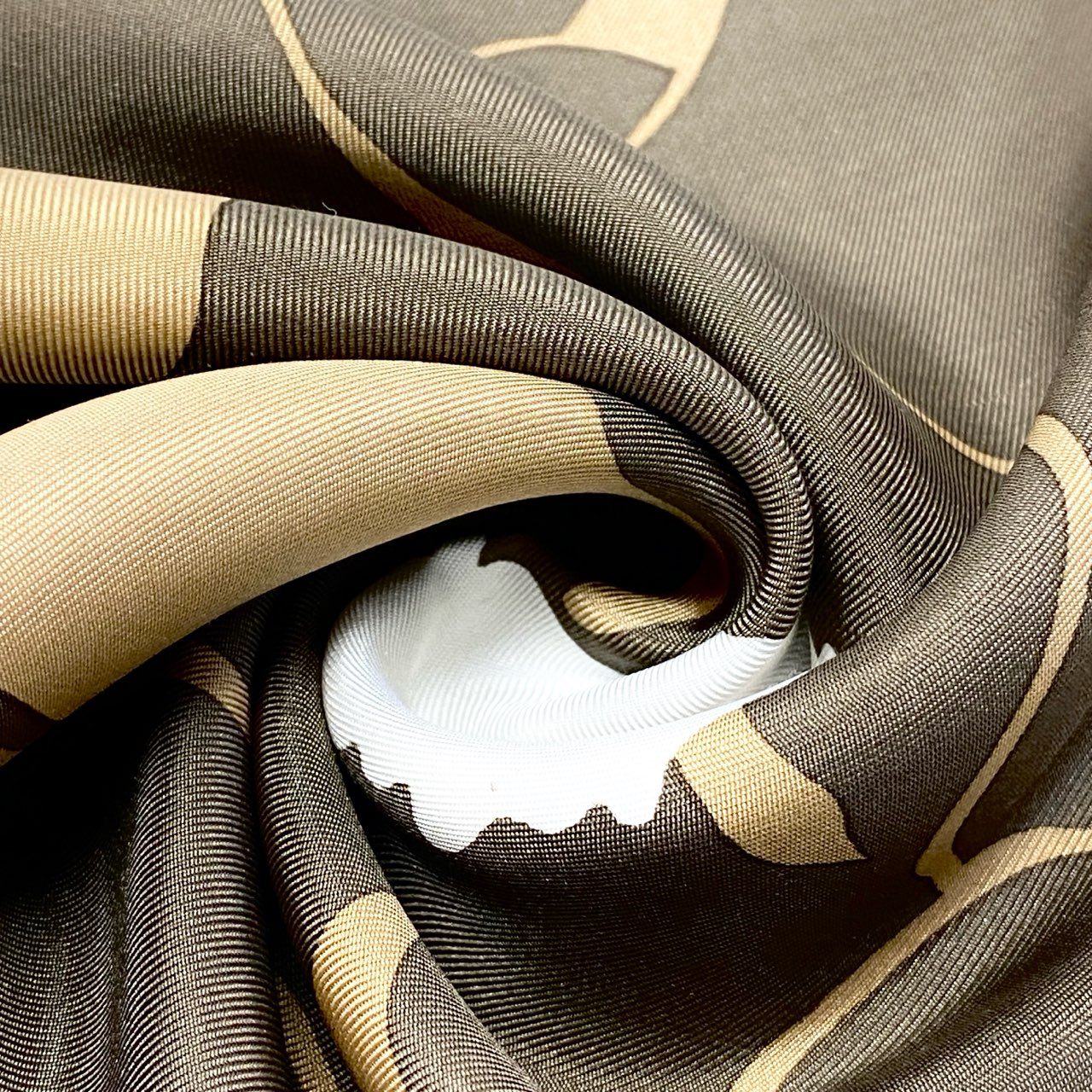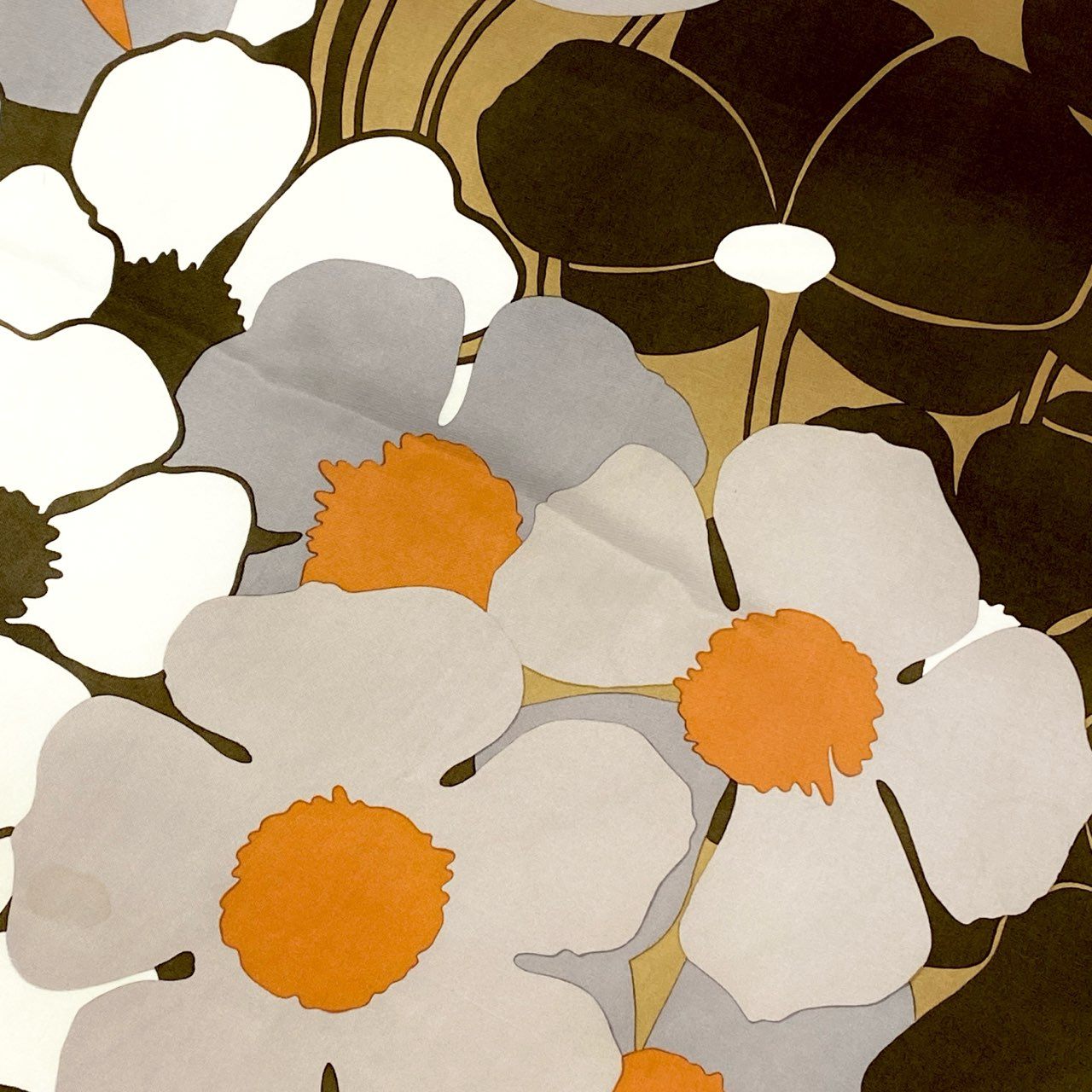 キャメルベージュをベースに、カーキグリーンとアイボリーホワイトの大胆なフラワープリントが映える一枚です。 花芯のオレンジがアクセントとなり、レトロモダンな配色バランスが魅力です。 なめらかな光沢のあるシルク素材が上品な印象を演出し、「Christian Dior」ロゴがさりげなく配置されています。 シンプルな装いに華やかさを添えるアイテムとして、デイリーからきれいめスタイルまで幅広く活躍します。