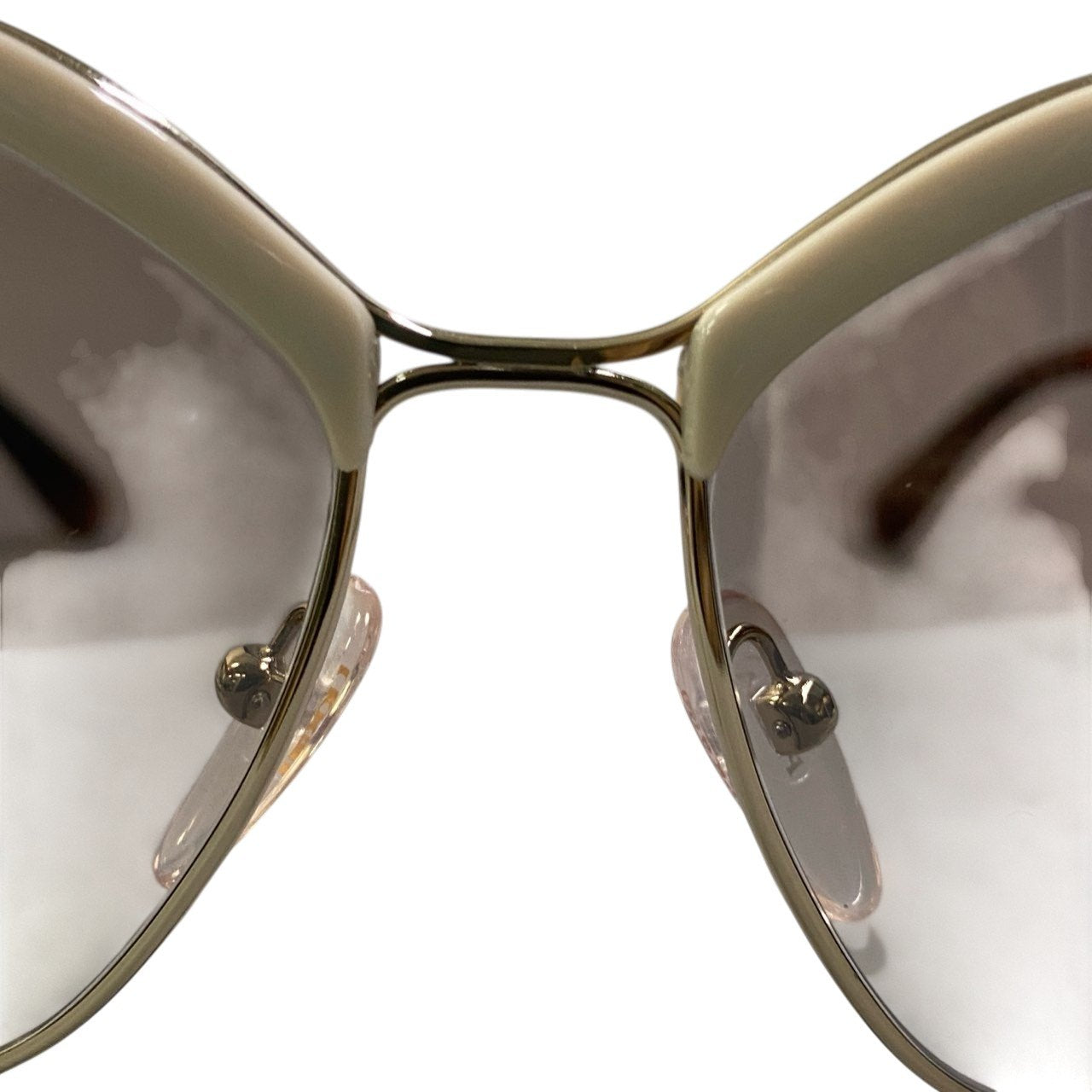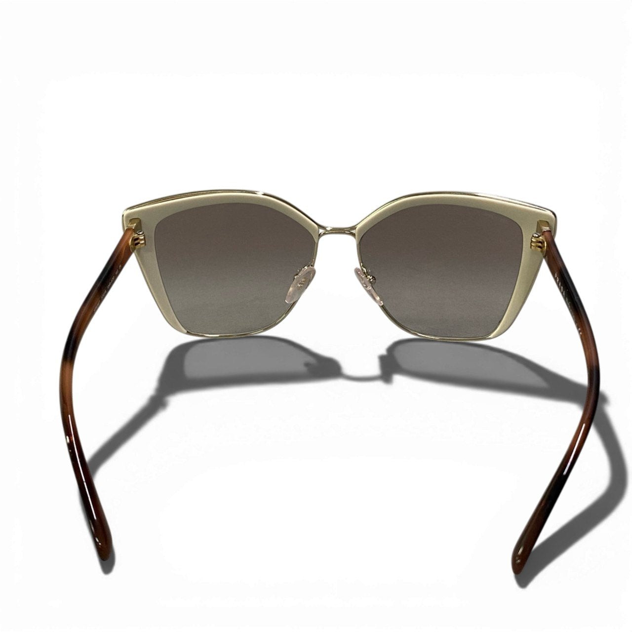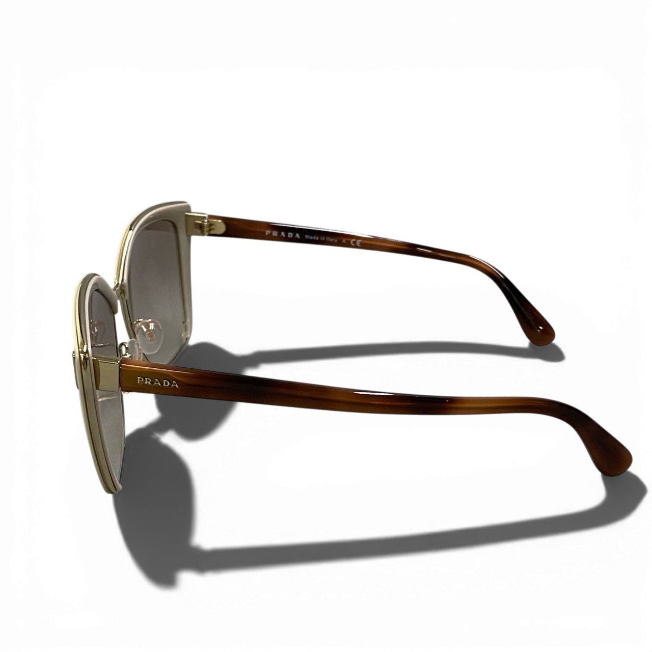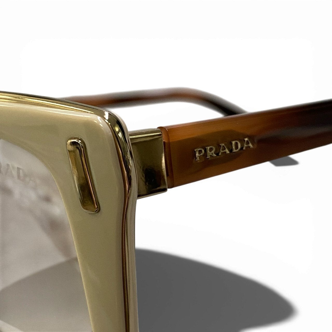 艶のあるアイボリーベージュのアセテートフレームに、ライトグレーのスモークグラデーションレンズを合わせたプラダのロゴサングラスです。テンプルはブラウンデミ調カラーで、外側にゴールドのPRADAロゴを配し上品なアクセントをプラス。ややキャットアイ気味のシャープなシルエットがフェイスラインを美しく引き立てます。洗練されたミニマルデザインで、デイリーからリゾートスタイルまで幅広く活躍する一本です。
