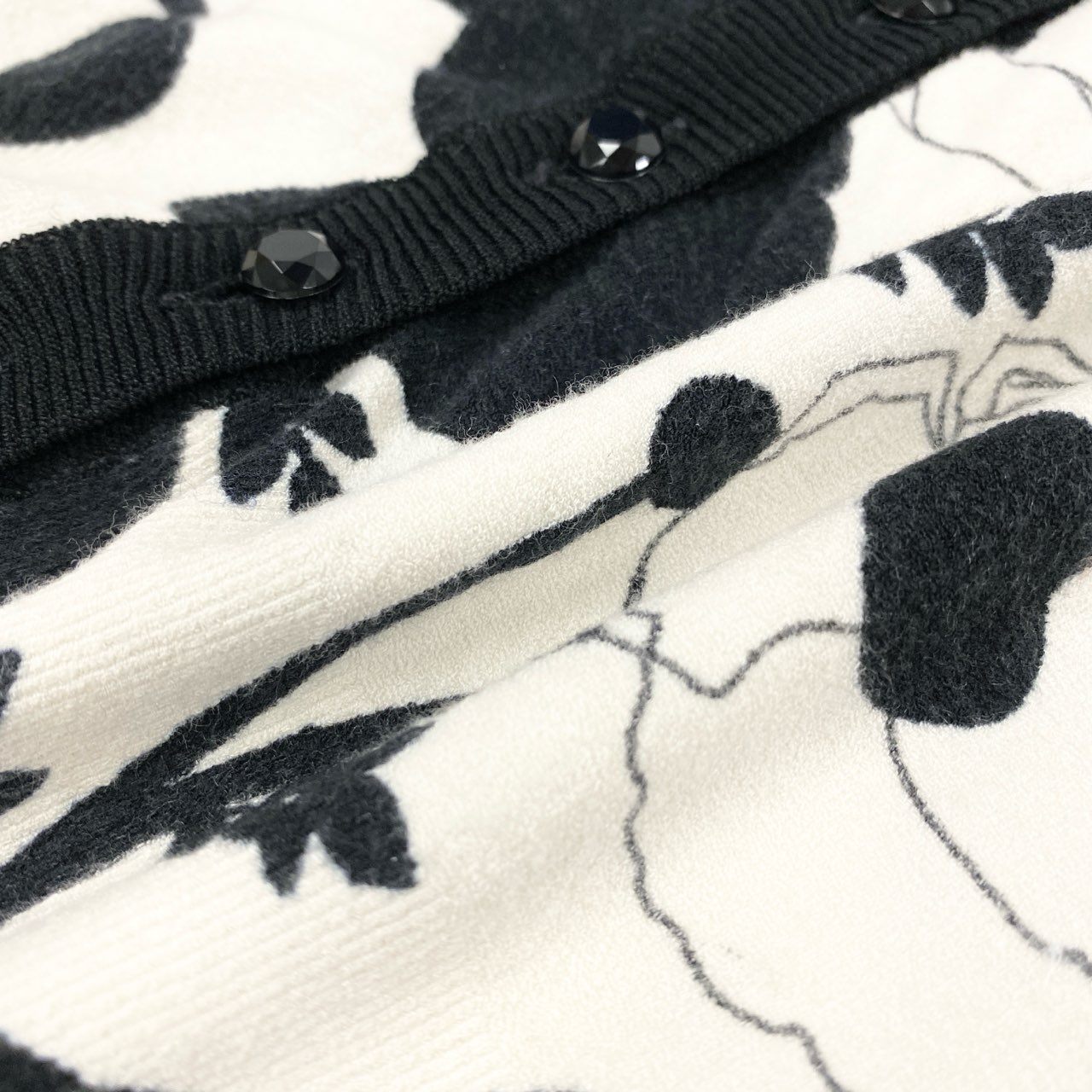 アイボリー×ブラックのフラワージャカード柄が印象的なBlumarineのカーディガンです。立体感のある大ぶりの花柄パターンがエレガントで、華やかさと上品さを両立。マットでややしっとりとした素材が心地よく、秋冬のコーディネートに最適です。フロントには同色ボタンと控えめなスパンコール装飾が施され、フォーマルにもデイリーにも映える一枚です。