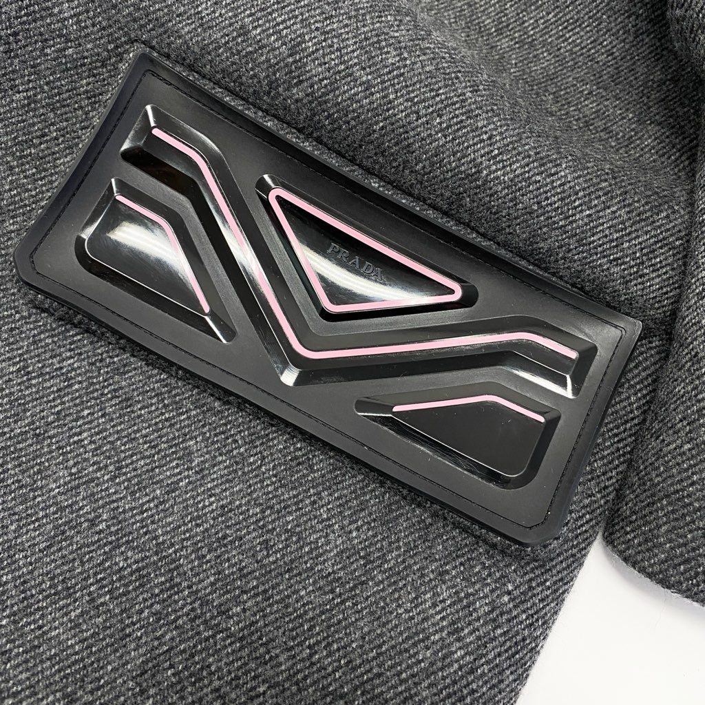 **プラダらしい洗練されたデザインが際立つウールジャケット。 チャコールグレー系の落ち着いた色味に、襟元とポケットのトライアングルモチーフ**がアクセントになっています。 マットで温かみのあるウール素材を使用し、フルジップ仕様で着脱もスムーズ。 パンツにもスカートにも合わせやすく、モードからきれいめカジュアルまで幅広く活躍する一着です。