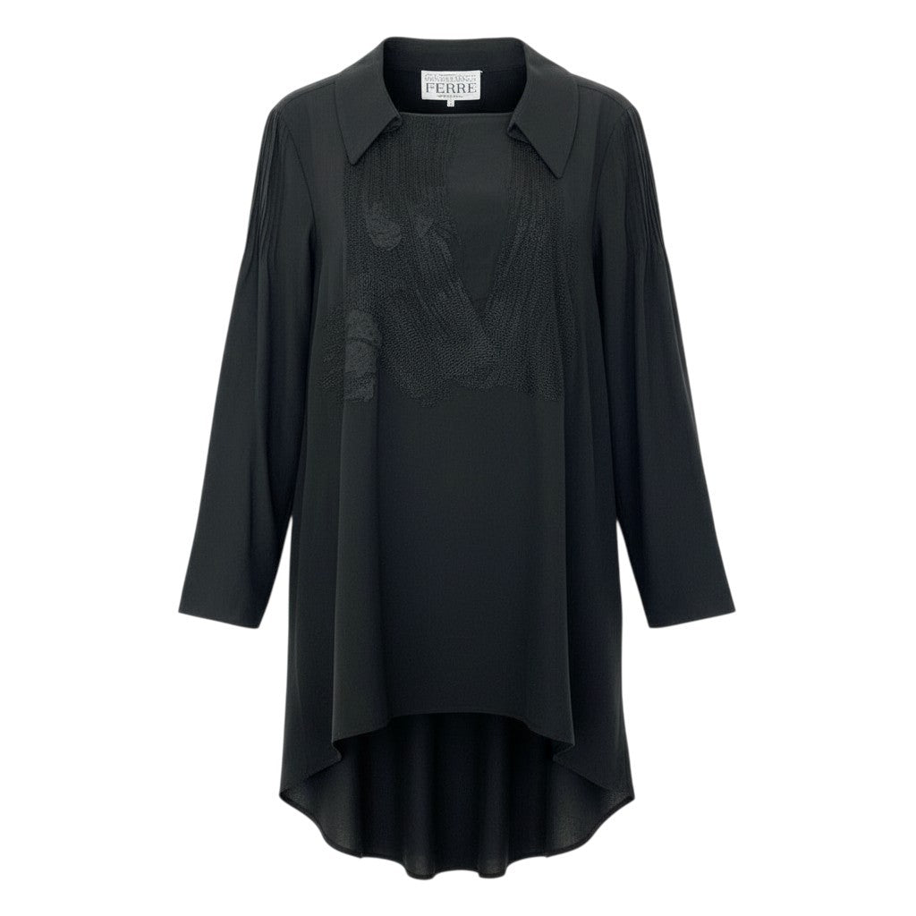 上質なブラックシルクを使用した、ジャンフランコ・フェレらしいエレガンスを感じさせる長袖ワンピースです。 フロント部分には繊細な刺繍が施され、シンプルながらも立体感と奥行きのある表情が魅力。 とろみのあるシルク素材で、軽やかな着心地と美しいドレープを楽しめます。 1枚での着用はもちろん、細身パンツとのレイヤードやフォーマルシーンにもおすすめの一着です。
