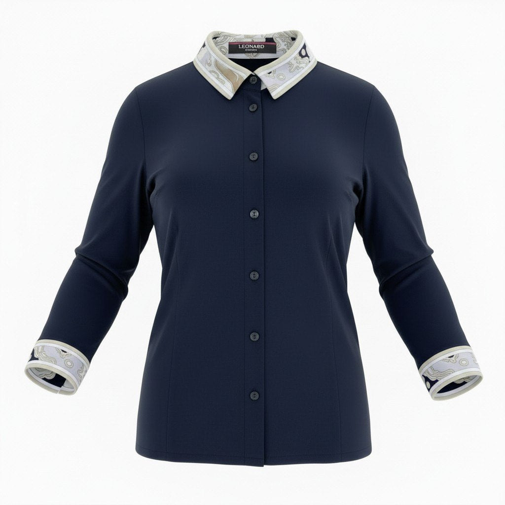 深みのあるミッドナイトネイビーをベースに、襟と袖口にアイボリー×ベージュ系の幾何学スカーフ柄を切り替えた上品なデザインです。 なめらかで落ち感のあるカンカン素材で、伸縮性があり快適な着心地です。 フロントはボタン仕様で、きちんと感のあるシャツデザインに仕上げられています。 シンプルな無地ボディにLEONARDらしい柄切替が映え、通勤やきれいめカジュアルにも活躍する一着です。