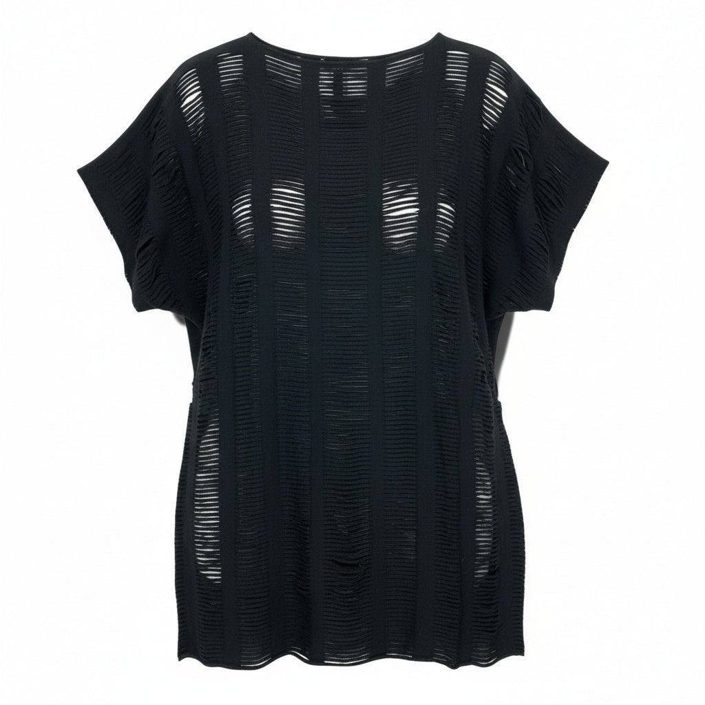 イッセイミヤケらしいブラックカラーのニットワンピースで、縦ラインを強調するストライプ調の編み柄が印象的です。程よい透け感のある軽やかなニット素材で、涼しげかつモードな雰囲気を演出します。ゆったりとした身幅とドルマンスリーブ風のデザインで、リラックス感がありながらも洗練されたシルエットが魅力です。インナー次第でデイリーからリゾート、アートイベントなど幅広いシーンに対応できる一着です。