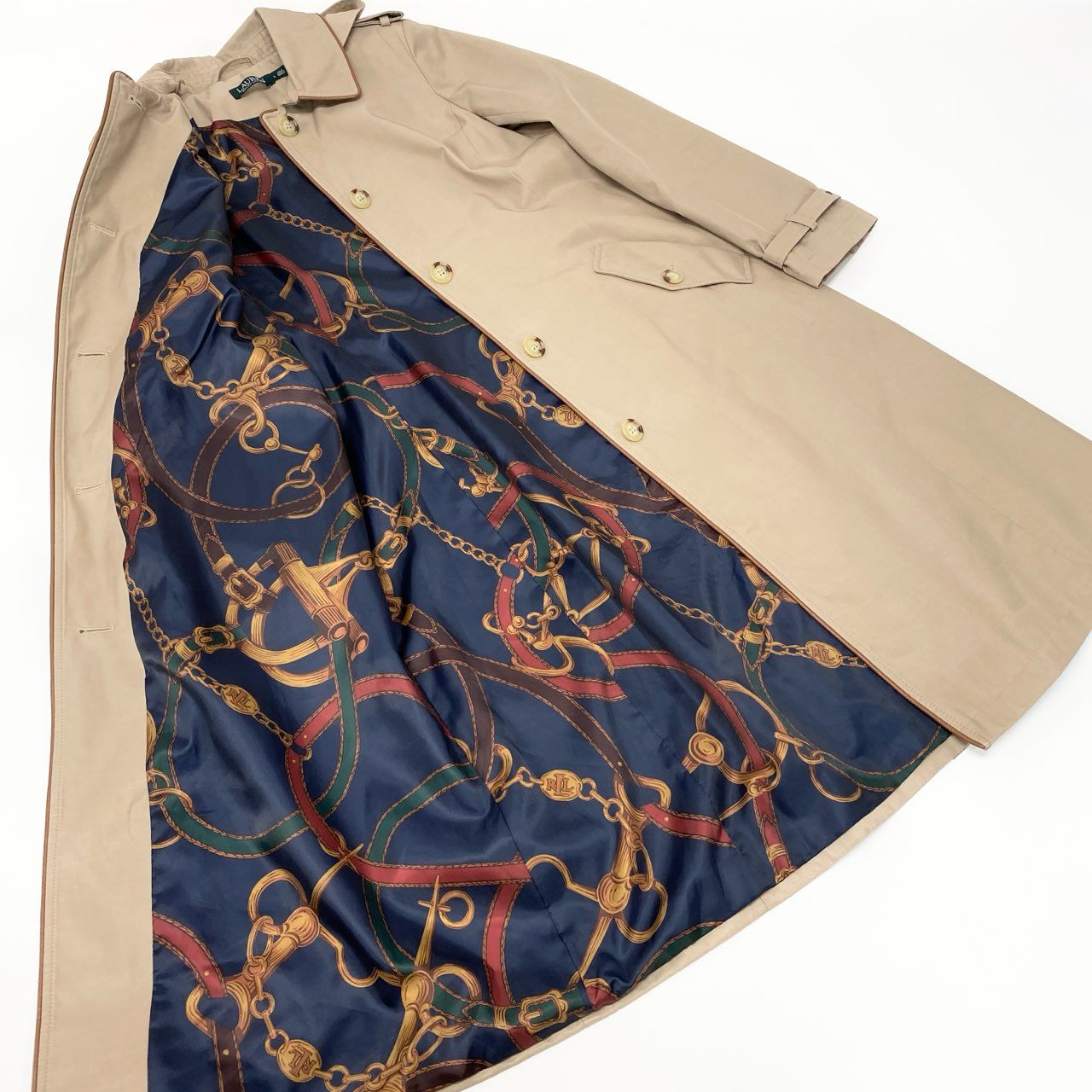 51Ⅼ2 LAUREN RALPH LAUREN ローレン ラルフローレン トレンチコート ロングコート フード取り外し可 2way レザーパイピング 裏地総柄 レディース L ベージュu02t