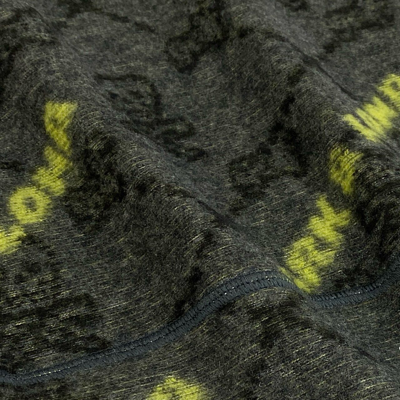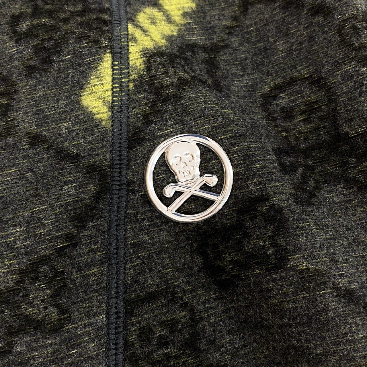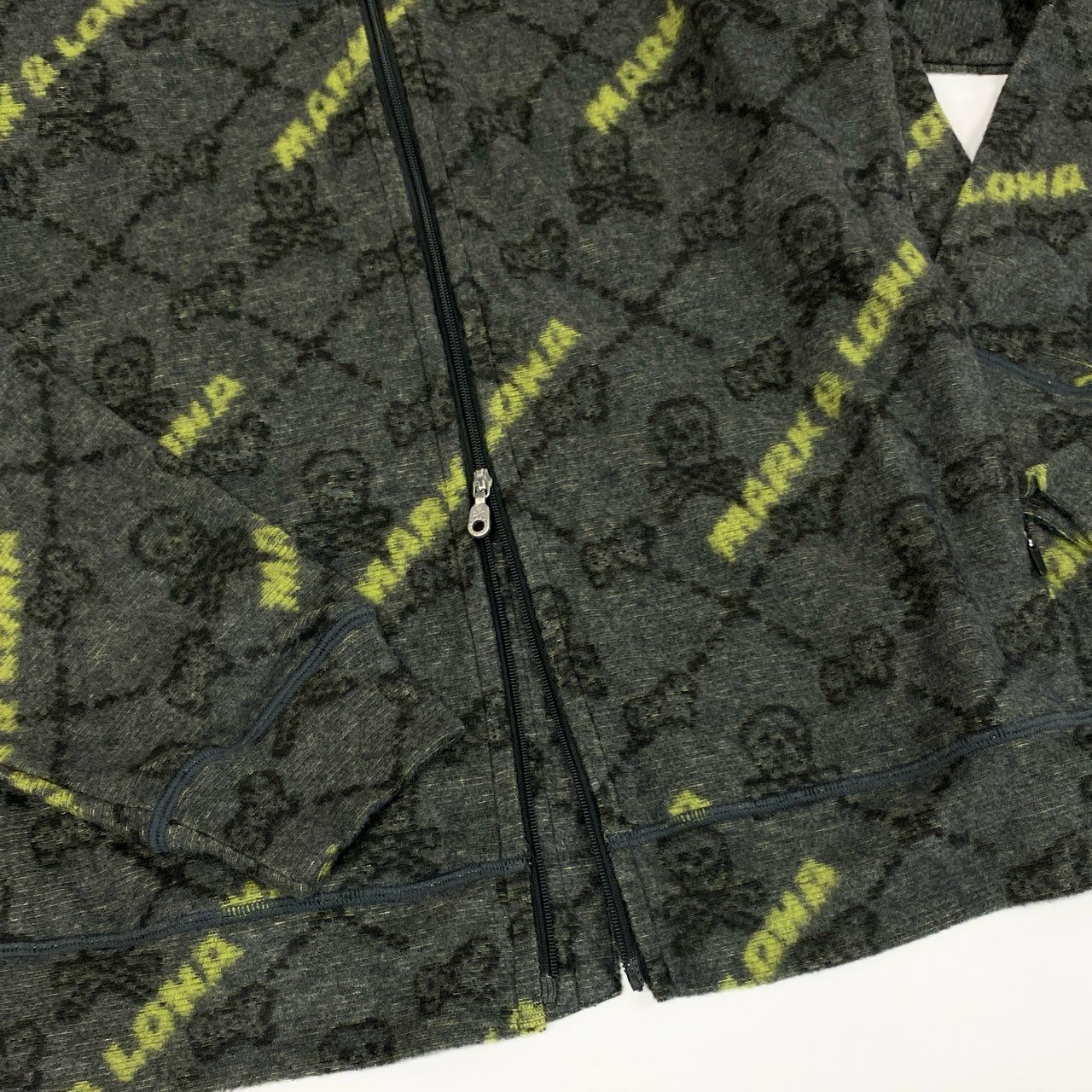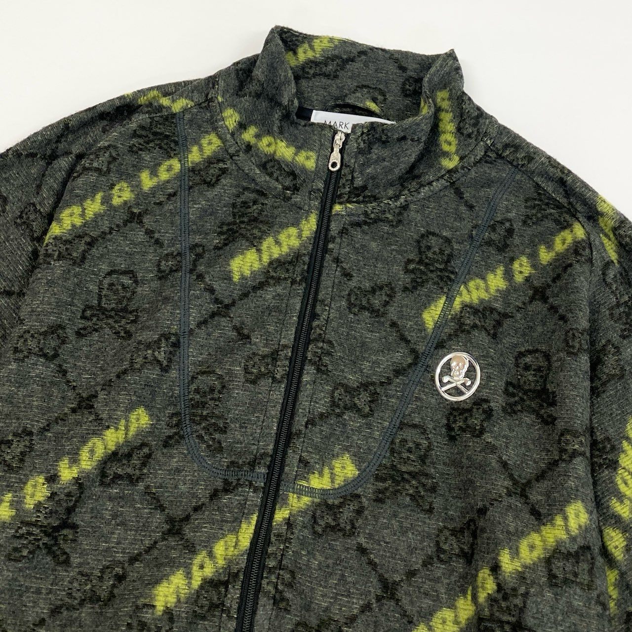 カラーはチャコールグレーをベースに、全体に「MARK & LONA」のロゴをイエローで配した総柄デザイン。背景にはスカルモチーフが織り込まれており、ブランドらしいラグジュアリーなスポーツテイストを表現しています。素材は柔らかなニット地で伸縮性があり、快適な着心地。ダブルジップ仕様で温度調整も容易なため、ゴルフをはじめとしたアクティブシーンからタウンユースまで幅広く活躍する一着です。