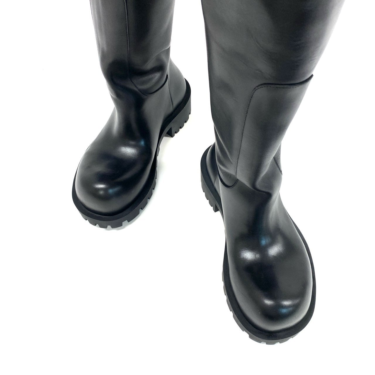 こちらはBALENCIAGA(バレンシアガ)の「HUMMER CUISSARDES」サイハイブーツ、カラーはマットな質感のブラックレザーです。無駄のないミニマルなデザインながら、迫力あるロング丈と厚みのあるラグソールが特徴的。スタイリングに取り入れるだけでモード感が一気に高まる存在感のある一足です。タウンユースはもちろん、ファッション性を重視したシーンにもおすすめです。