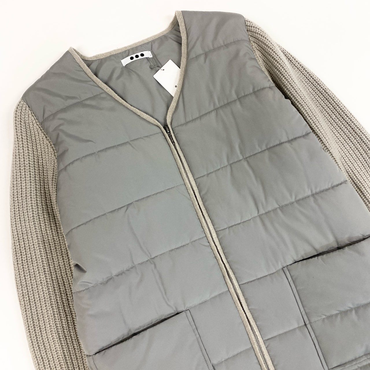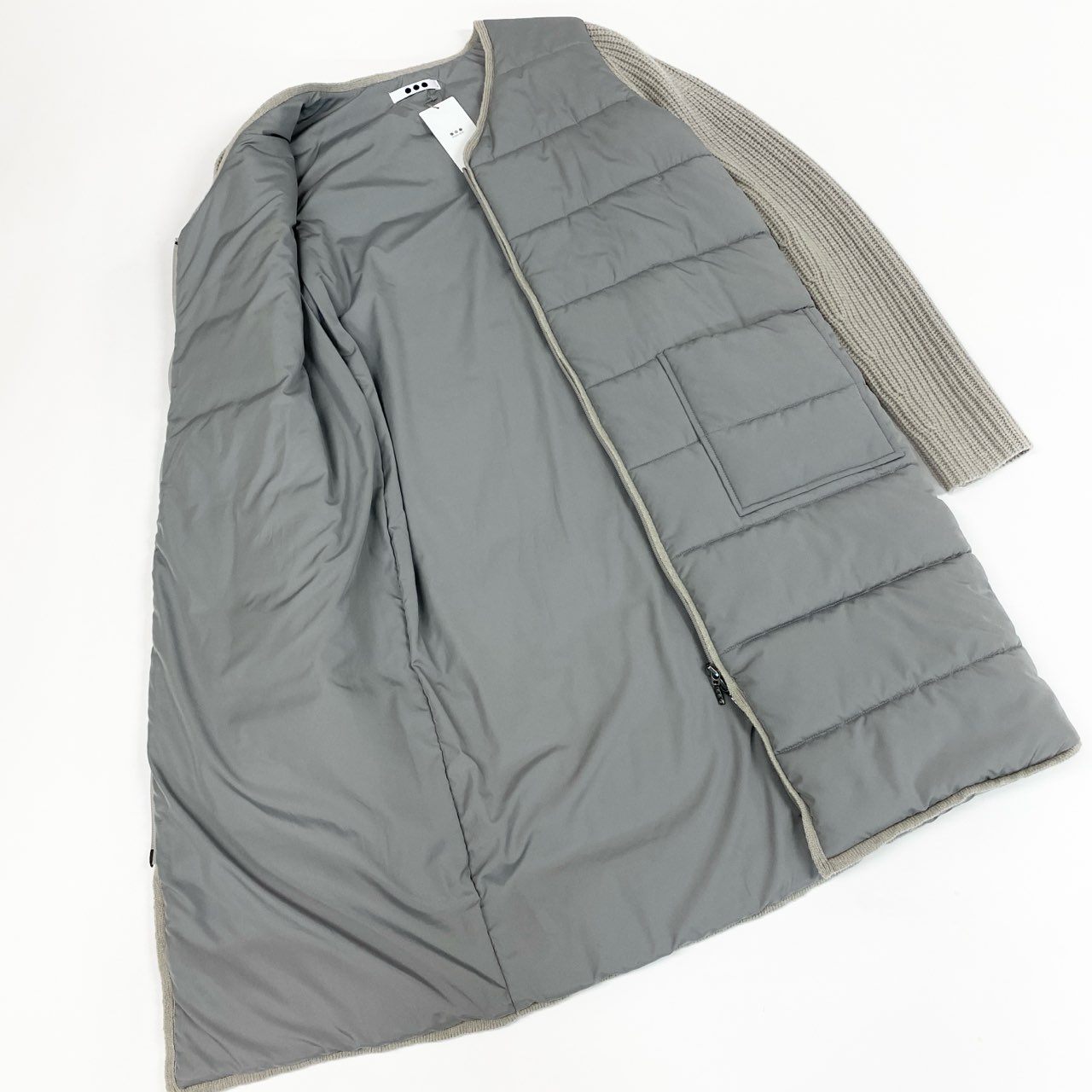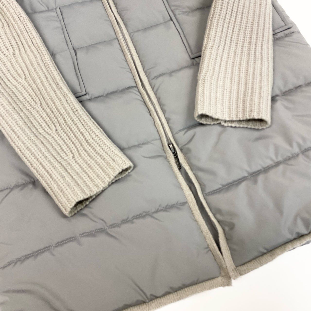 落ち着いたライトグレー系カラーが上品な、スリードッツの中綿パファーコートです。前身頃はマットなナイロン素材のキルティング、袖部分は畝感のあるニット素材を切り替えたデザインが特徴です。カシミヤ混素材ならではの柔らかさと軽さに加え、ダブルジップ仕様で着こなしの幅も広がります。デイリー使いから通勤、秋冬のお出かけまで幅広く活躍する一着です。