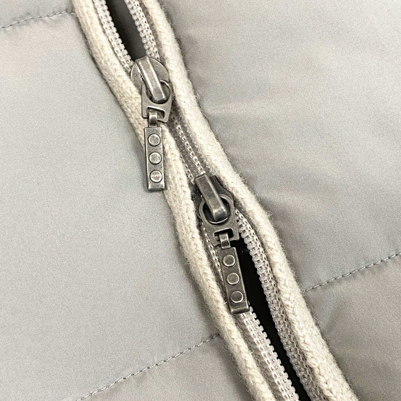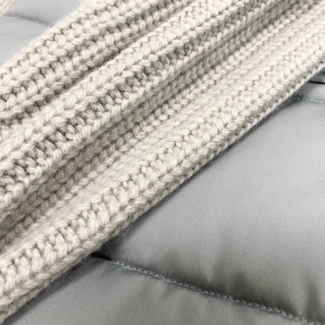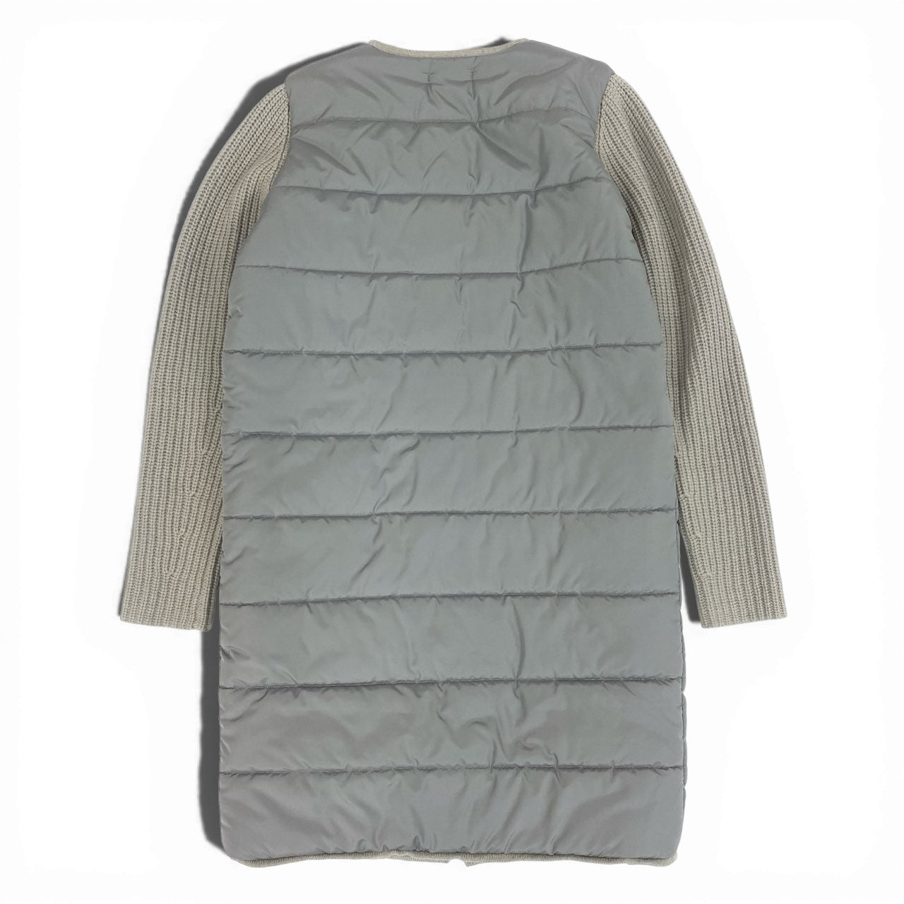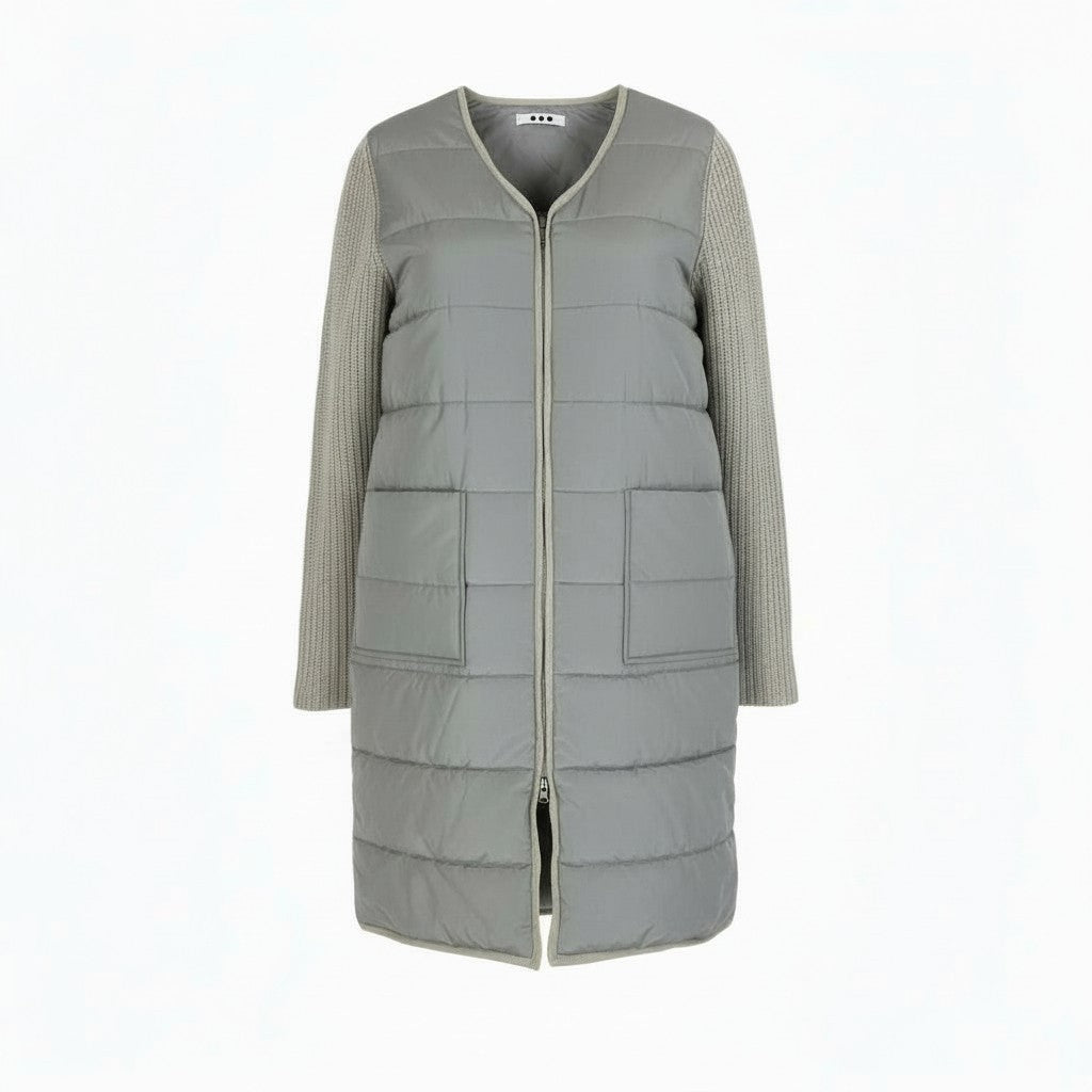 落ち着いたライトグレー系カラーが上品な、スリードッツの中綿パファーコートです。前身頃はマットなナイロン素材のキルティング、袖部分は畝感のあるニット素材を切り替えたデザインが特徴です。カシミヤ混素材ならではの柔らかさと軽さに加え、ダブルジップ仕様で着こなしの幅も広がります。デイリー使いから通勤、秋冬のお出かけまで幅広く活躍する一着です。
