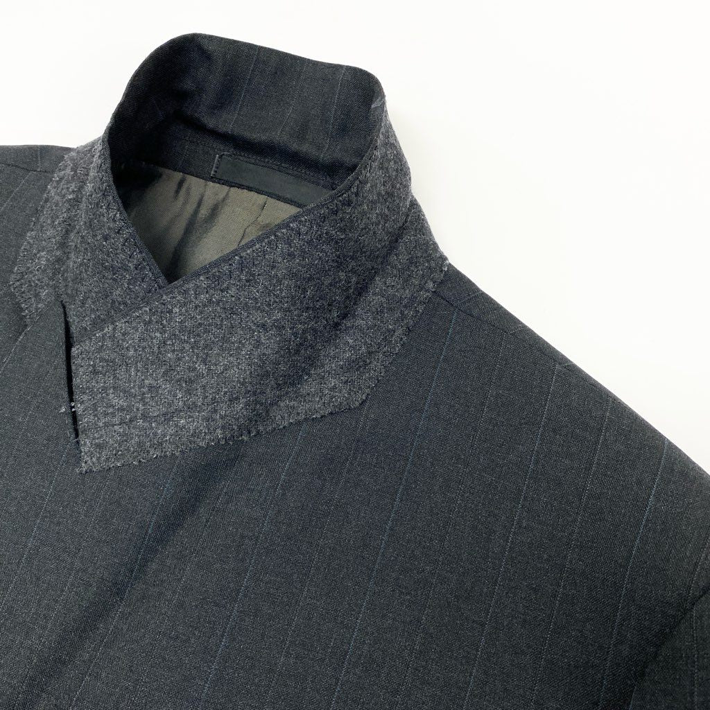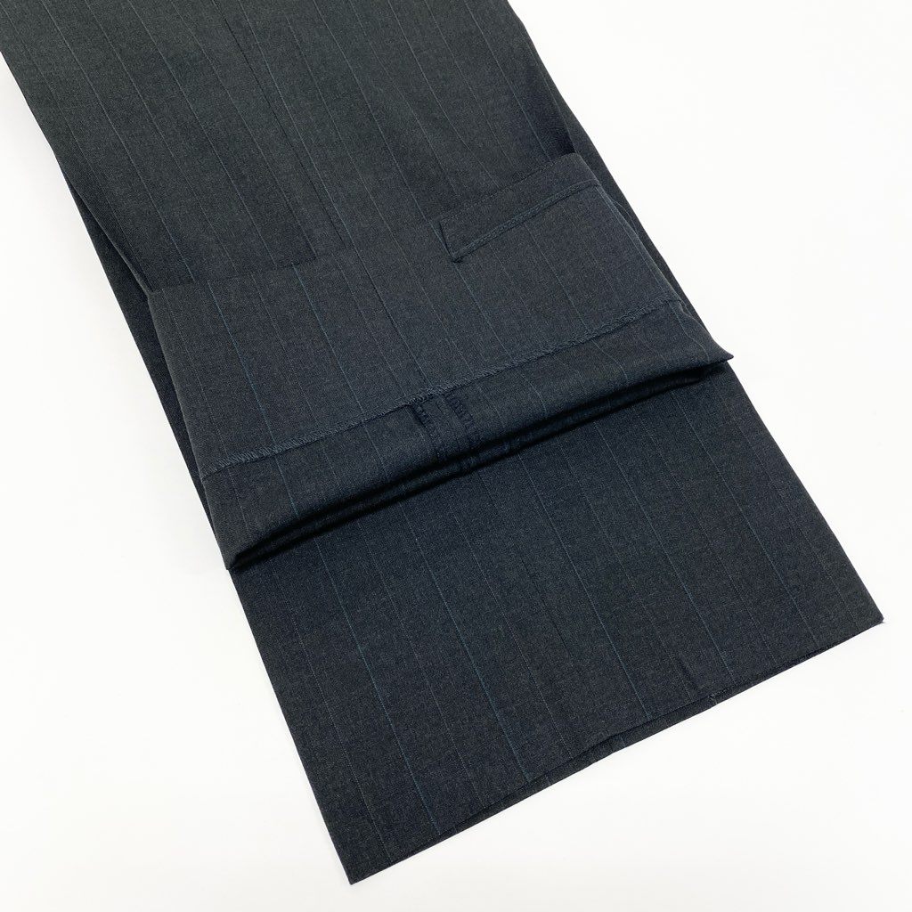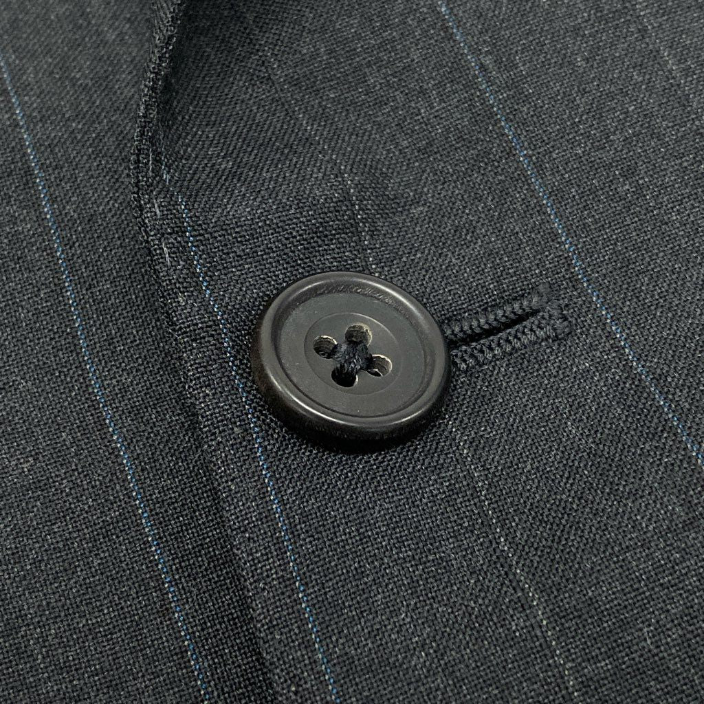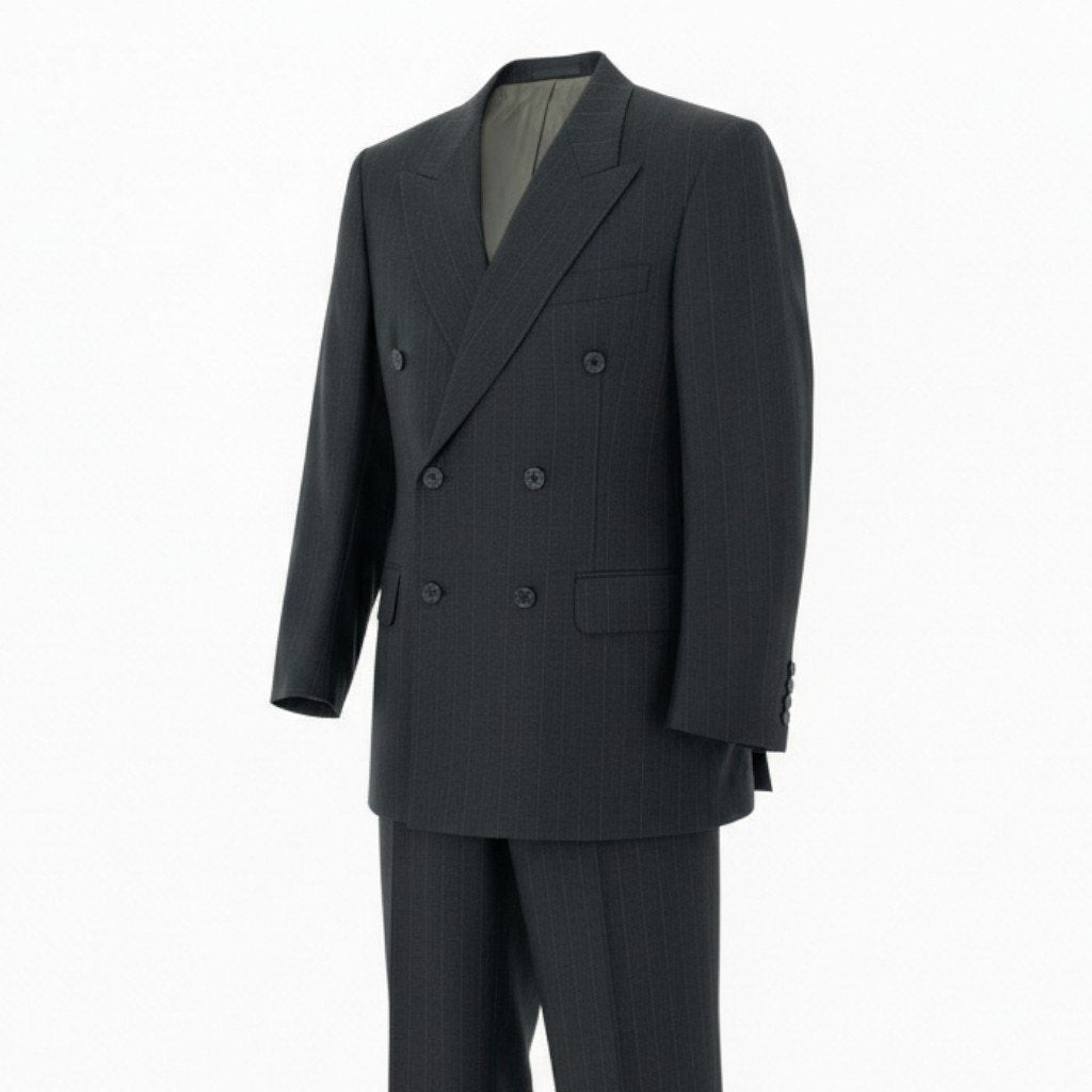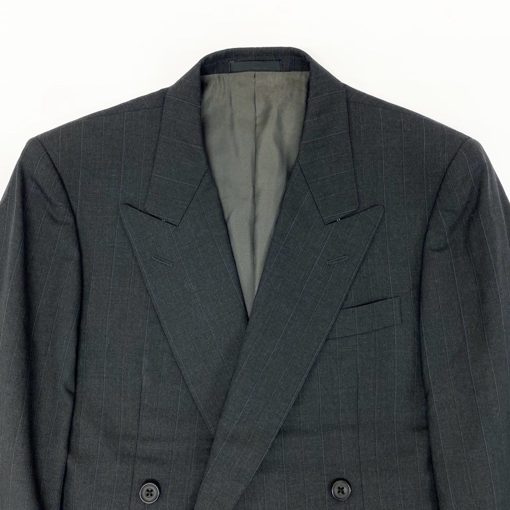 ダークグレーを基調とした上品なピンストライプ柄のスーツセットアップです。 マットな質感のウール素材で、落ち着いた印象とクラシックな雰囲気を兼ね備えています。 ダブルブレスト仕様とフラップポケットが、英国調の端正なスタイルを演出。 通勤・ビジネス・フォーマルな場面まで幅広く活躍する一着です。