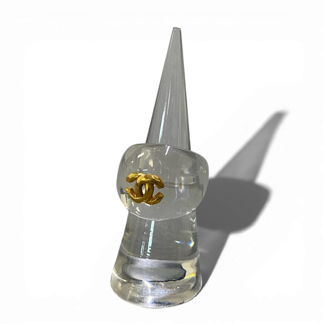 透明感のあるクリアカラー樹脂素材に、ゴールドカラーのCCココマークが映えるCHANELジュリルリングです。光沢のあるクリアボディと立体的なメタルロゴのコントラストがラグジュアリーな印象を演出します。ボリューム感のあるワイドフォルムが手元のアクセントになり、シンプルなコーディネートにも存在感をプラスします。オールシーズン着用でき、カジュアルからモードスタイルまで幅広く合わせやすいアイテムです。
