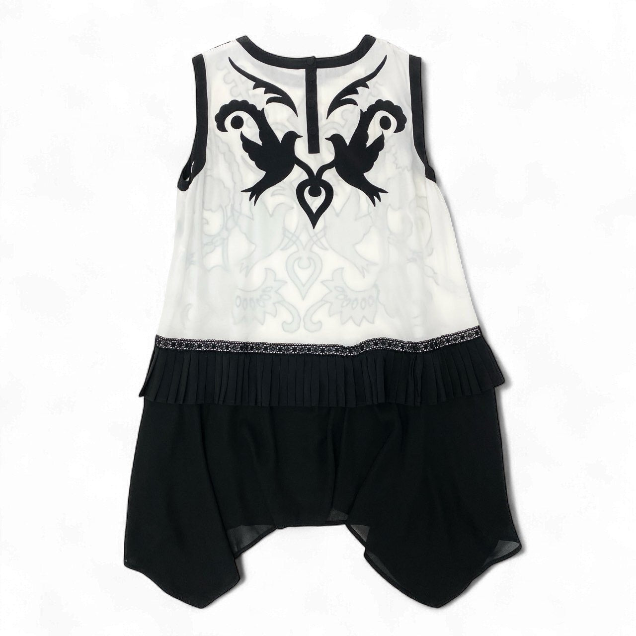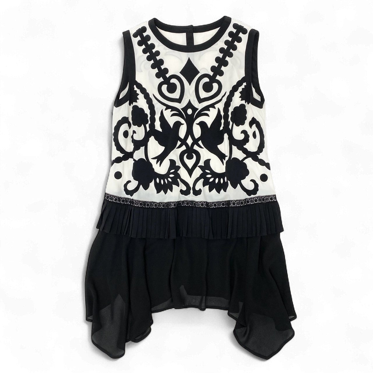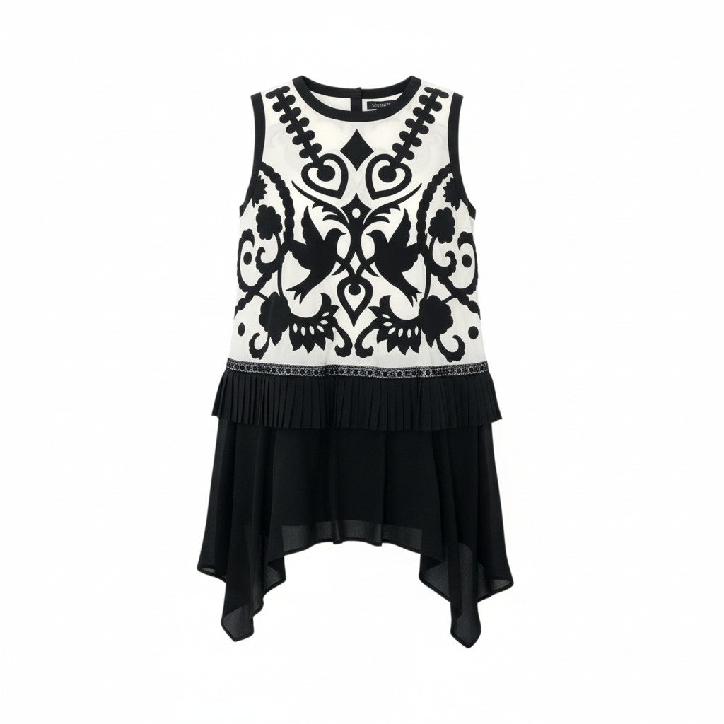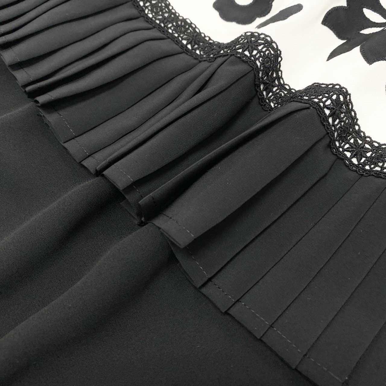 トクコプルミエヴォルらしいアート性の高いモノトーン刺繍デザインが魅力のノースリーブワンピースです。フロントには大胆なブラック刺繍を施し、視線を惹きつけるエレガントな表情に仕上がっています。ウエスト部分はプリーツ×ビジューライクな飾りテープで切り替えられ、裾には軽やかに揺れるシフォンフレアがドッキングされた華やかなデザイン。着るだけで主役になる一枚で、特別な日のお出かけやステージ衣装風の装いにも最適です。モノトーンのため派手すぎず、大人の女性にも取り入れやすい一着です。