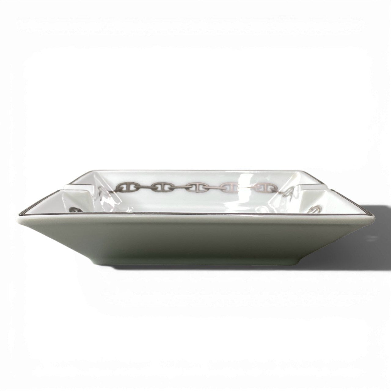 ホワイトカラーの陶器に、HERMESを象徴するシェーヌダンクルモチーフを縁にデザインしたHermes Parisのアッシュトレイです。 艶のある上質な陶器素材に、落ち着いたメタルカラーのチェーン柄が上品なアクセントになっています。 中央にはブランドを象徴するロゴモチーフがさりげなく配置され、洗練されたラグジュアリー感を演出します。 灰皿としてはもちろん、小物トレーやインテリアオブジェとしても楽しめるエルメスらしいエレガントなアイテムです。